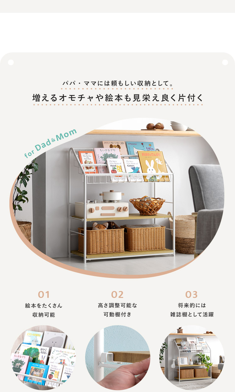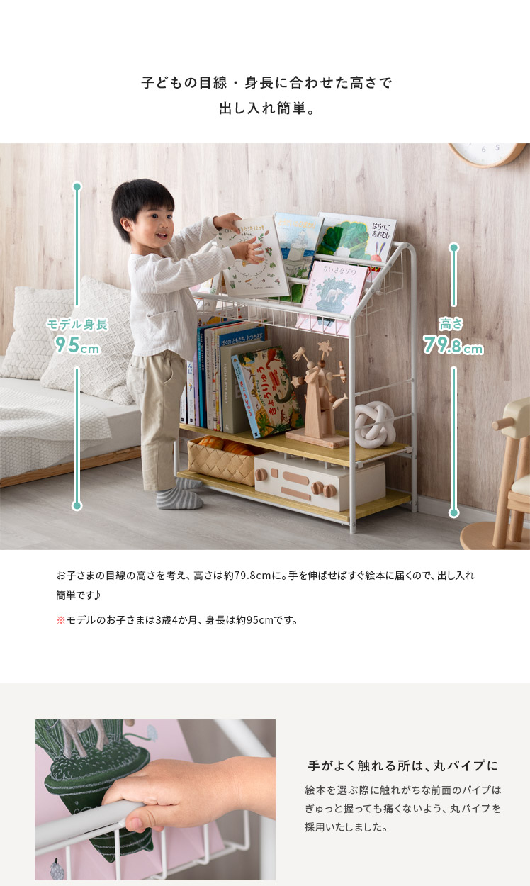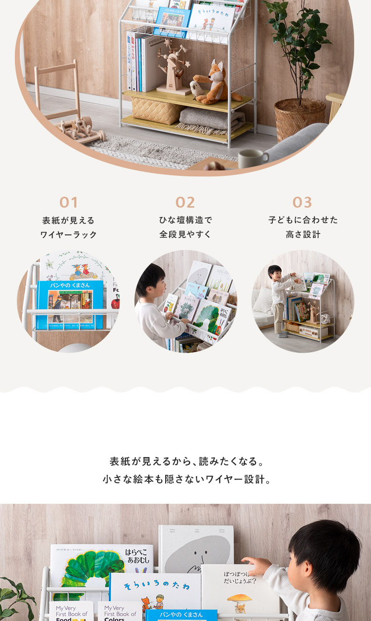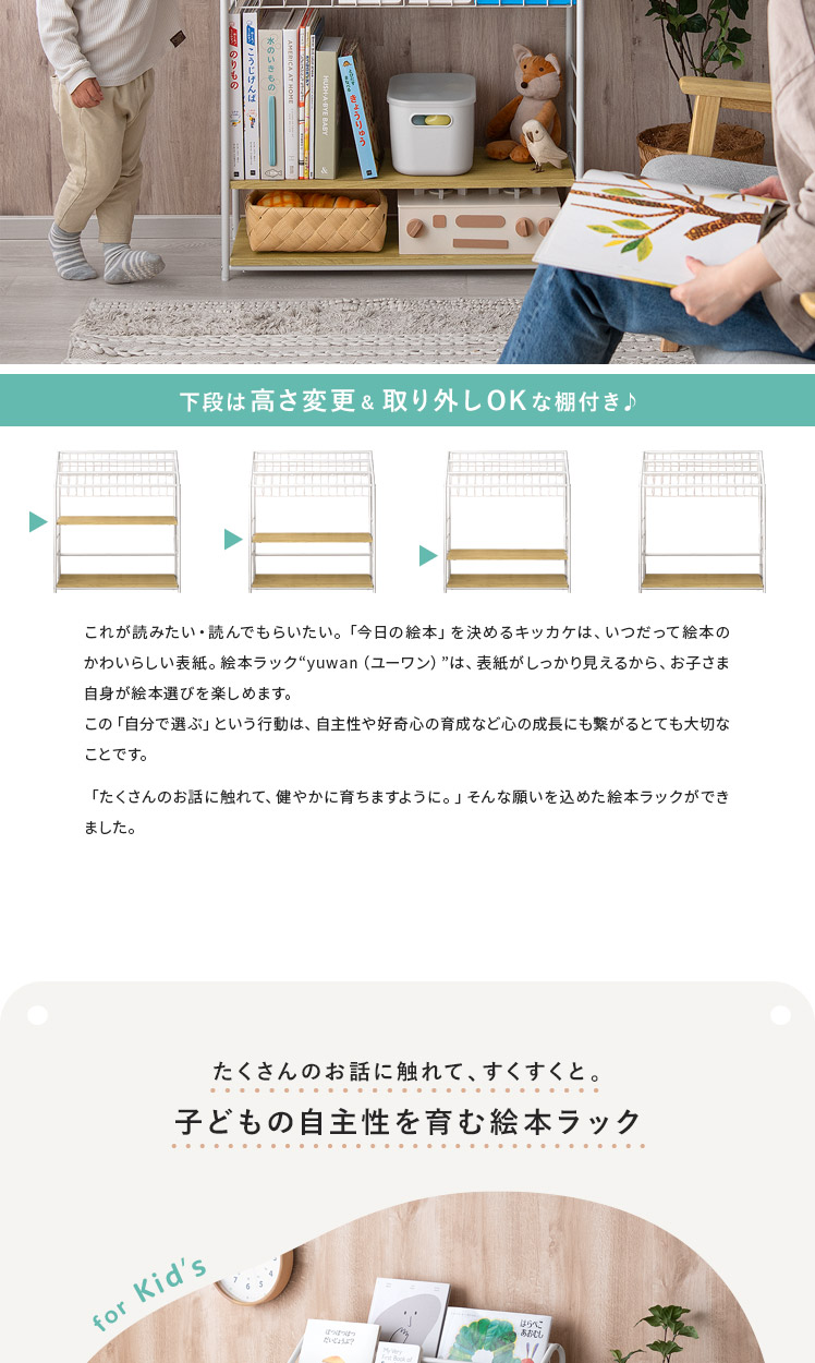 表紙がしっかり見える絵本ラック yuwan〔ユーワン〕/これが読みたい・読んでもらいたい。「今日の絵本」を決めるキッカケは、いつだって絵本のかわいらしい表紙。絵本ラック“yuwan(ユーワン)”は、表紙がしっかり見えるから、お子さま自身が絵本選びを楽しめます。この「自分で選ぶ」という行動は、自主性や好奇心の育成など心の成長にも繋がるとても大切なことです。「たくさんのお話に触れて、健やかに育ちますように。」そんな願いを込めた絵本ラックができました。