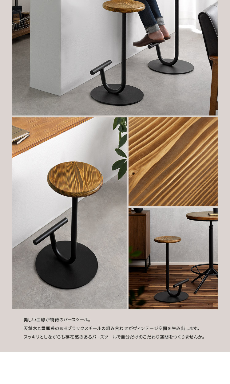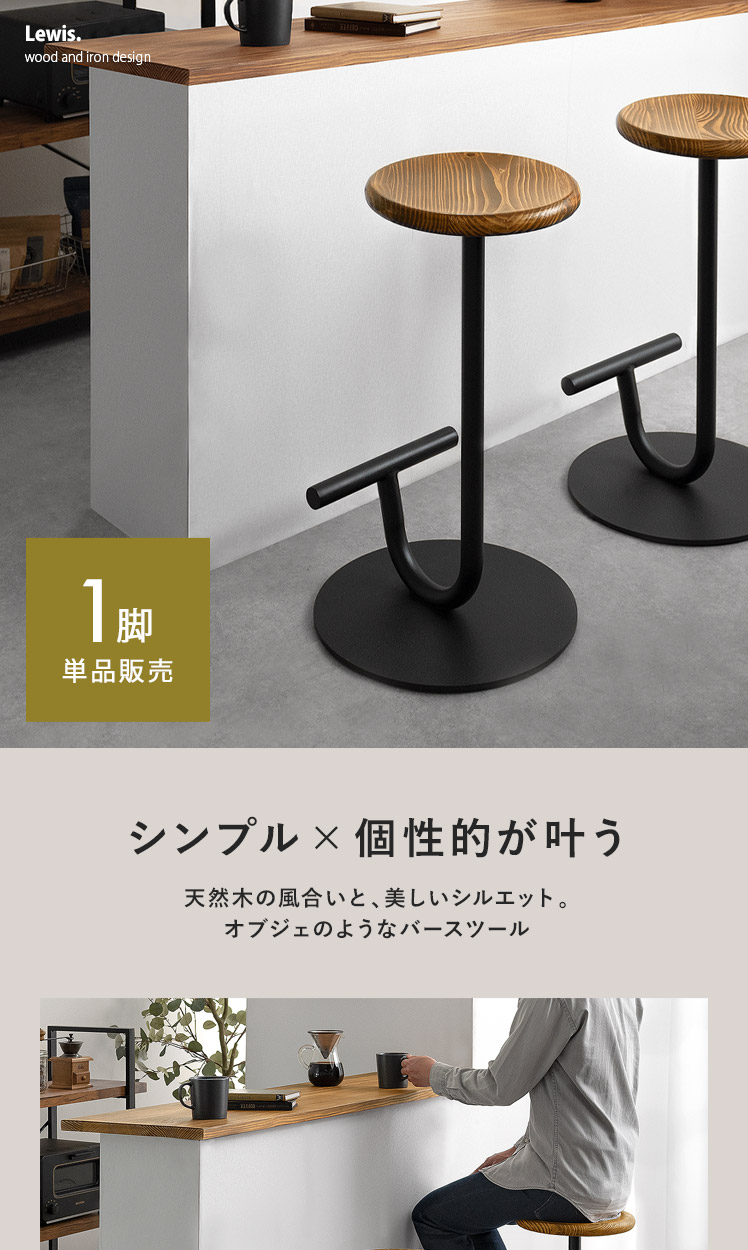 ヴィンテージウッドバースツール Lewis 〔ルイス〕 1脚単体販売/美しい曲線が特徴のバースツール。天然木と重厚感のあるブラックスチールの組み合わせがヴィンテージ空間を生み出します。スッキリとしながらも存在感のあるバースツールで自分だけのこだわり空間をつくりませんか。