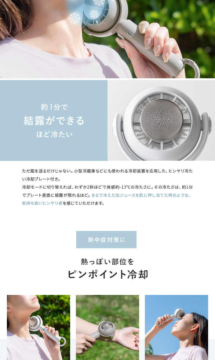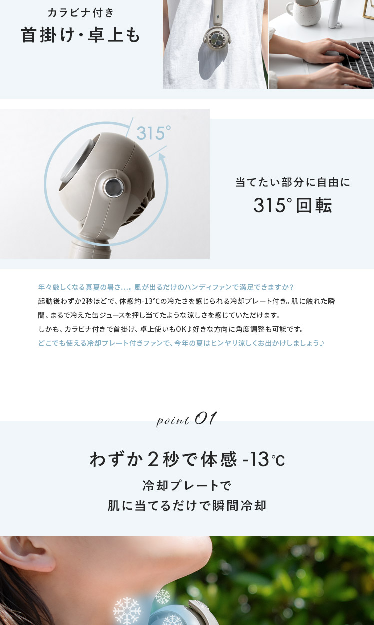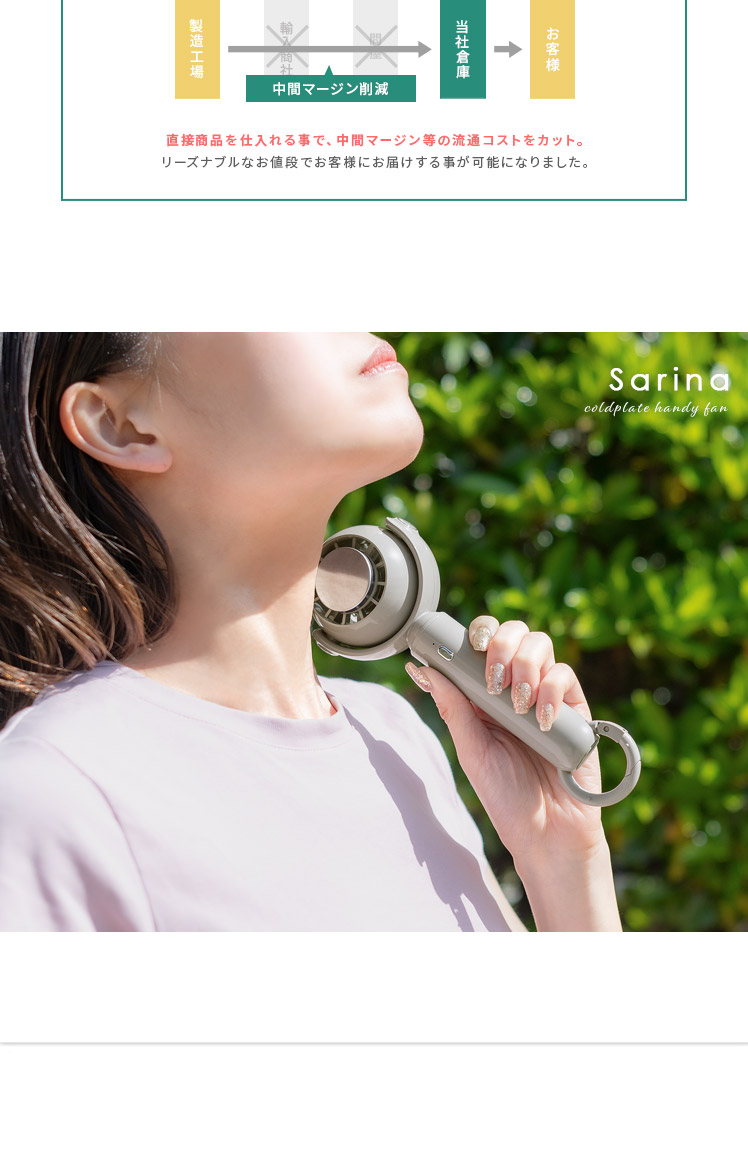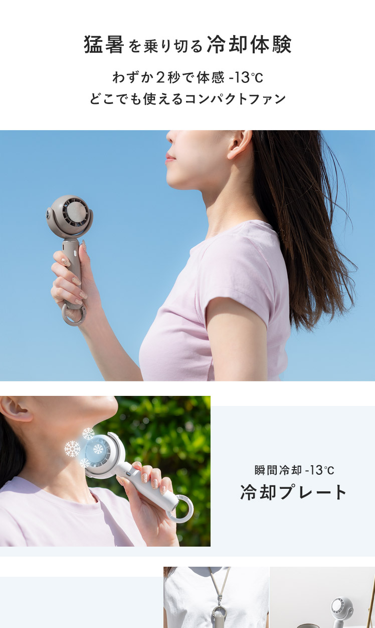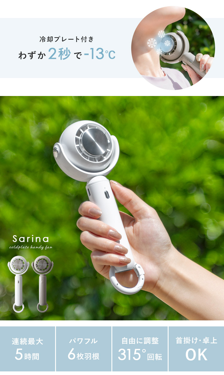 冷却プレート付きハンディファン Sarina〔サリナ〕/年々厳しくなる真夏の暑さ・・・。風が出るだけのハンディファンで満足できますか?起動後わずか2秒ほどで、体感約-13度の冷たさを感じられる冷却プレート付き。肌に触れた瞬間、まるで冷えた缶ジュースを押し当てたような涼しさを感じていただけます。しかも、カラビナ付きで首掛け、卓上使いもOK♪好きな方向に角度調整も可能です。どこでも使える冷却プレート付きファンで、今年の夏はヒンヤリ涼しくお出かけしましょう♪