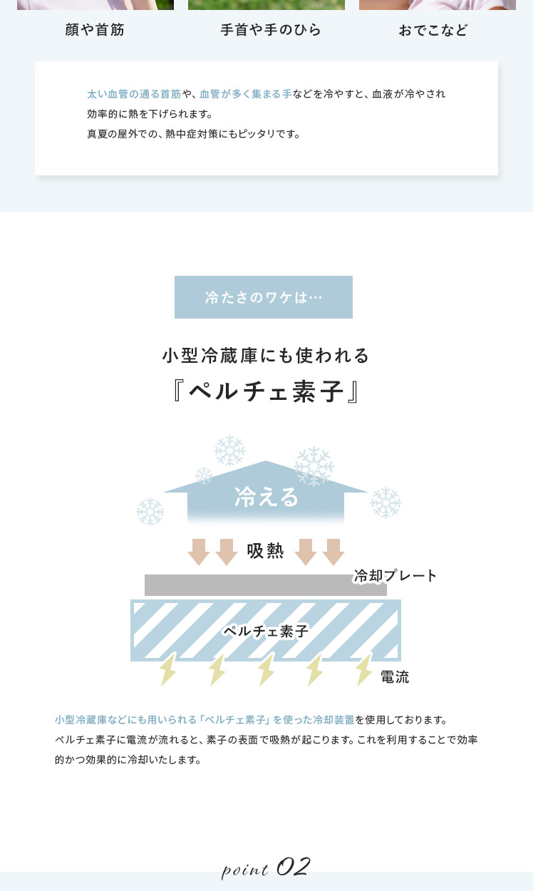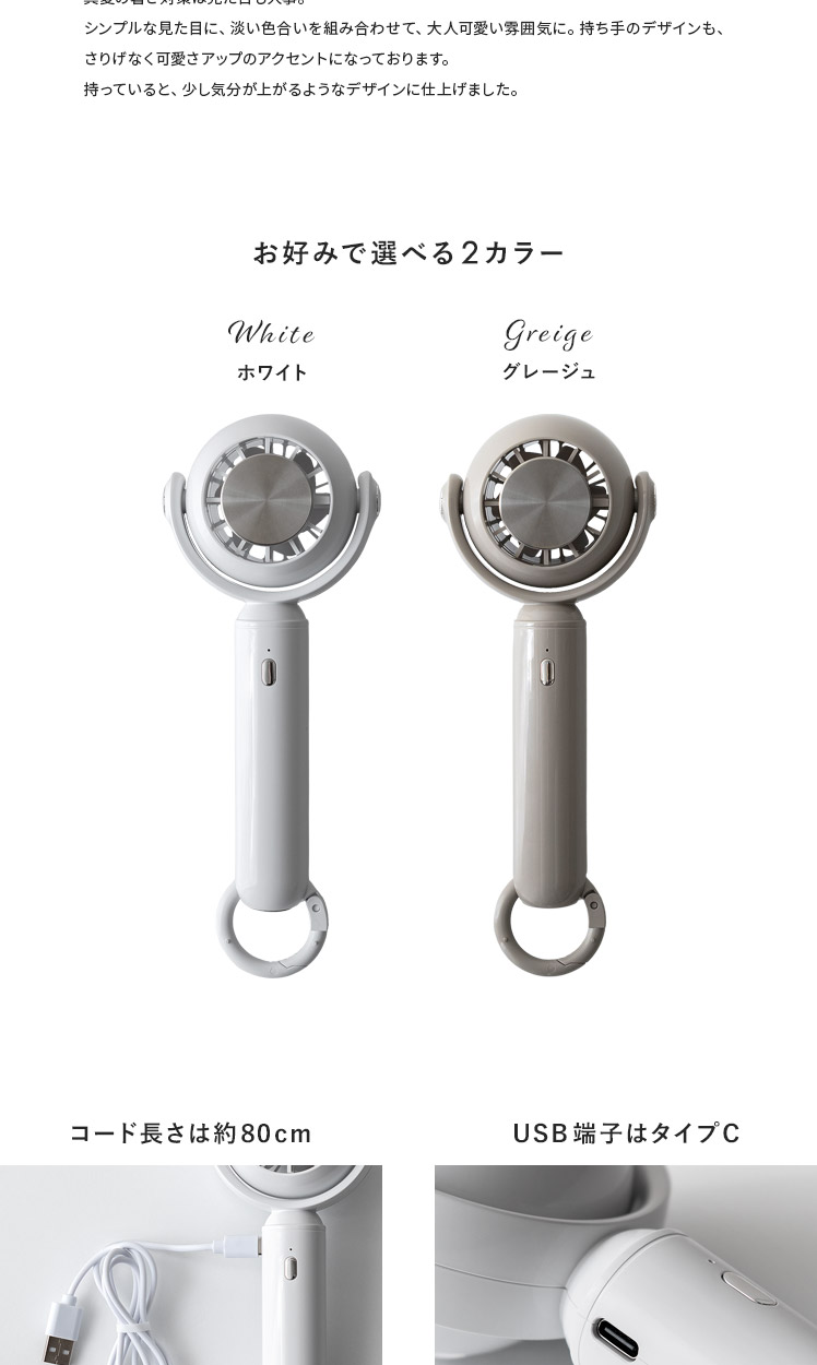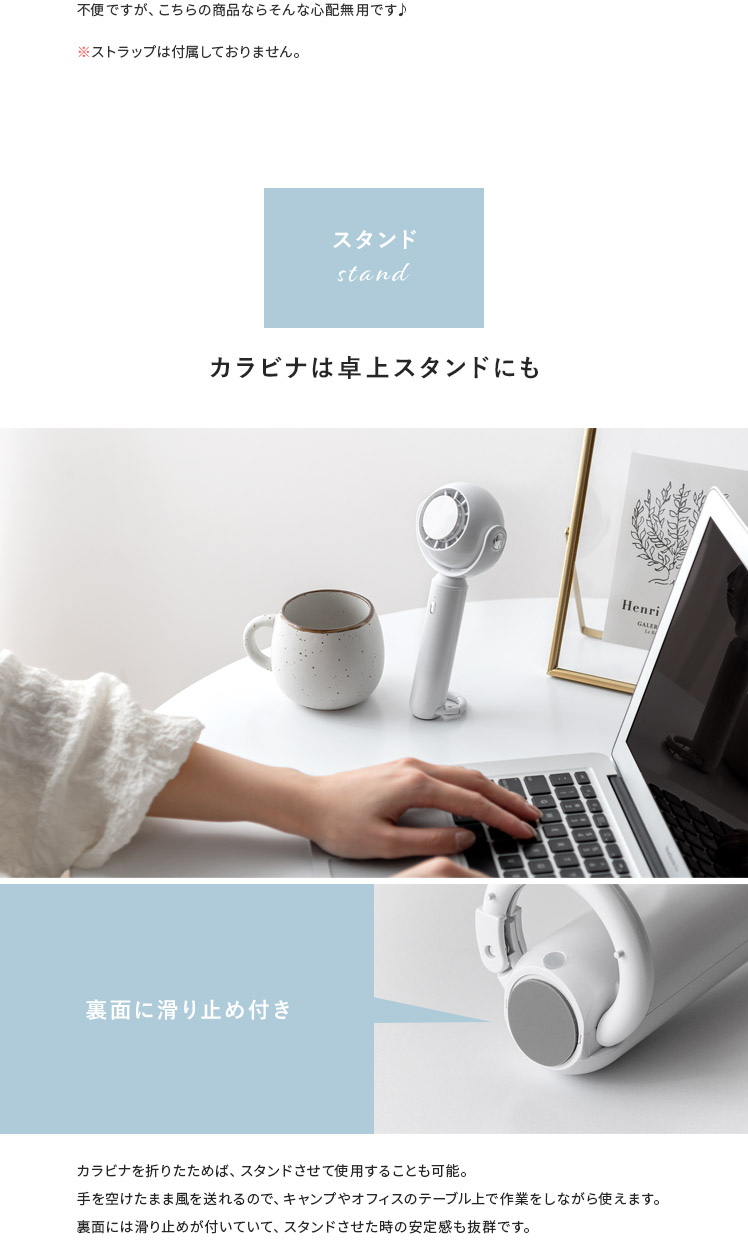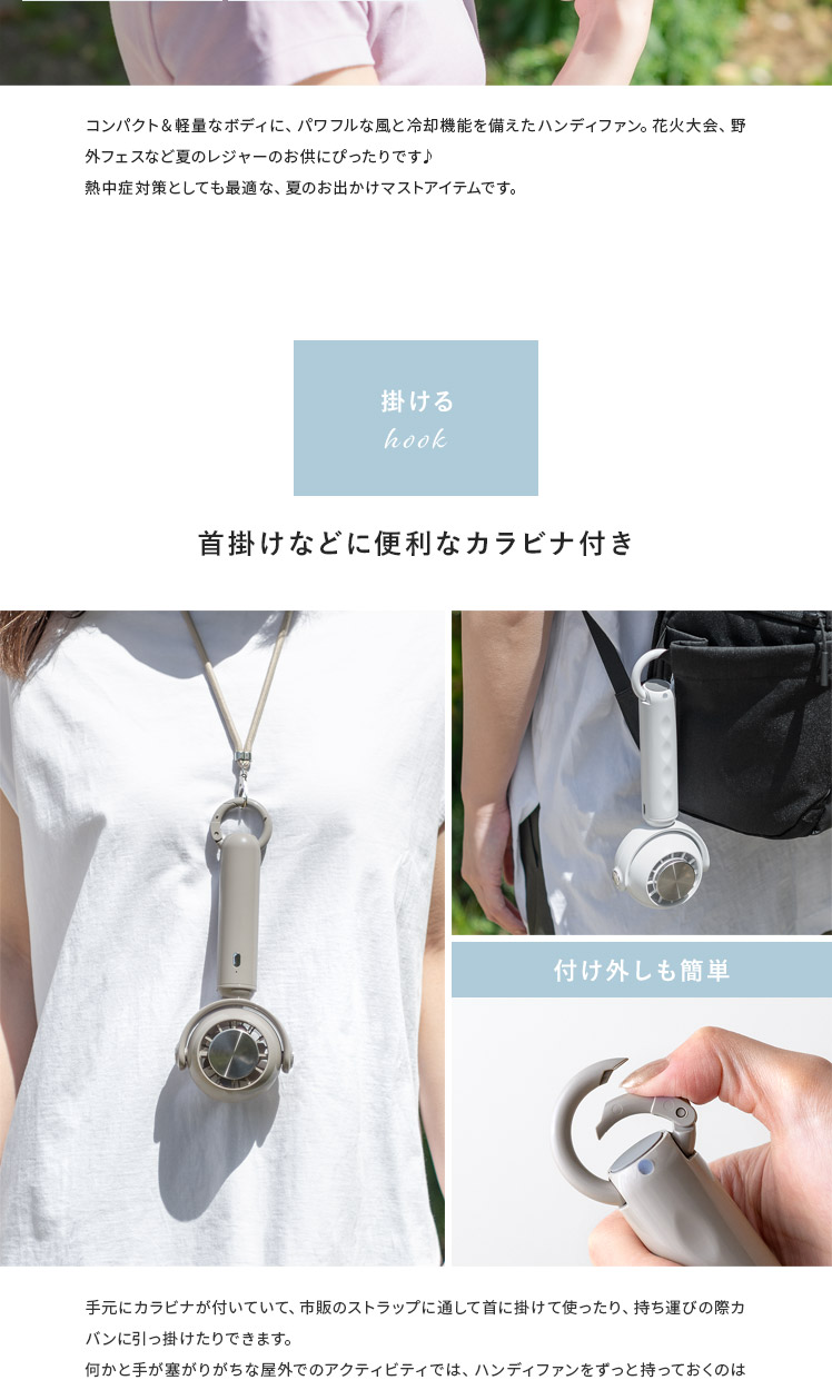 冷却プレート付きハンディファン Sarina〔サリナ〕/年々厳しくなる真夏の暑さ・・・。風が出るだけのハンディファンで満足できますか?起動後わずか2秒ほどで、体感約-13度の冷たさを感じられる冷却プレート付き。肌に触れた瞬間、まるで冷えた缶ジュースを押し当てたような涼しさを感じていただけます。しかも、カラビナ付きで首掛け、卓上使いもOK♪好きな方向に角度調整も可能です。どこでも使える冷却プレート付きファンで、今年の夏はヒンヤリ涼しくお出かけしましょう♪