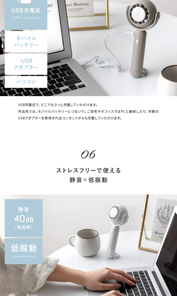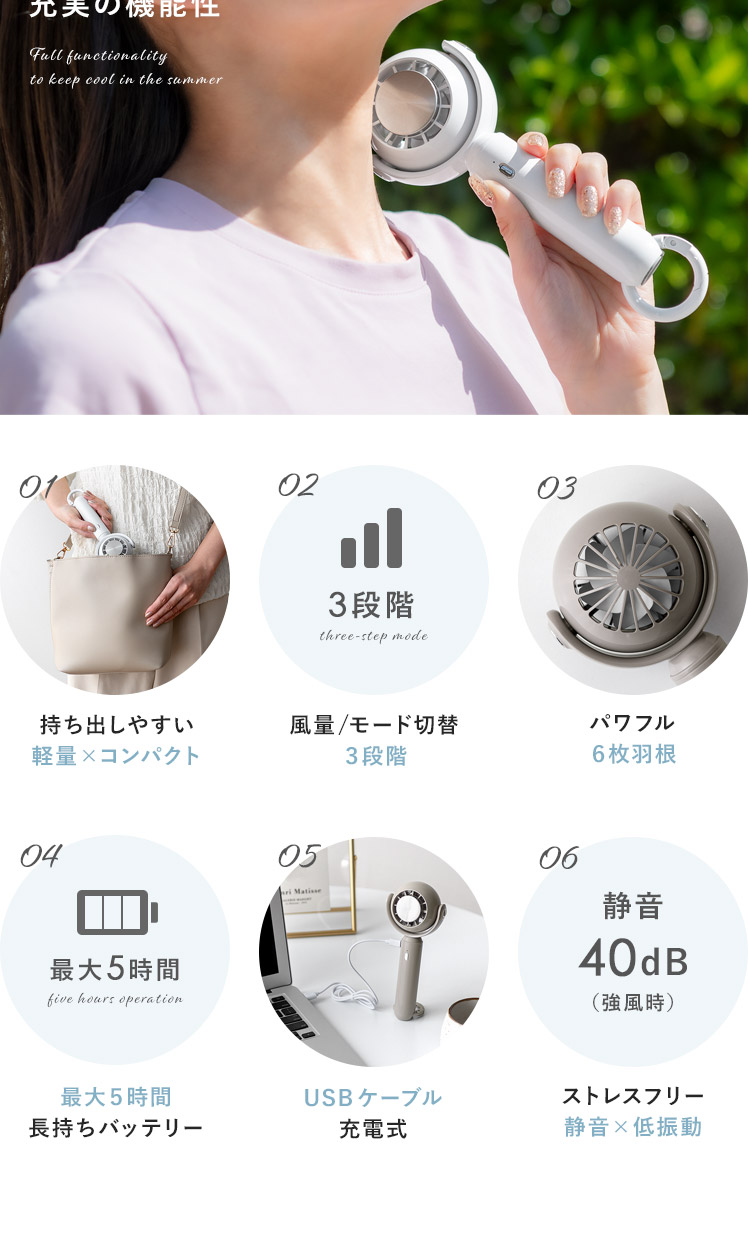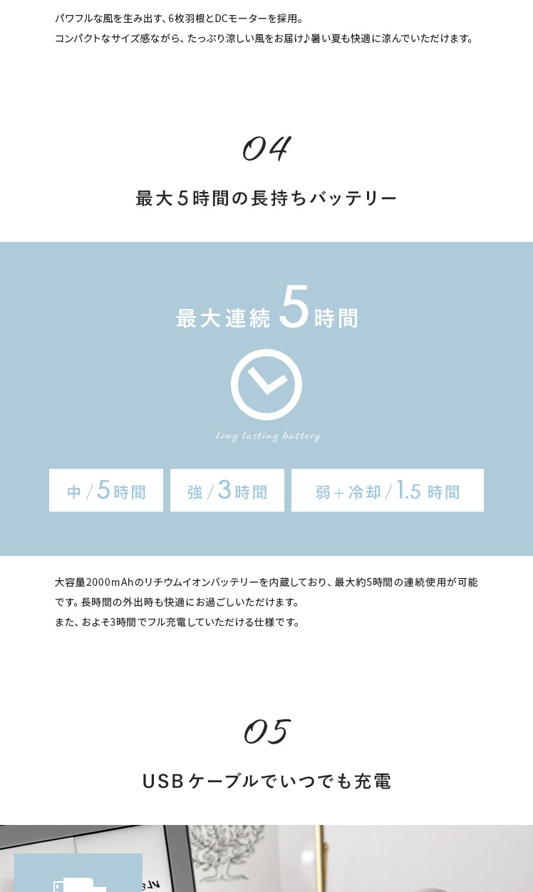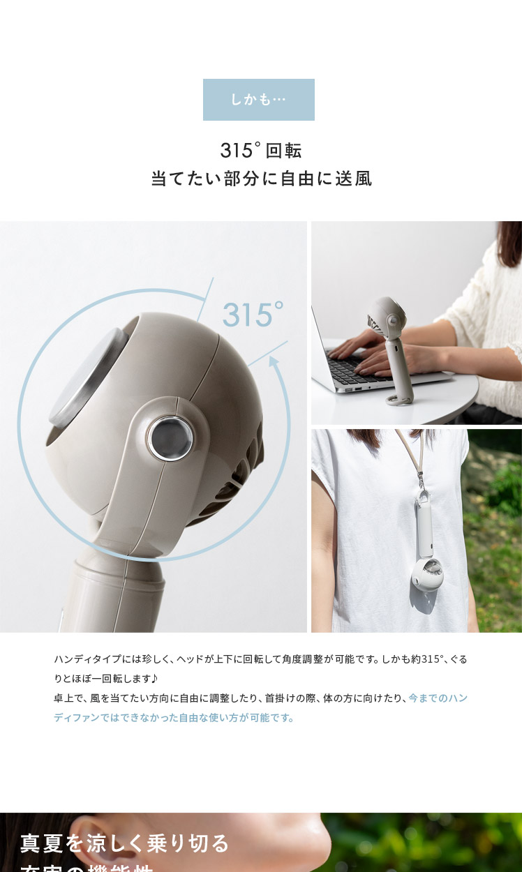 首掛け 卓上 315度回転 6枚羽根 USB充電 3段階風量 静音