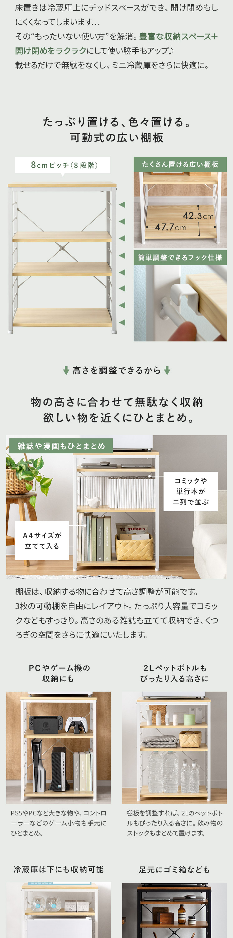 ミニ冷蔵庫ラック LEAFLE〔リーフル〕/ミニ冷蔵庫を床に置いて、“もったいない使い方”をしていませんか?床置きは冷蔵庫上にデッドスペースができ、開け閉めもしにくくなってしまいます...その“もったいない使い方”を解消。豊富な収納スペース+開け閉めをラクラクにして使い勝手もアップ♪載せるだけで無駄をなくし、ミニ冷蔵庫をさらに快適に。