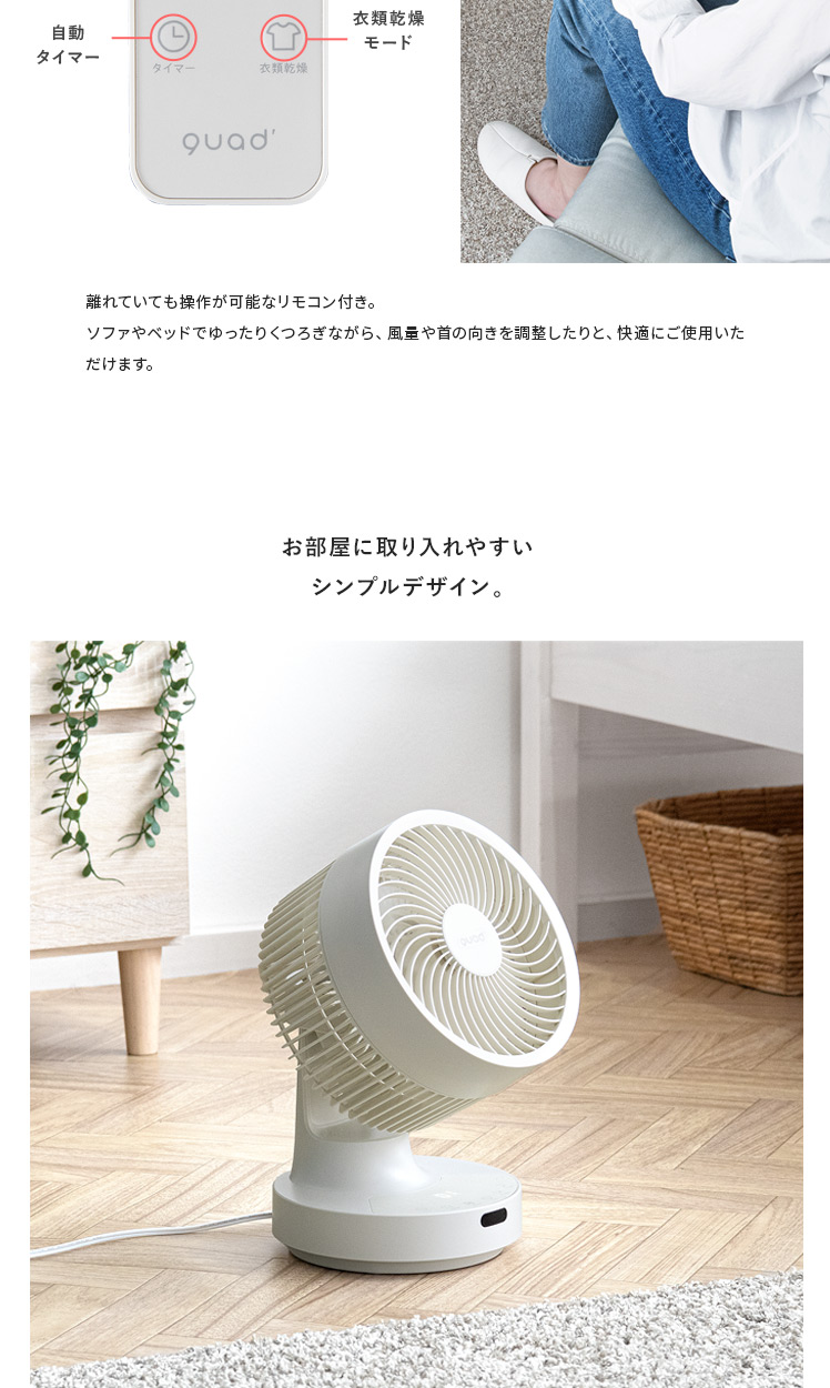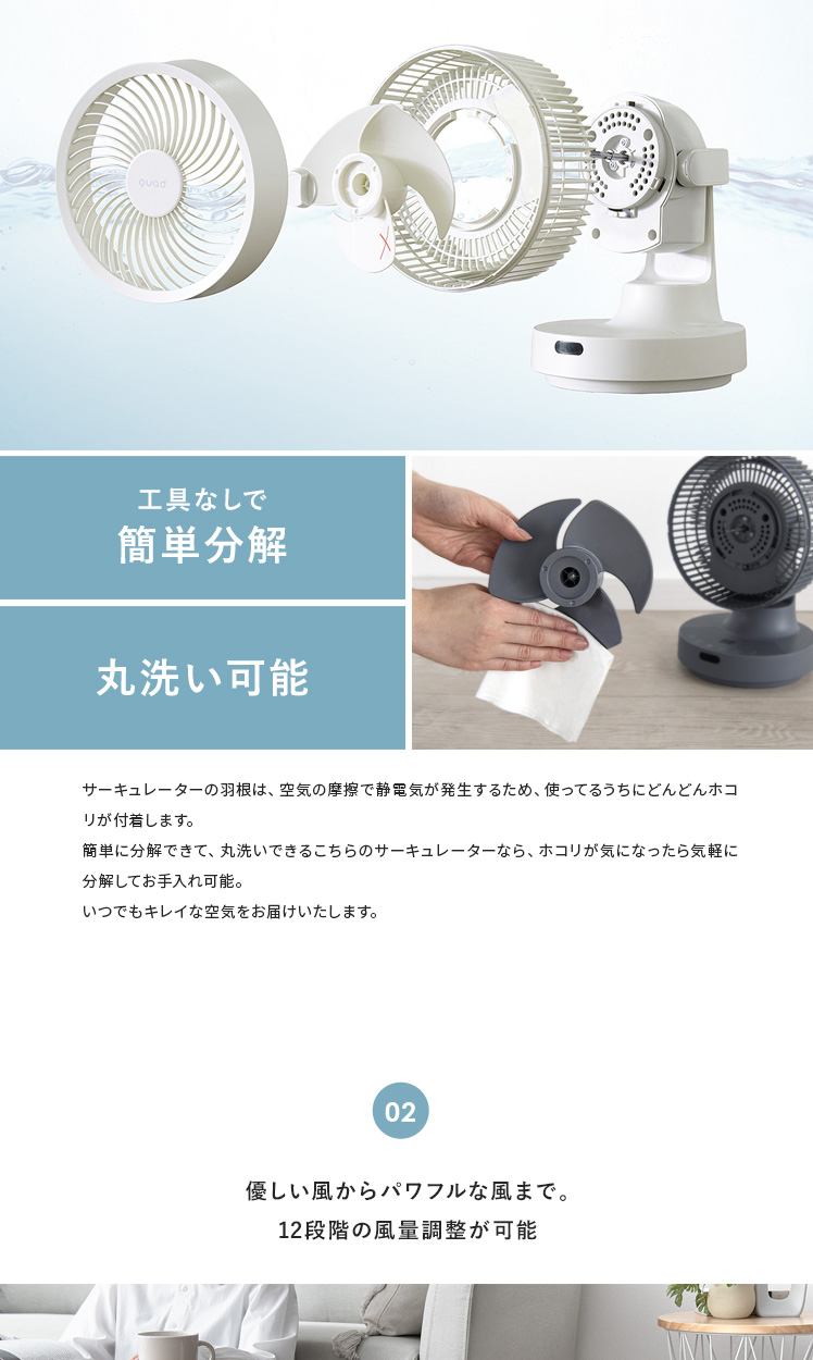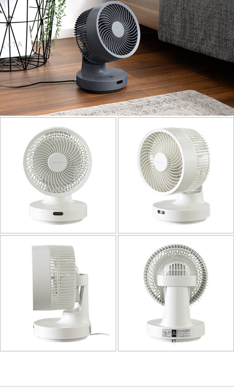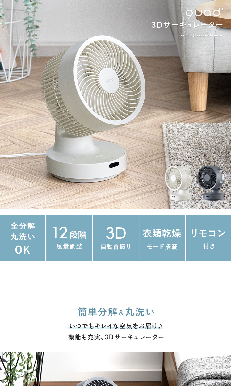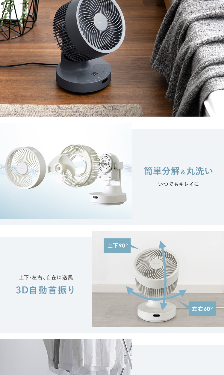 quad'〔クワッズ〕3Dサーキュレーター/簡単分解でサッと丸洗い可能な3Dサーキュレーター。ラクラクお掃除できるので常にキレイな状態を保てます。立体的な首振りで、欲しい所に風を送ることができ、広い部屋でも隅々まで涼しい風をお届け。さらに、自動首振り機能、タイマー機能、衣類乾燥モードなど機能性も充実♪いつでも新鮮な空気をお届けできる高性能サーキュレーターで心地の良い快適空間を。