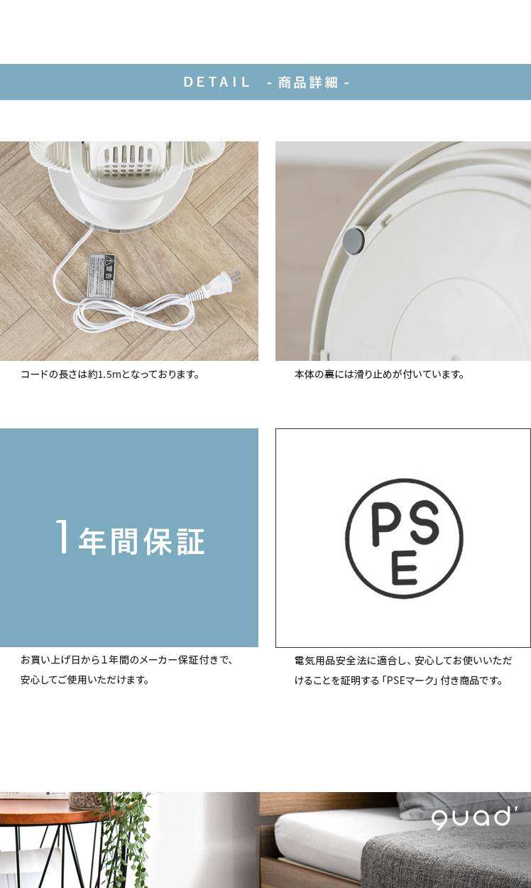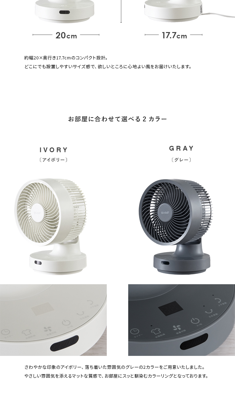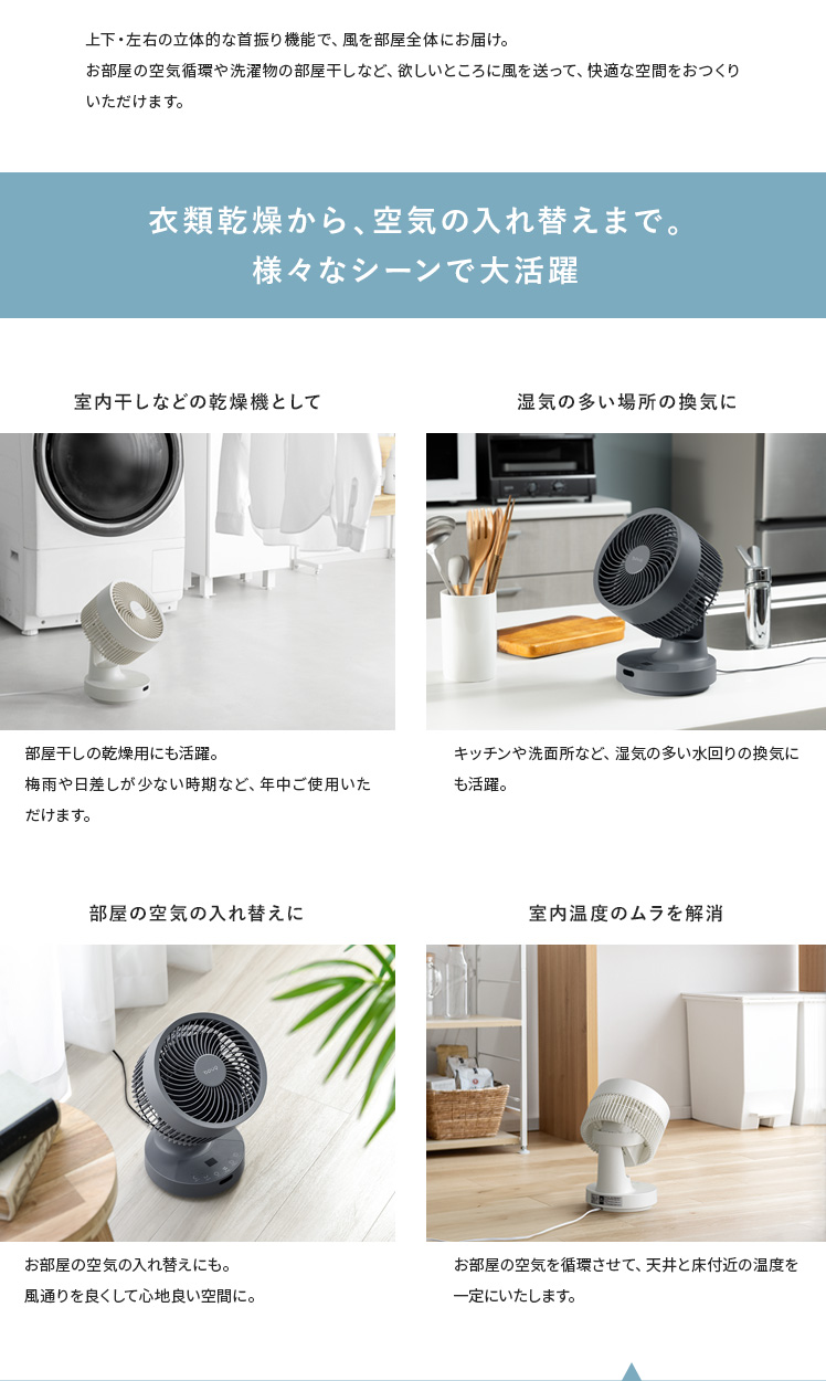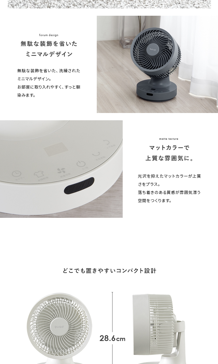 quad'〔クワッズ〕3Dサーキュレーター/簡単分解でサッと丸洗い可能な3Dサーキュレーター。ラクラクお掃除できるので常にキレイな状態を保てます。立体的な首振りで、欲しい所に風を送ることができ、広い部屋でも隅々まで涼しい風をお届け。さらに、自動首振り機能、タイマー機能、衣類乾燥モードなど機能性も充実♪いつでも新鮮な空気をお届けできる高性能サーキュレーターで心地の良い快適空間を。