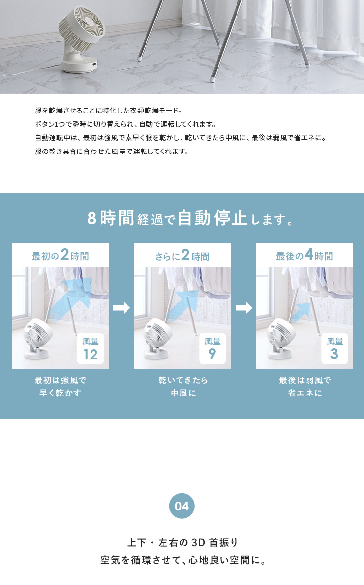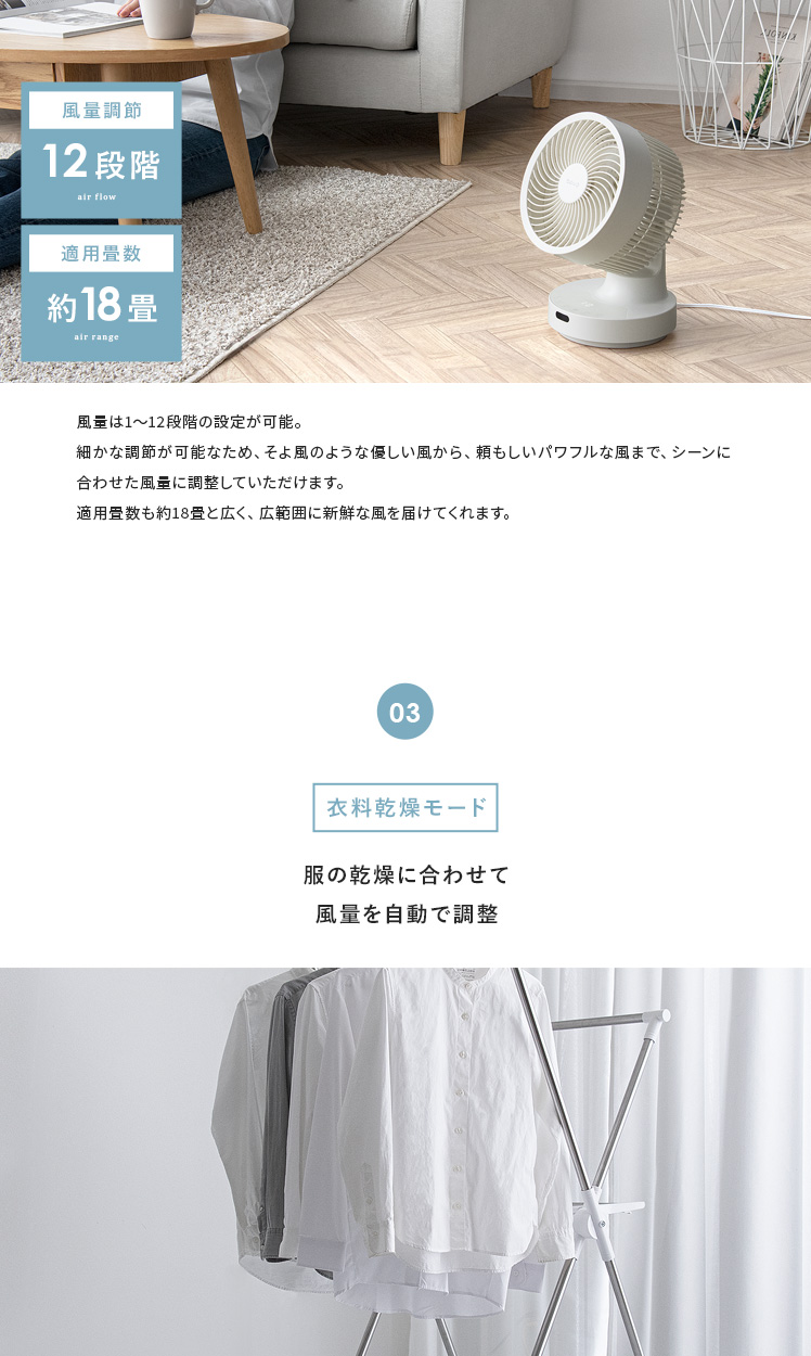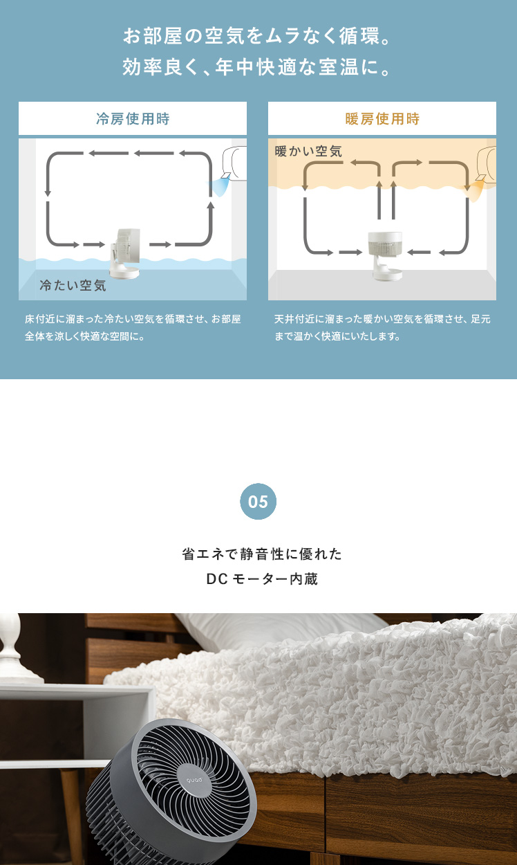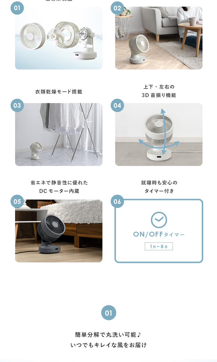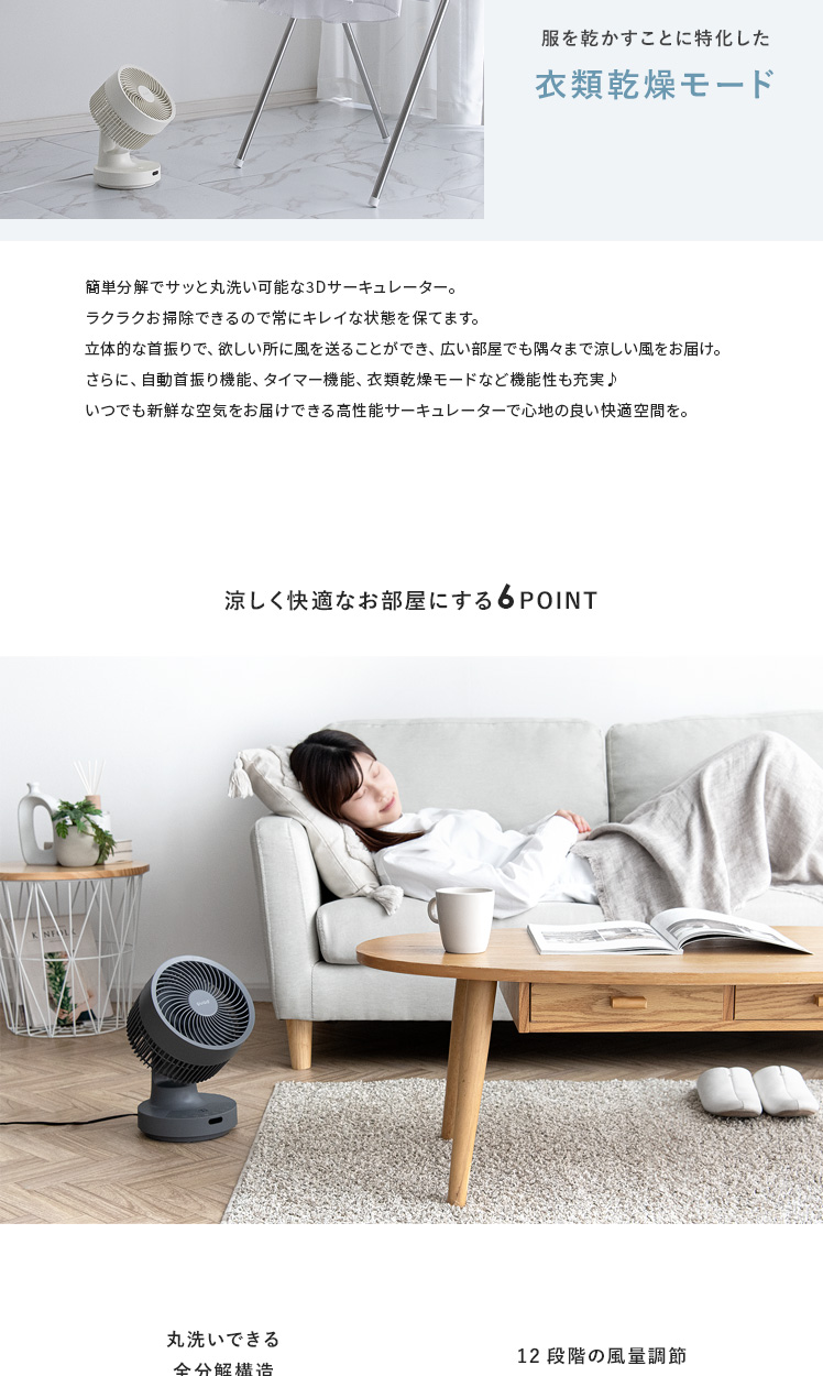 quad'〔クワッズ〕3Dサーキュレーター/簡単分解でサッと丸洗い可能な3Dサーキュレーター。ラクラクお掃除できるので常にキレイな状態を保てます。立体的な首振りで、欲しい所に風を送ることができ、広い部屋でも隅々まで涼しい風をお届け。さらに、自動首振り機能、タイマー機能、衣類乾燥モードなど機能性も充実♪いつでも新鮮な空気をお届けできる高性能サーキュレーターで心地の良い快適空間を。