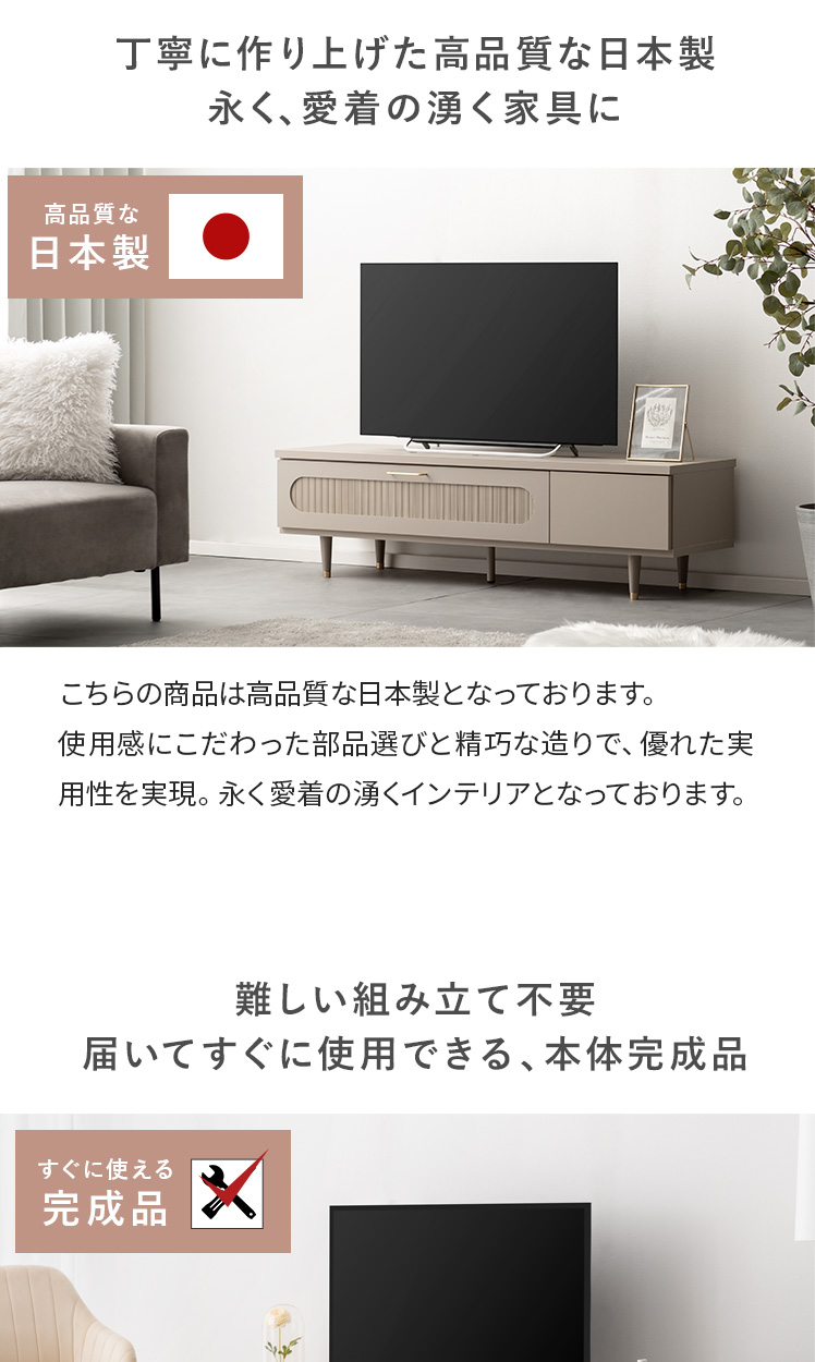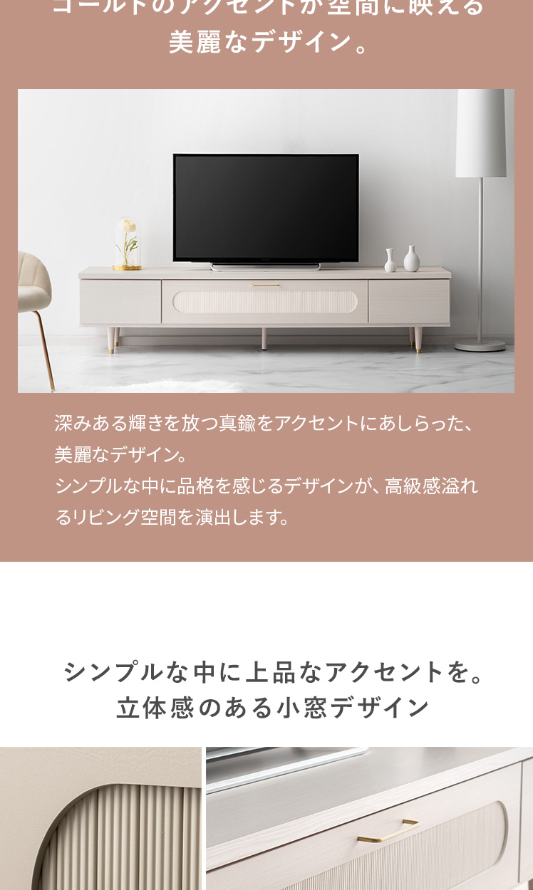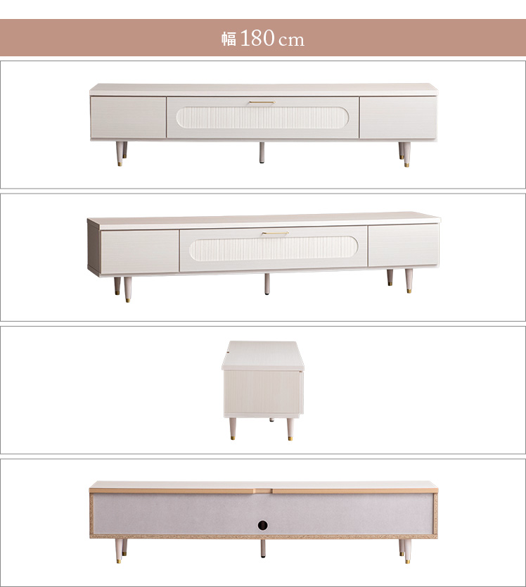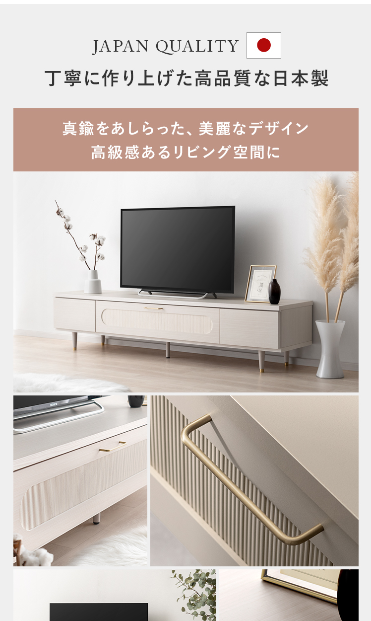日本製完成品 テレビボード Teena〔ティーナ〕 幅180cmタイプ/丁寧に作り上げた高品質な日本製テレビボード"Teens(ティーナ)”真鍮をあしらった美麗なデザインが、高級感あるリビング空間を演出。使い心地にもこだわり、フルオープン仕様の引き出し収納や、ゆっくりと開閉するソフトダウンステーを採用しました。“日本製&高品質”が叶える優れたデザインと使い心地のテレビボードで、上質なリビング空間をご自宅に。