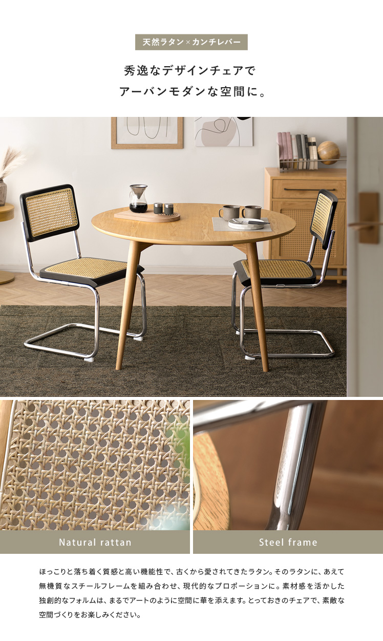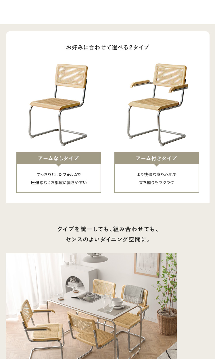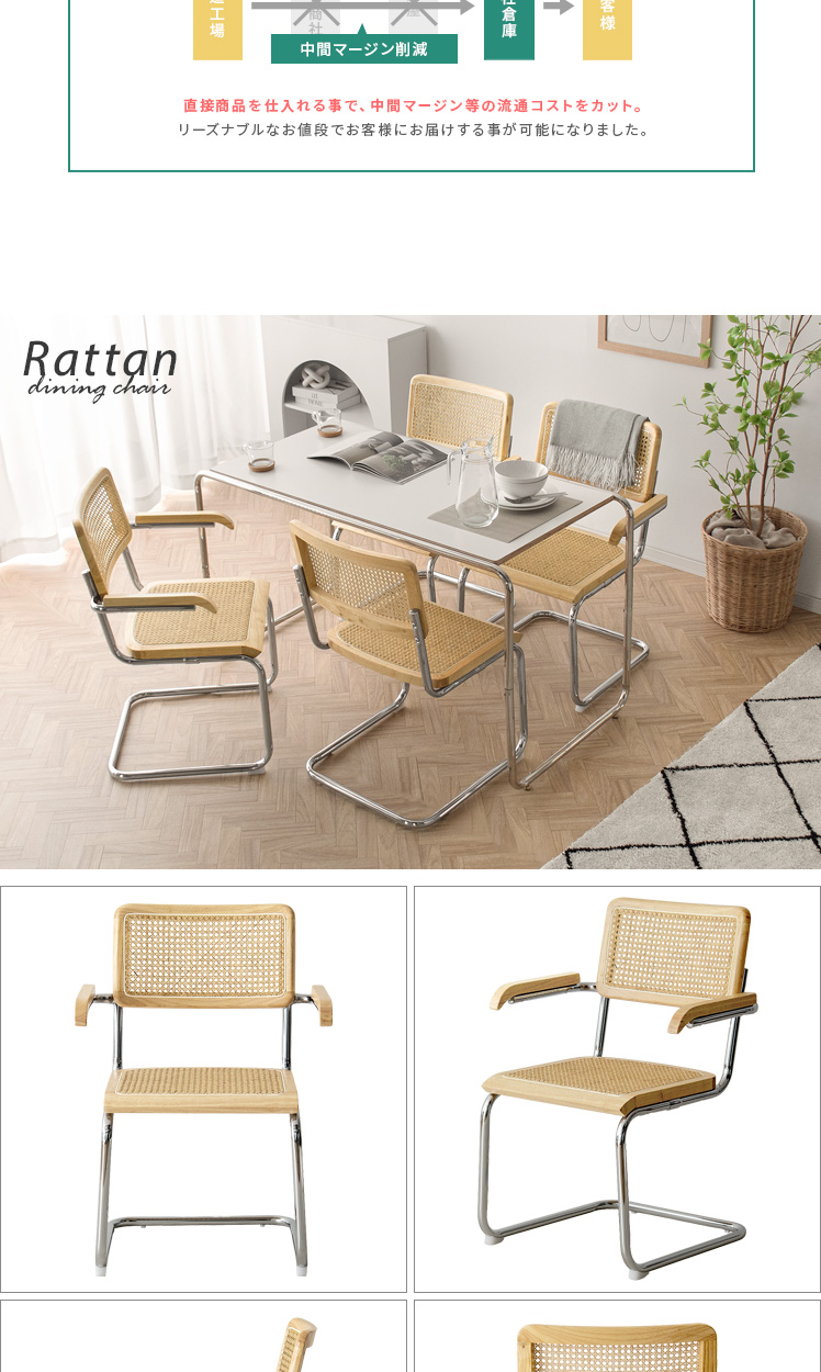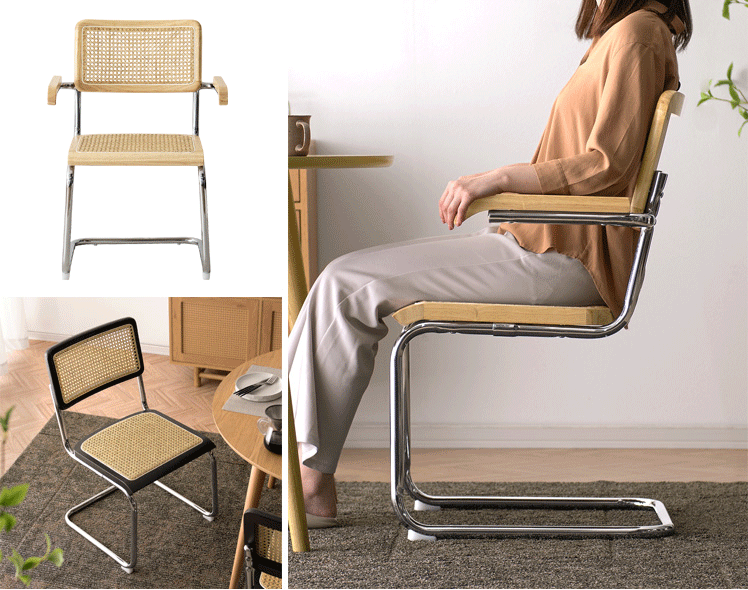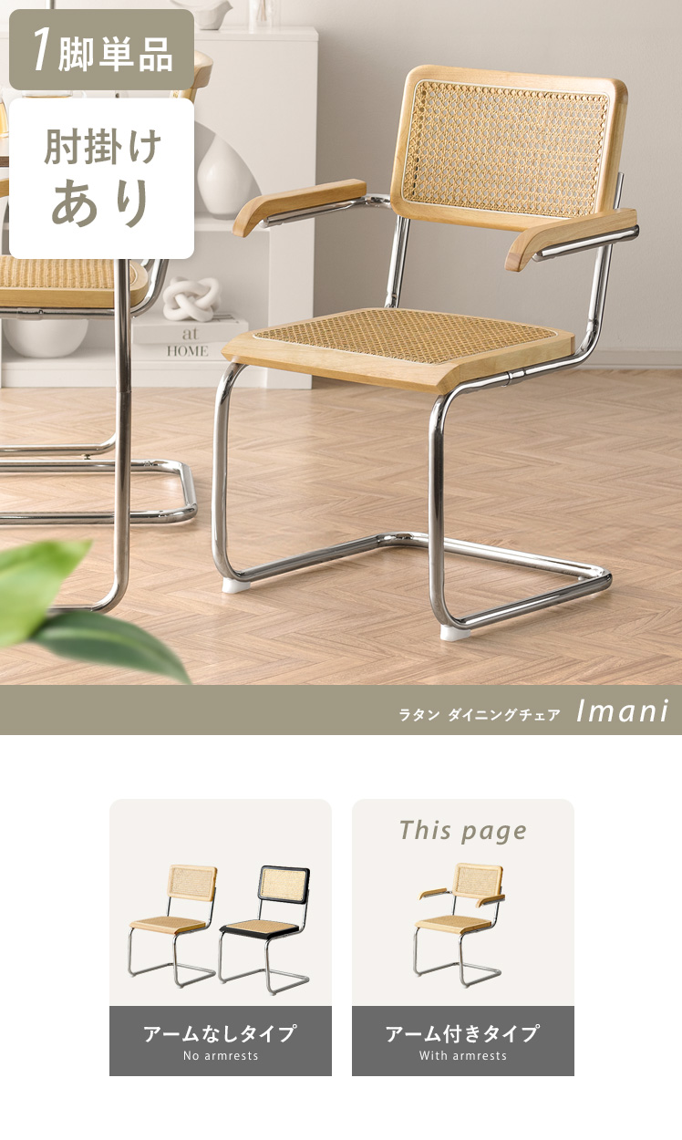 ラタン ダイニングチェア Imani〔イマニ〕肘掛けありタイプ/ほっこりと落ち着く質感と高い機能性で、古くから愛されてきたラタン。そのラタンに、あえて無機質なスチールフレームを組み合わせ、現代的なプロポーションに。素材感を活かした独創的なフォルムは、まるでアートのように空間に華を添えます。とっておきのチェアで、素敵な空間づくりをお楽しみください。