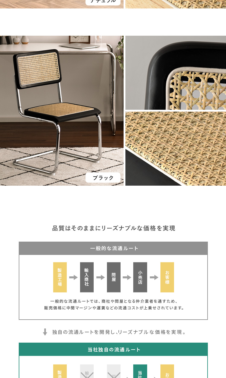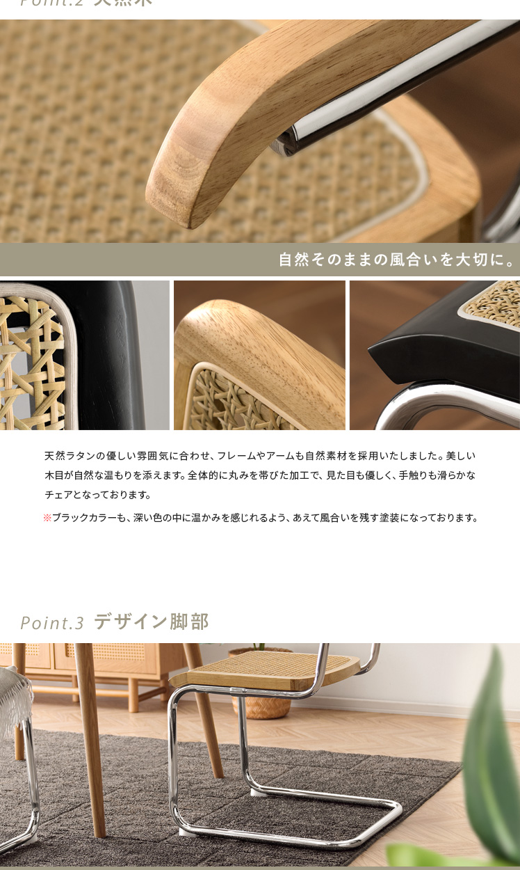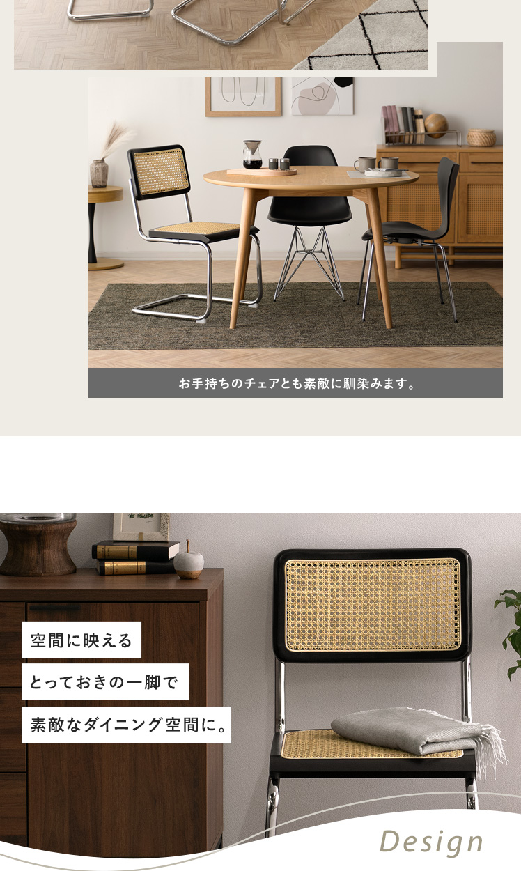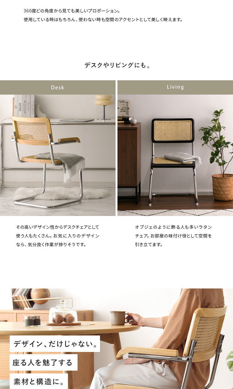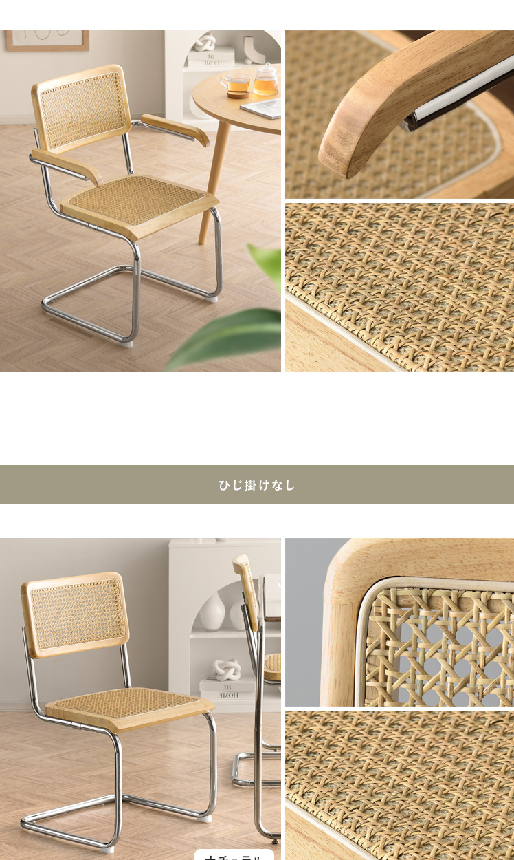 ラタン ダイニングチェア Imani〔イマニ〕肘掛けありタイプ/ほっこりと落ち着く質感と高い機能性で、古くから愛されてきたラタン。そのラタンに、あえて無機質なスチールフレームを組み合わせ、現代的なプロポーションに。素材感を活かした独創的なフォルムは、まるでアートのように空間に華を添えます。とっておきのチェアで、素敵な空間づくりをお楽しみください。
