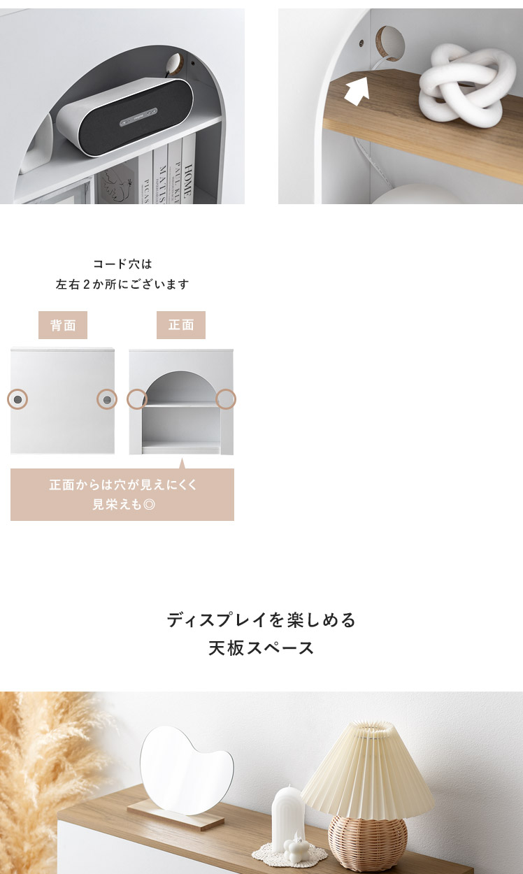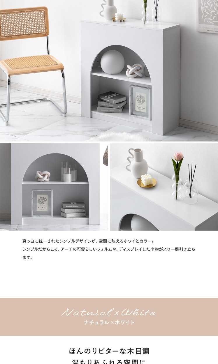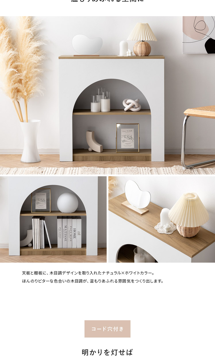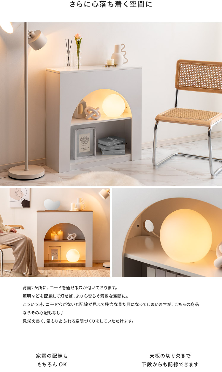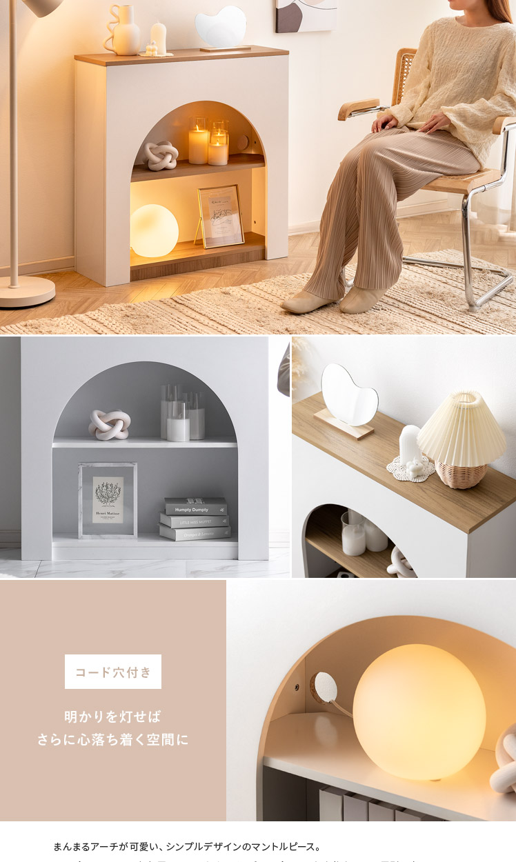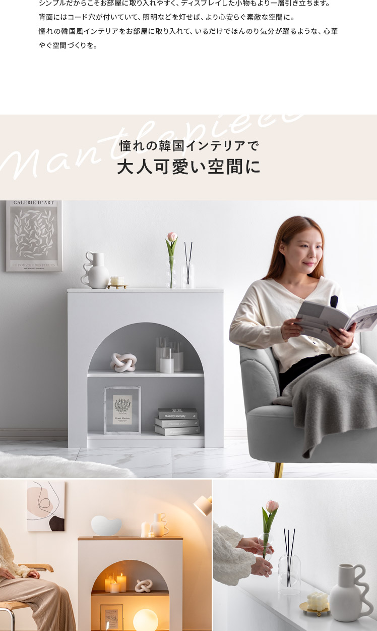 /まんまるアーチが可愛い、シンプルデザインのマントルピース。シンプルだからこそお部屋に取り入れやすく、ディスプレイした小物もより一層引き立ちます。背面にはコード穴が付いていて、照明などを灯せば、より心安らぐ素敵な空間に。憧れの韓国風インテリアをお部屋に取り入れて、いるだけでほんのり気分が躍るような、心華やぐ空間づくりを。