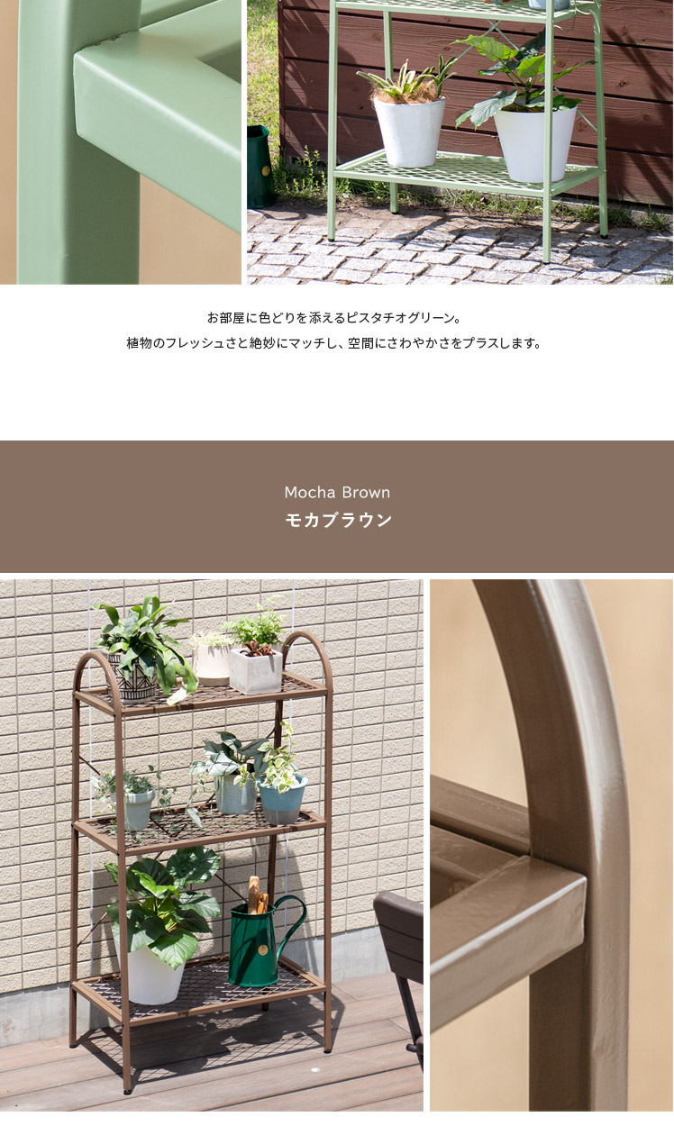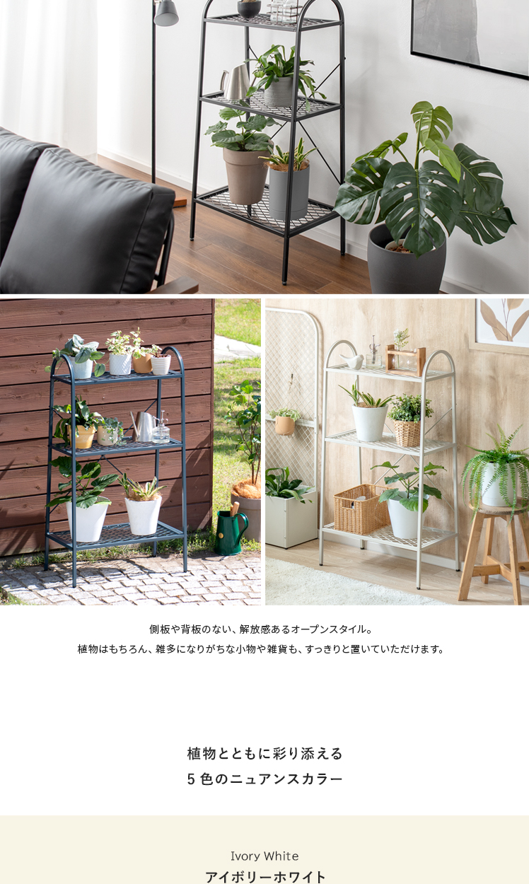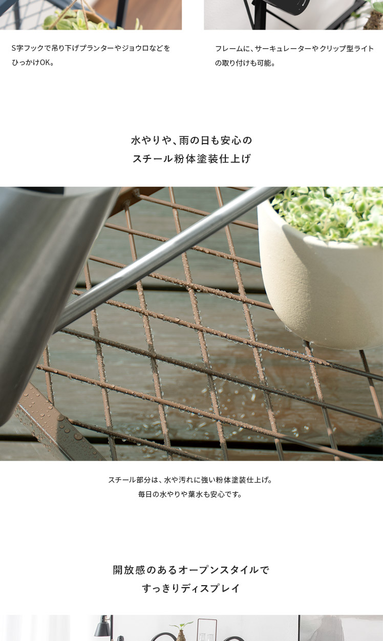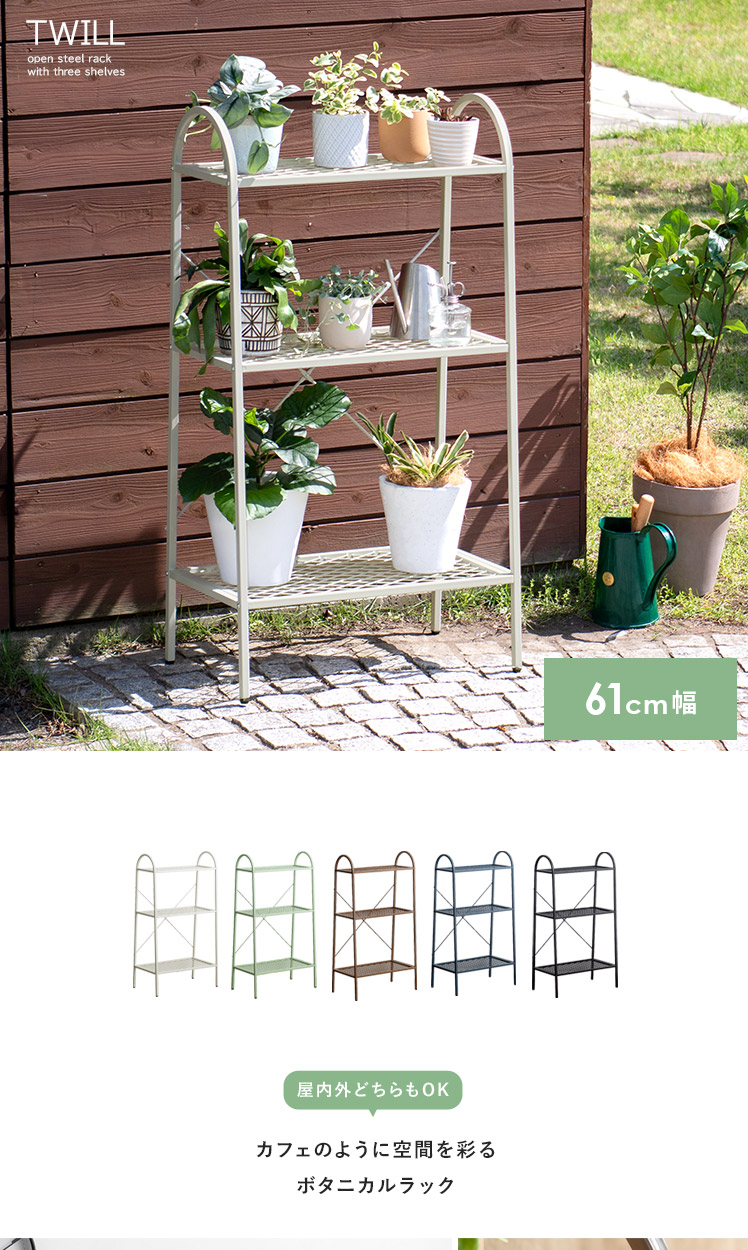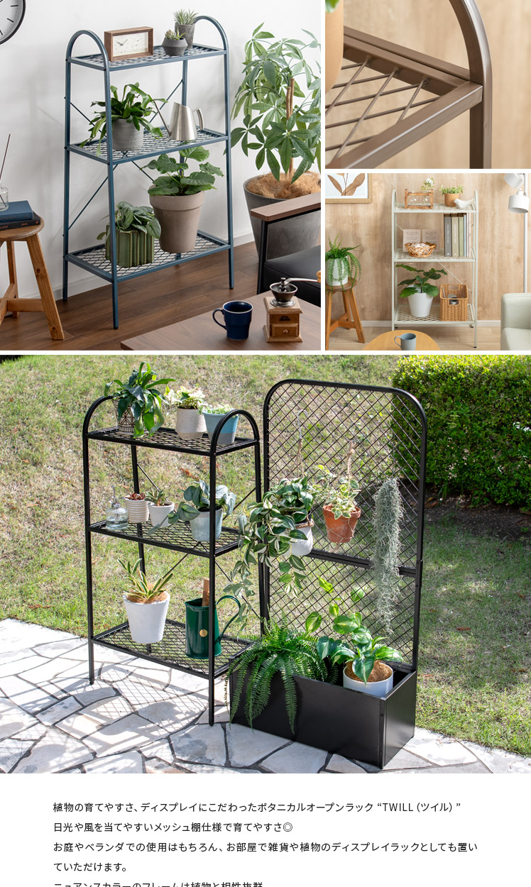 オープン3段ラック TWILL〔ツイル〕/植物の育てやすさ、ディスプレイにこだわったボタニカルオープンラック “TWILL(ツイル)”日光や風を当てやすいメッシュ棚仕様で育てやすさ◎お庭やベランダでの使用はもちろん、お部屋で雑貨や植物のディスプレイラックとしても置いていただけます。ニュアンスカラーのフレームは植物と相性抜群。花やグリーンを引き立て、映える空間をつくります。