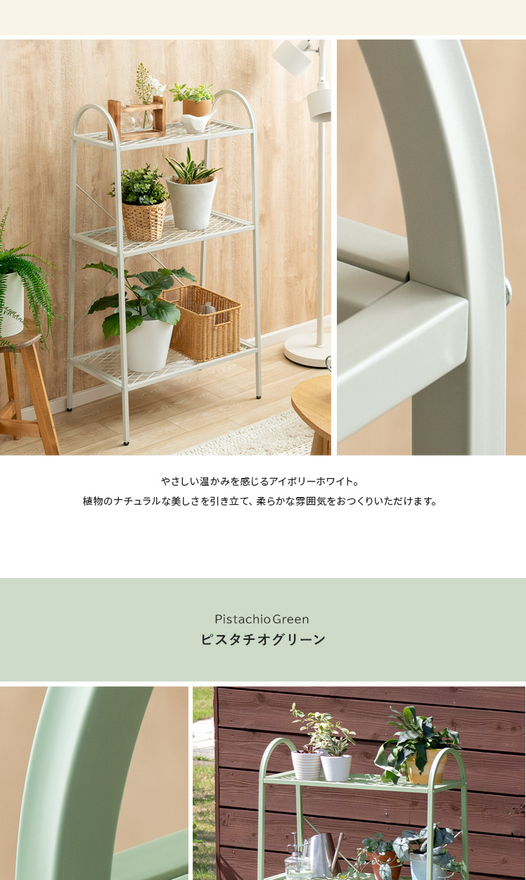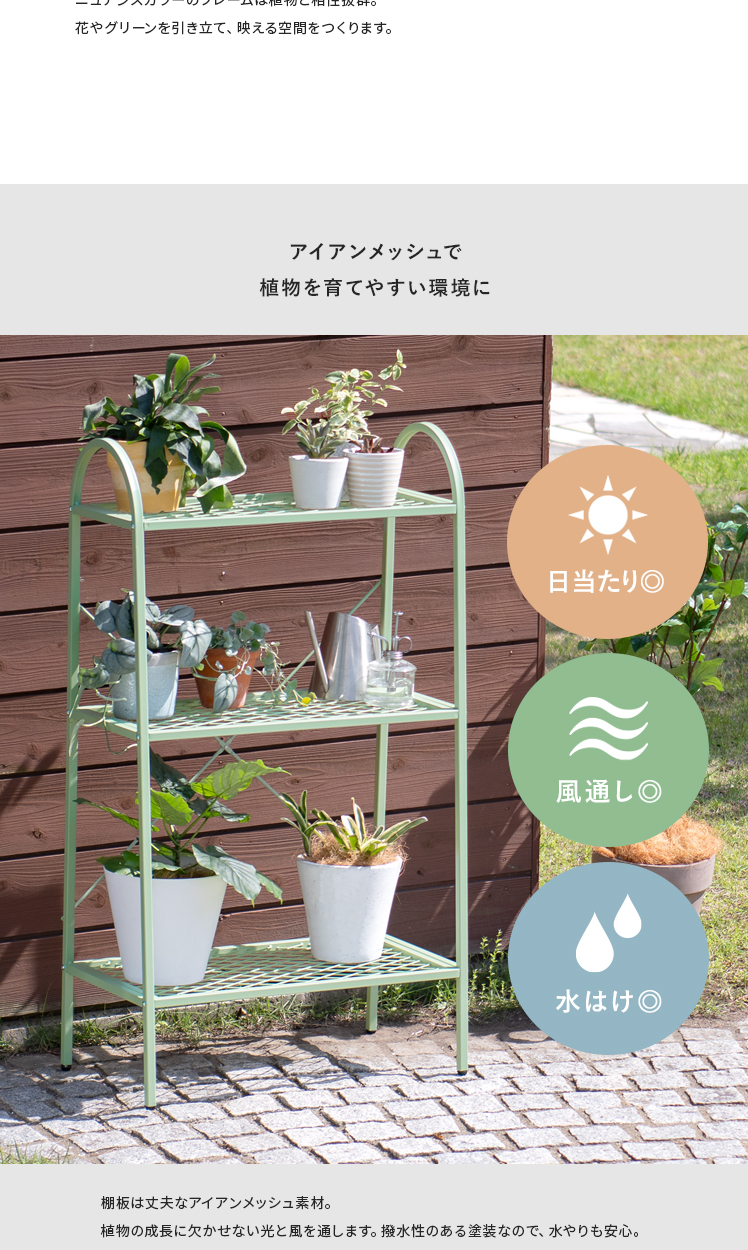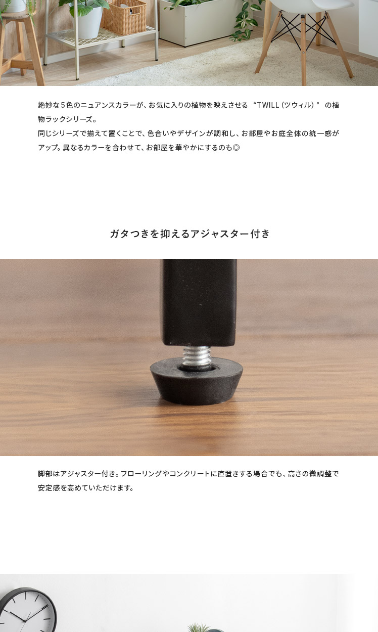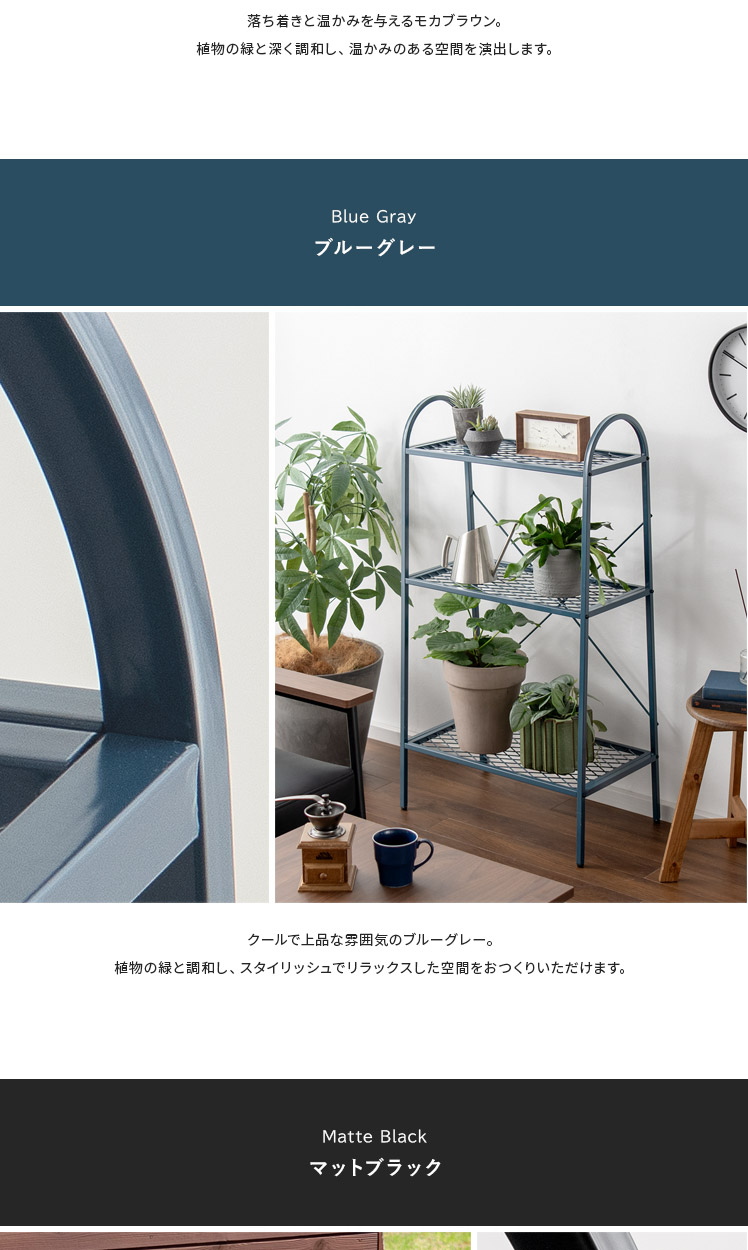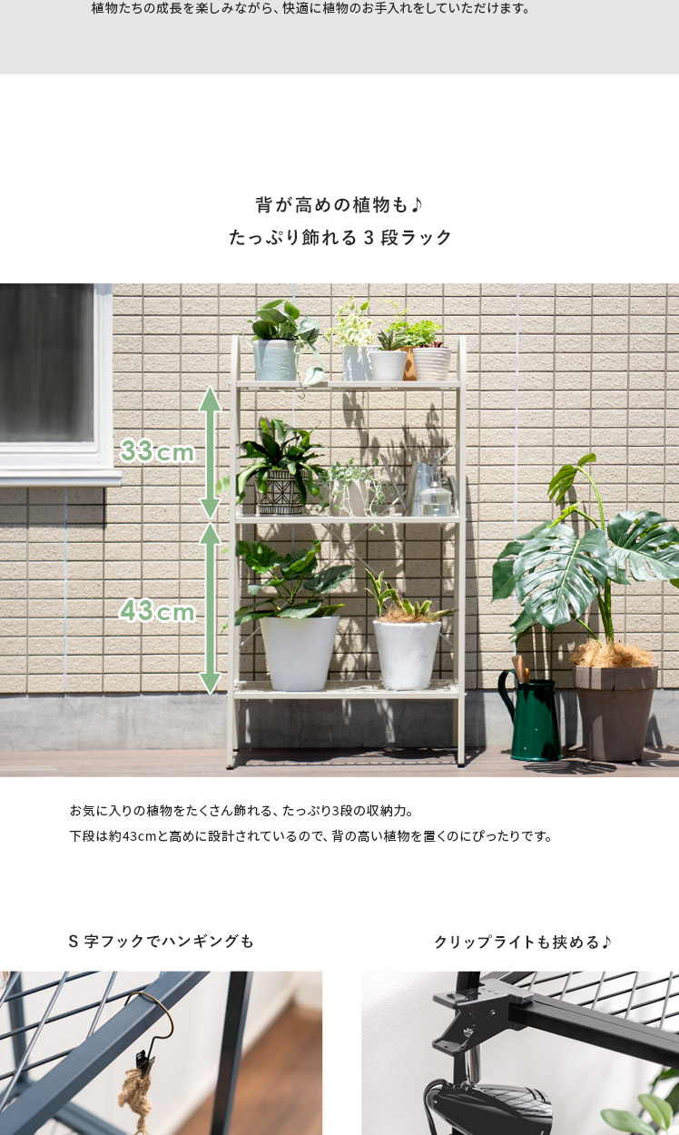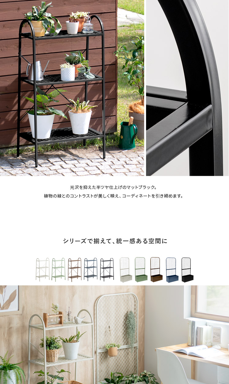 オープン3段ラック TWILL〔ツイル〕/植物の育てやすさ、ディスプレイにこだわったボタニカルオープンラック “TWILL(ツイル)”日光や風を当てやすいメッシュ棚仕様で育てやすさ◎お庭やベランダでの使用はもちろん、お部屋で雑貨や植物のディスプレイラックとしても置いていただけます。ニュアンスカラーのフレームは植物と相性抜群。花やグリーンを引き立て、映える空間をつくります。