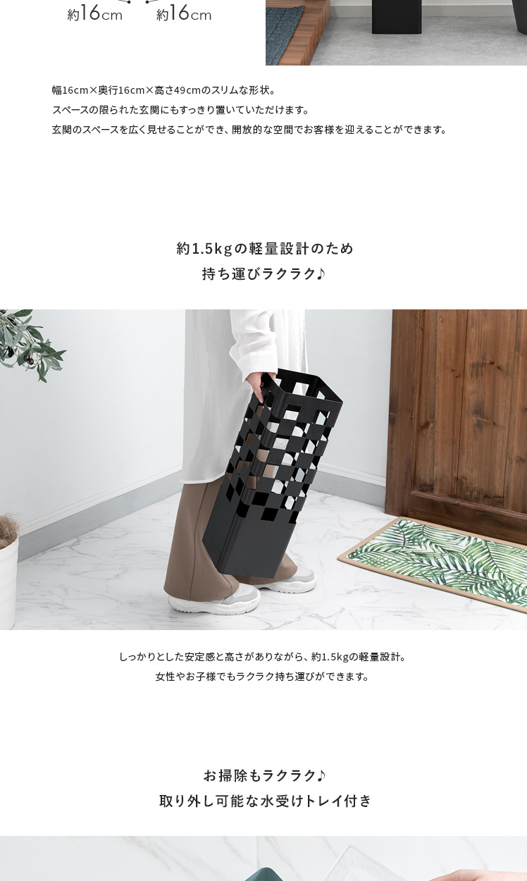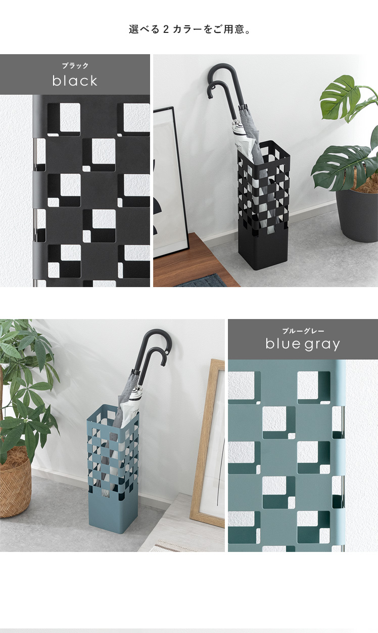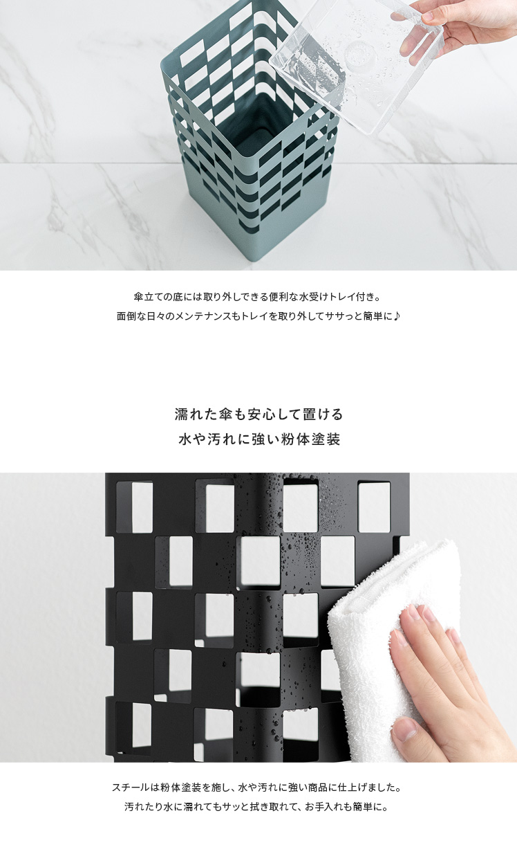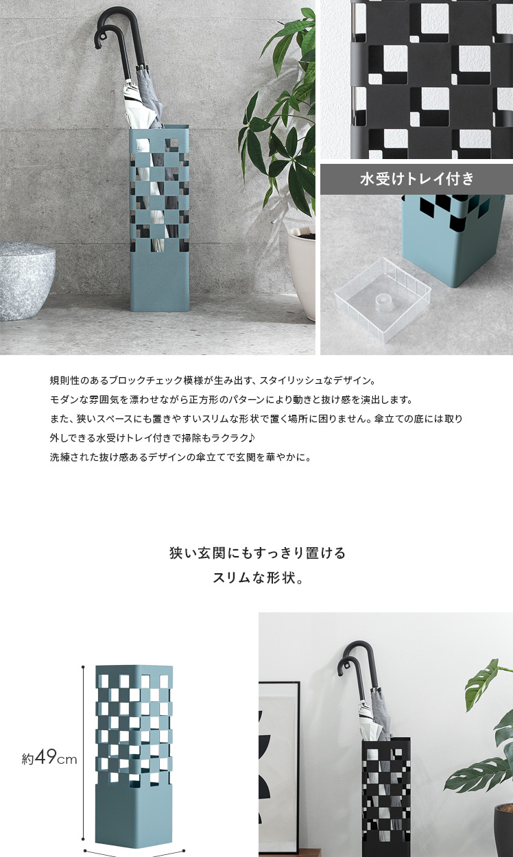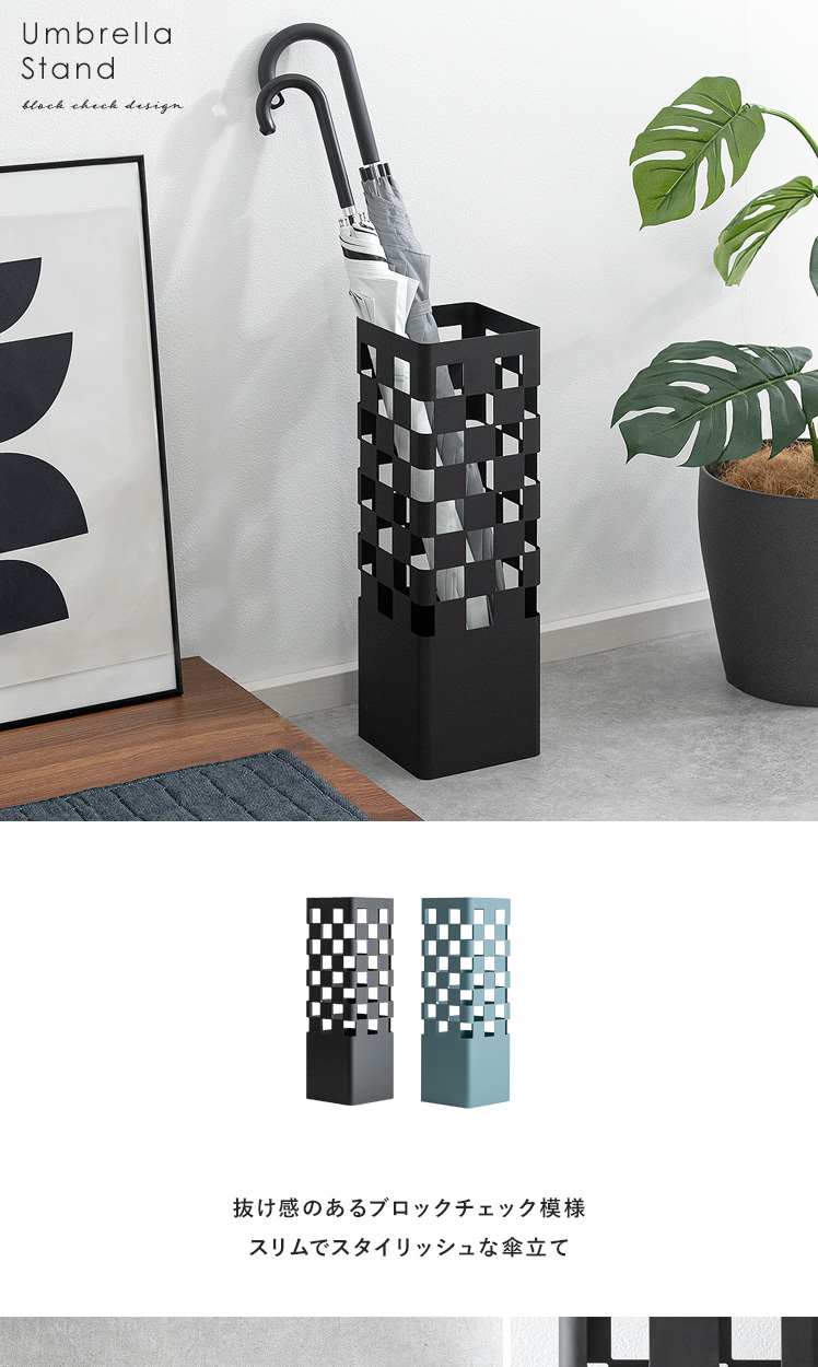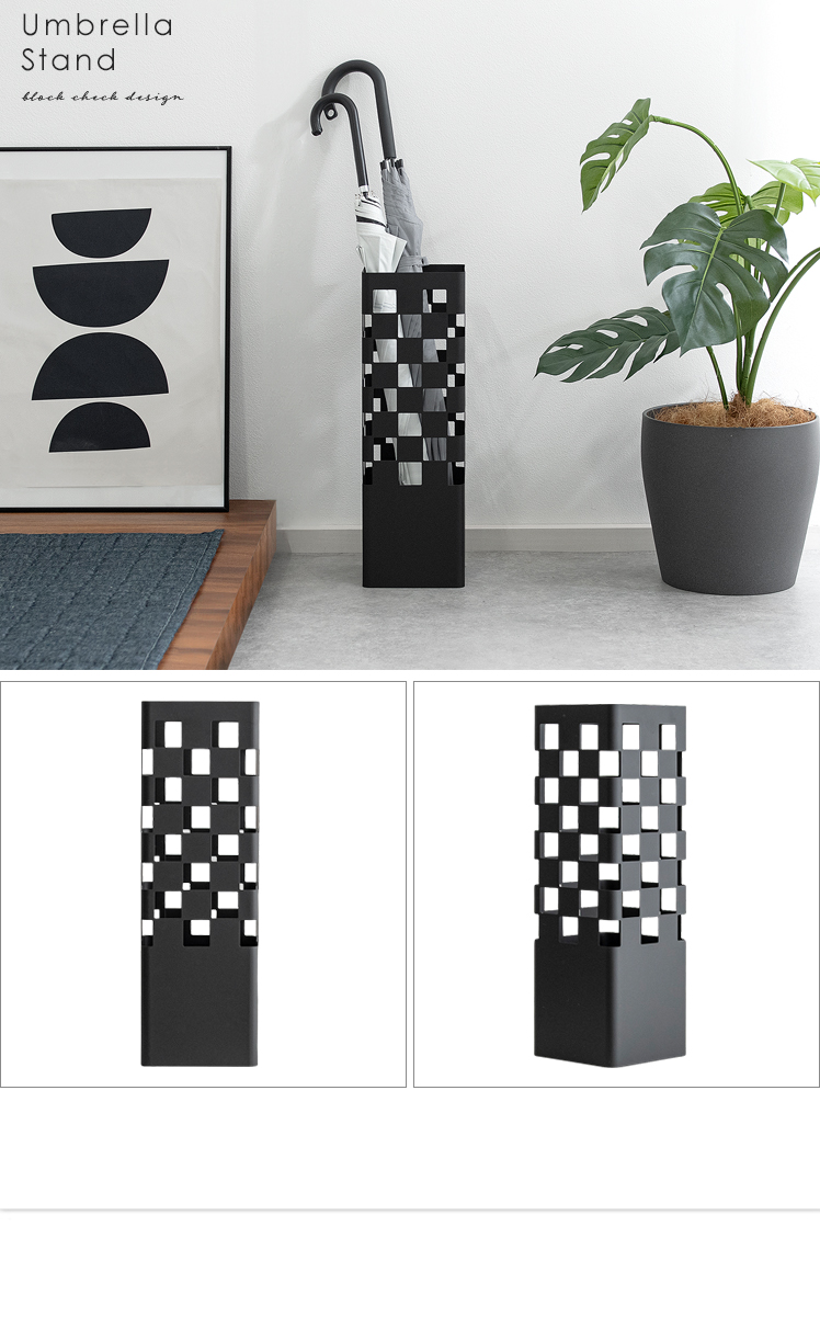ブロックチェック アンブレラスタンド/規則性のあるブロックチェック模様が生み出す、スタイリッシュなデザイン。モダンな雰囲気を漂わせながら正方形のパターンにより動きと抜け感を演出します。また、狭いスペースにも置きやすいスリムな形状で置く場所に困りません。傘立ての底には取り外しできる水受けトレイ付きで掃除もラクラク♪洗練された抜け感あるデザインの傘立てで玄関を華やかに。