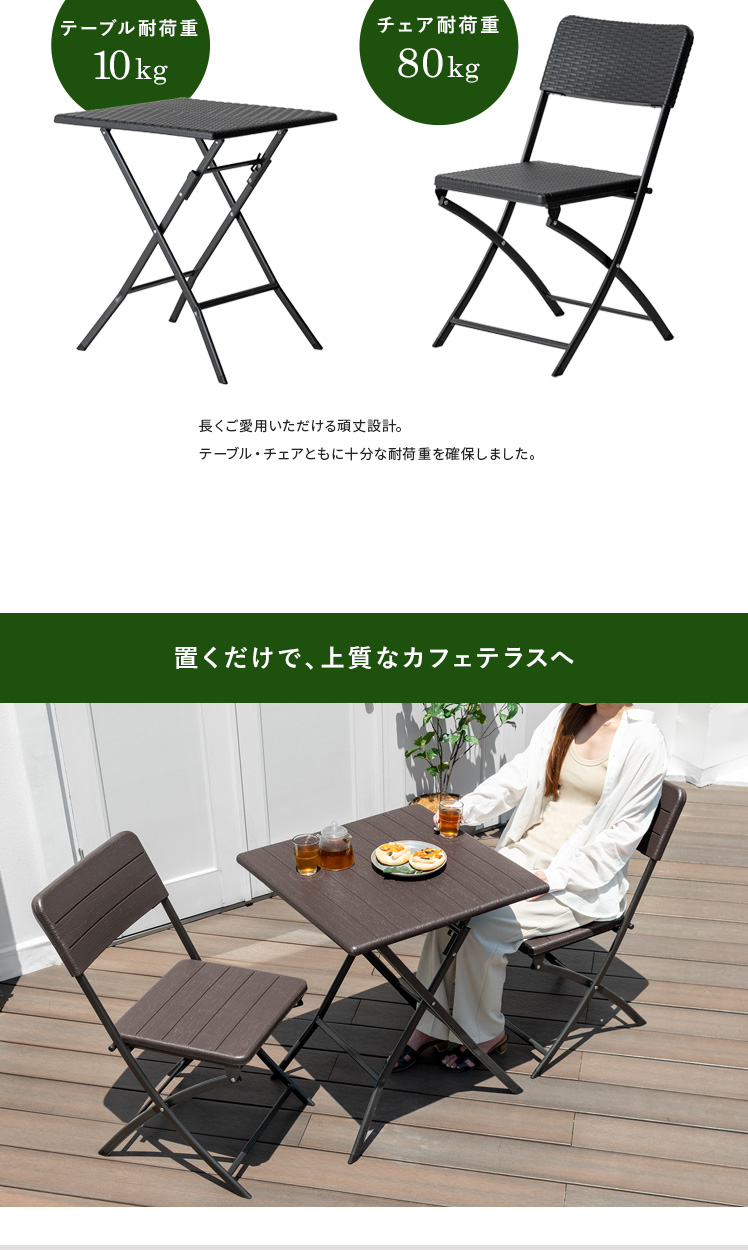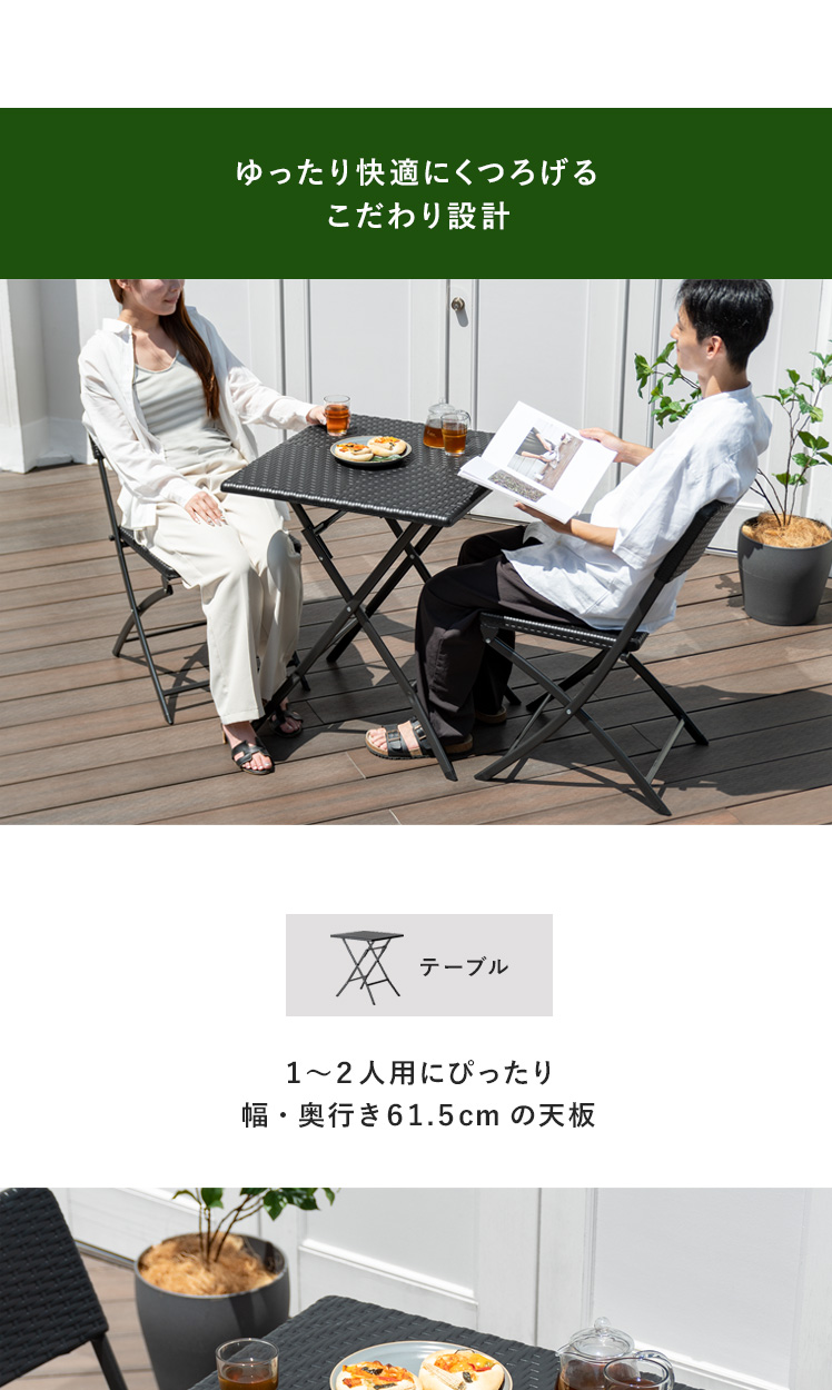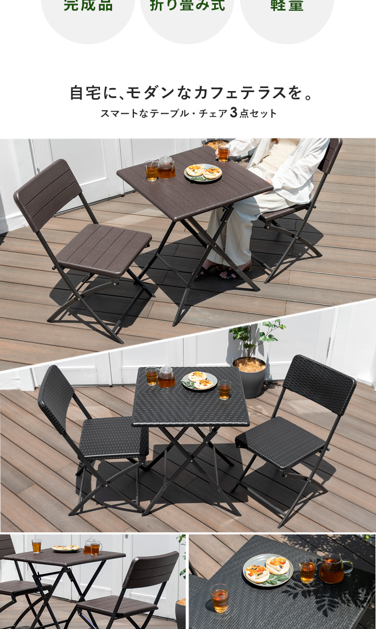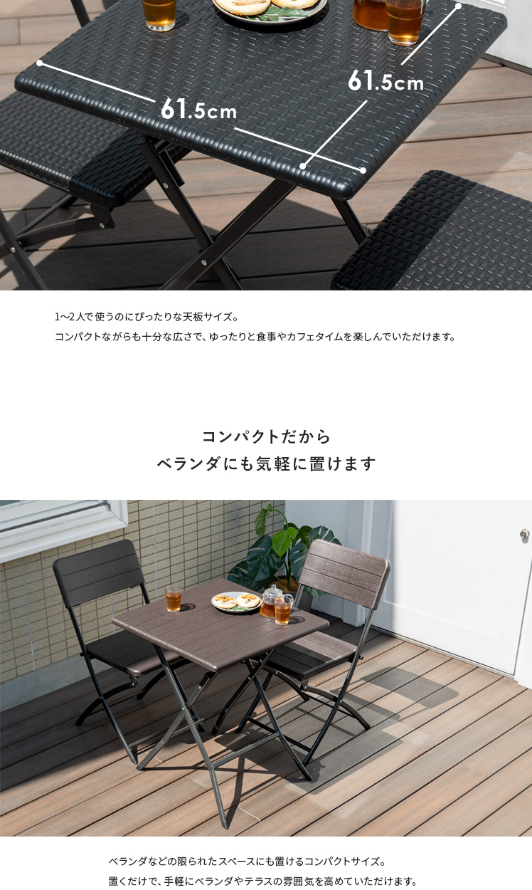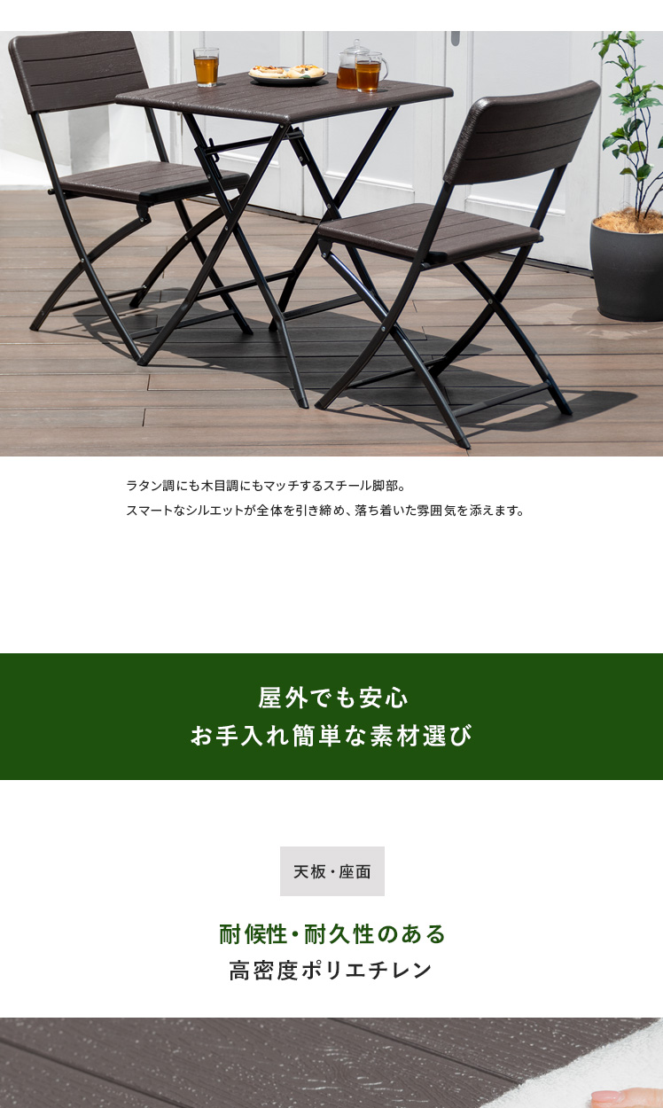 折り畳み式ガーデンテーブル&チェア3点セット/置くだけで、お庭やベランダがおしゃれなカフェテラスに。コンパクトで、限られたスペースにも気軽に置けるサイズ感。家族や友人と過ごすリラックスタイムを、もっと特別なものに演出してくれます。