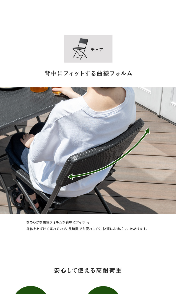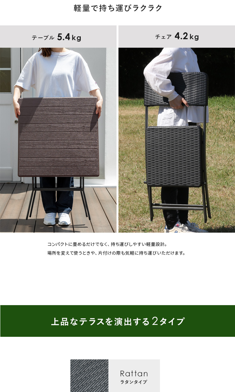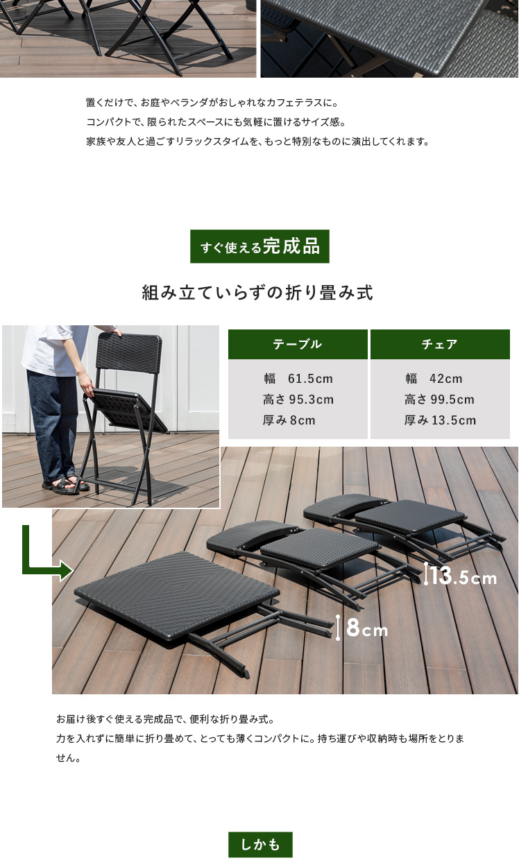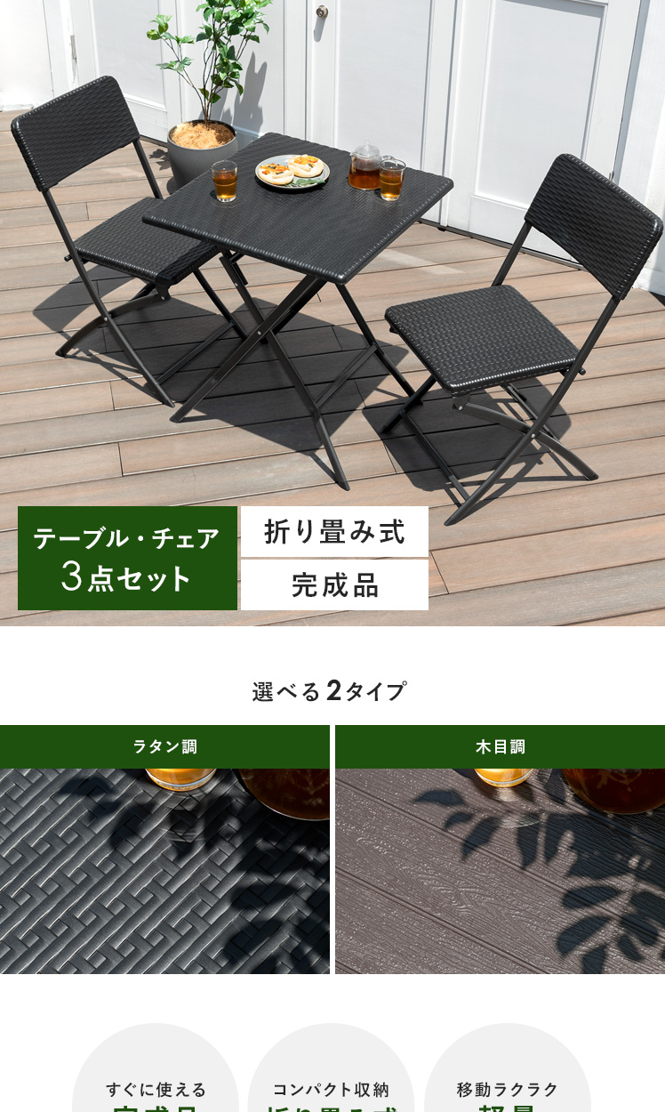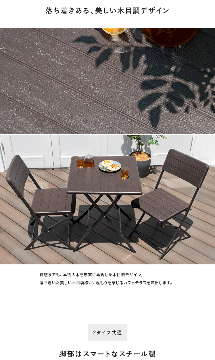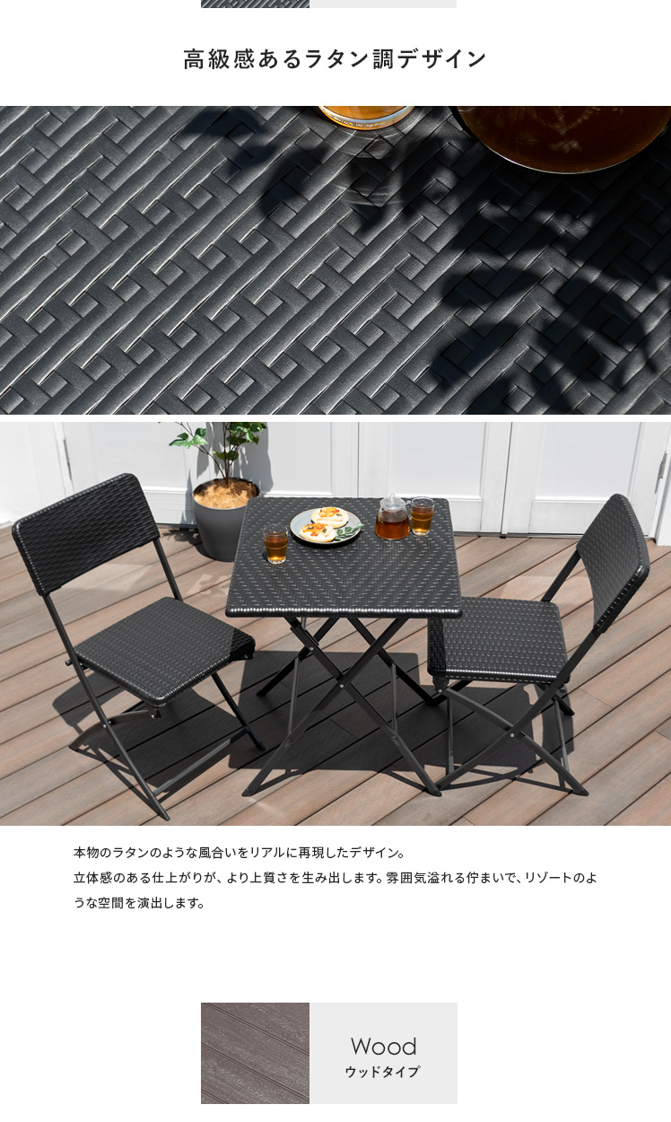 折り畳み式ガーデンテーブル&チェア3点セット/置くだけで、お庭やベランダがおしゃれなカフェテラスに。コンパクトで、限られたスペースにも気軽に置けるサイズ感。家族や友人と過ごすリラックスタイムを、もっと特別なものに演出してくれます。