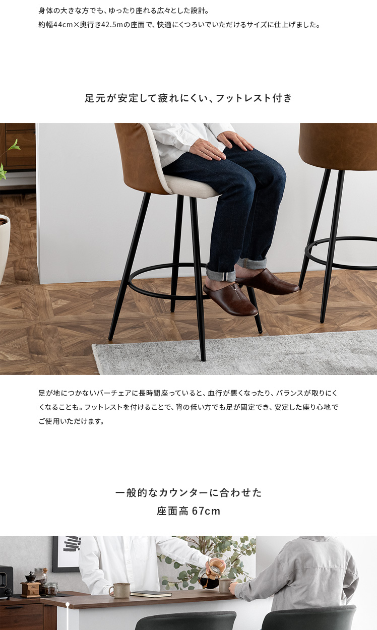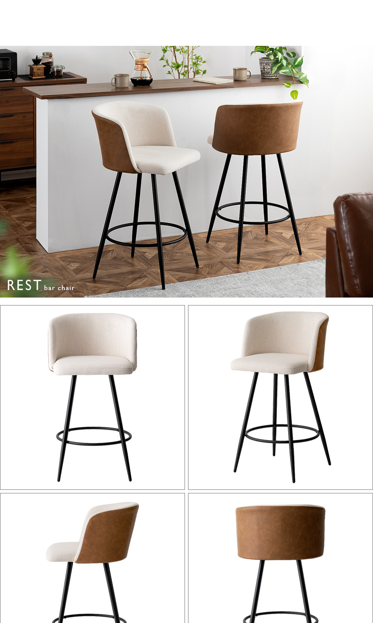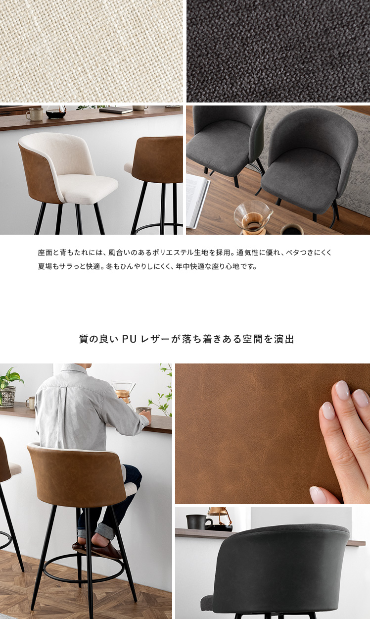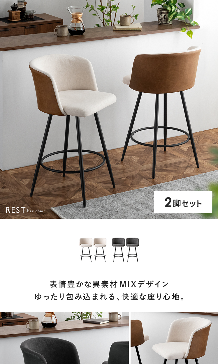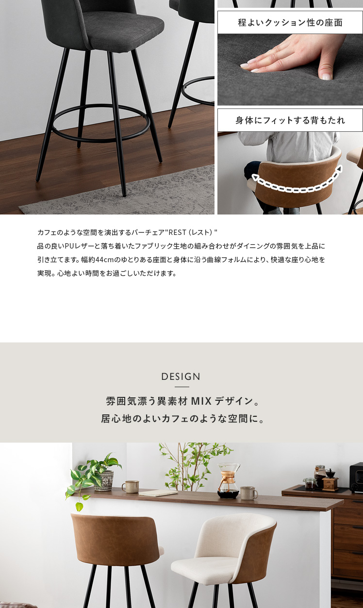 バーチェア REST〔レスト〕 2脚セット/カフェのような空間を演出するバーチェア"REST(レスト)"品の良いPUレザーと落ち着いたファブリック生地の組み合わせがダイニングの雰囲気を上品に引き立てます。幅約44cmのゆとりある座面と身体に沿う曲線フォルムにより、快適な座り心地を実現。心地よい時間をお過ごしいただけます。