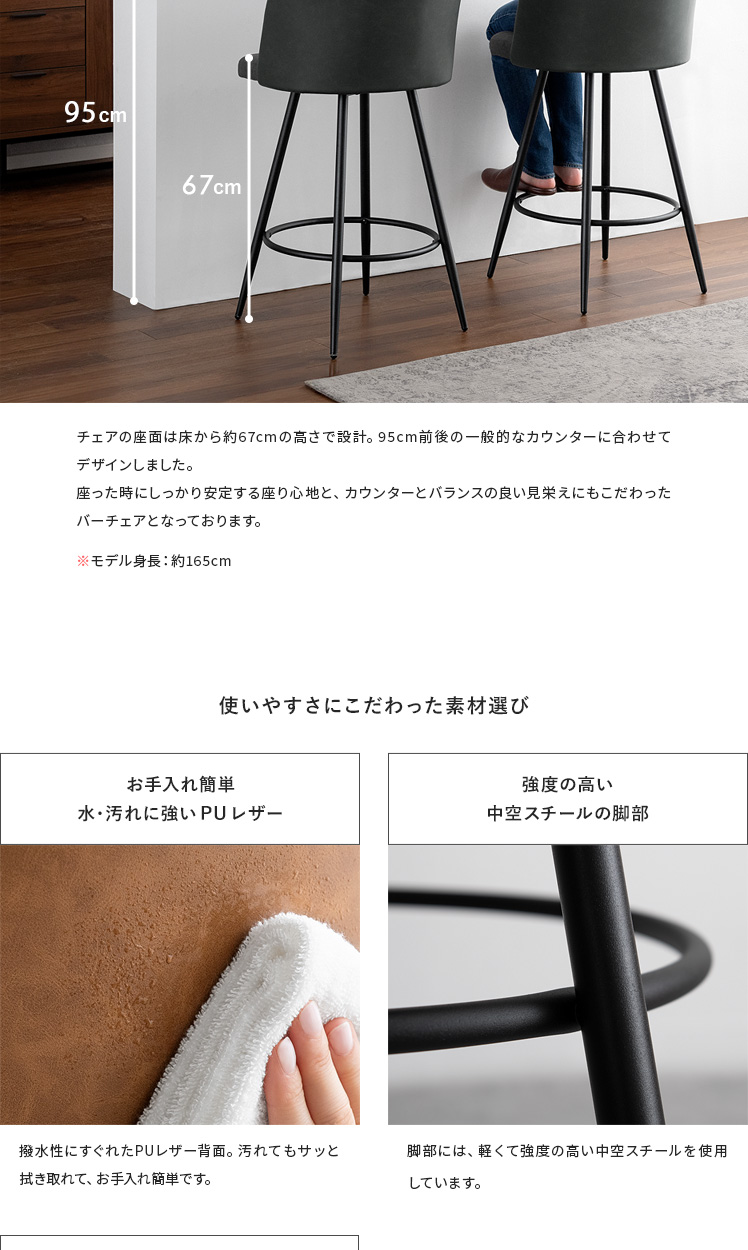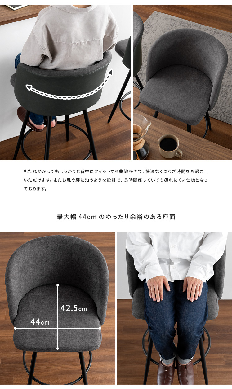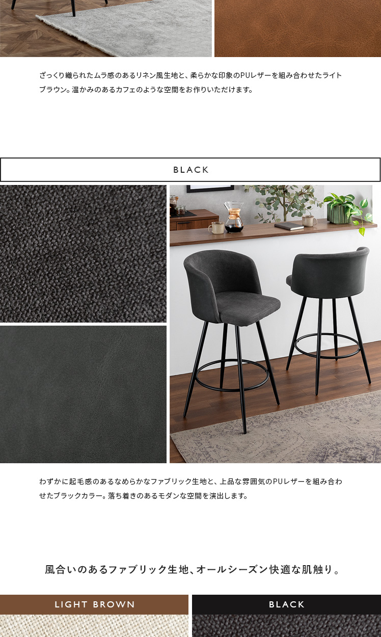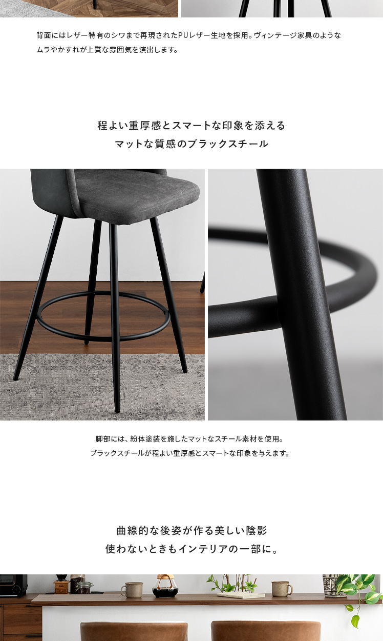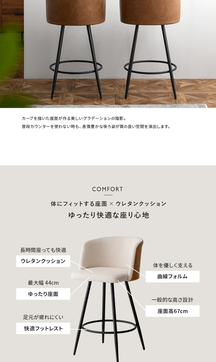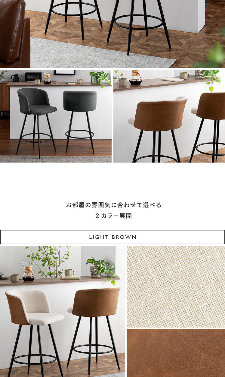 バーチェア REST〔レスト〕 2脚セット/カフェのような空間を演出するバーチェア"REST(レスト)"品の良いPUレザーと落ち着いたファブリック生地の組み合わせがダイニングの雰囲気を上品に引き立てます。幅約44cmのゆとりある座面と身体に沿う曲線フォルムにより、快適な座り心地を実現。心地よい時間をお過ごしいただけます。