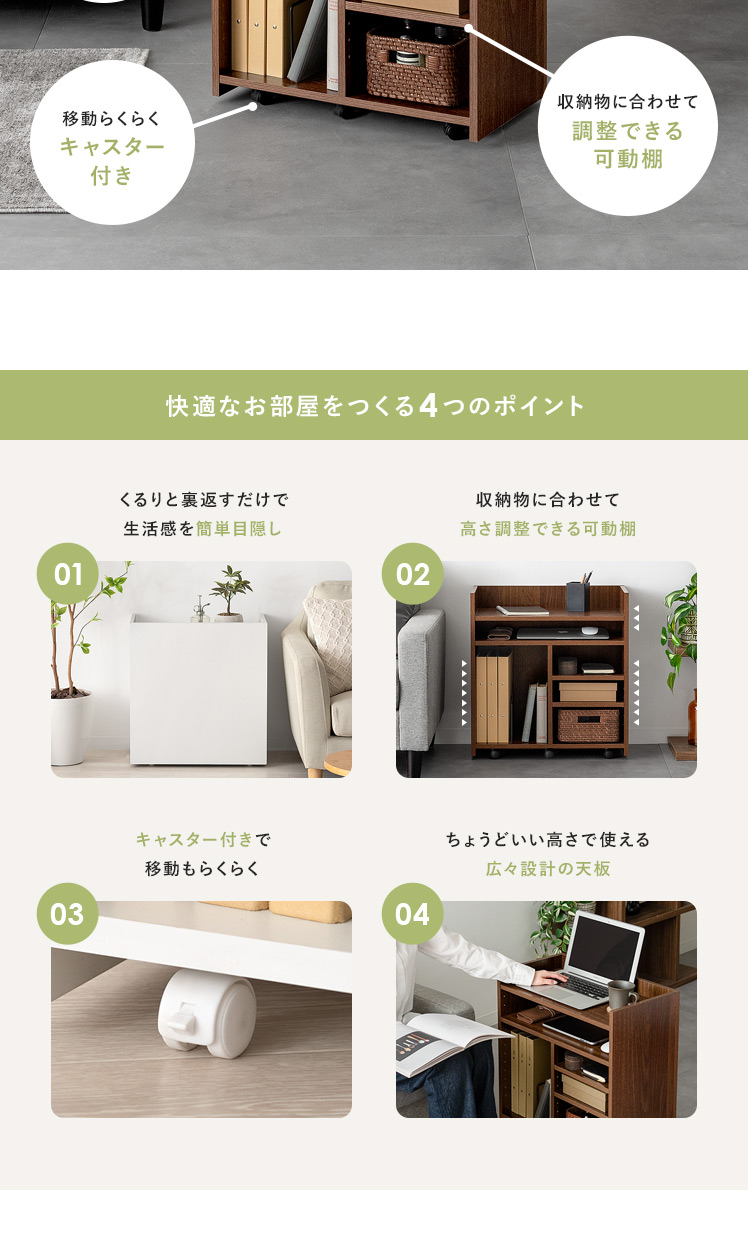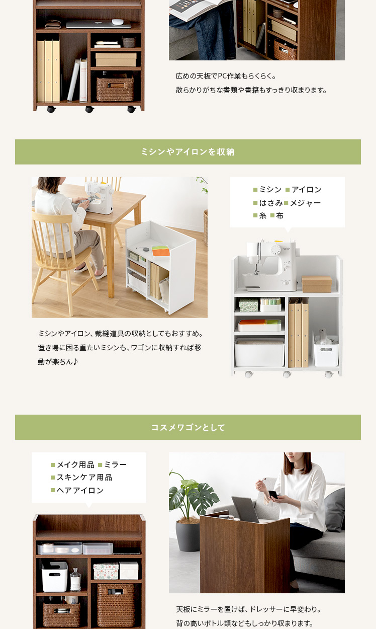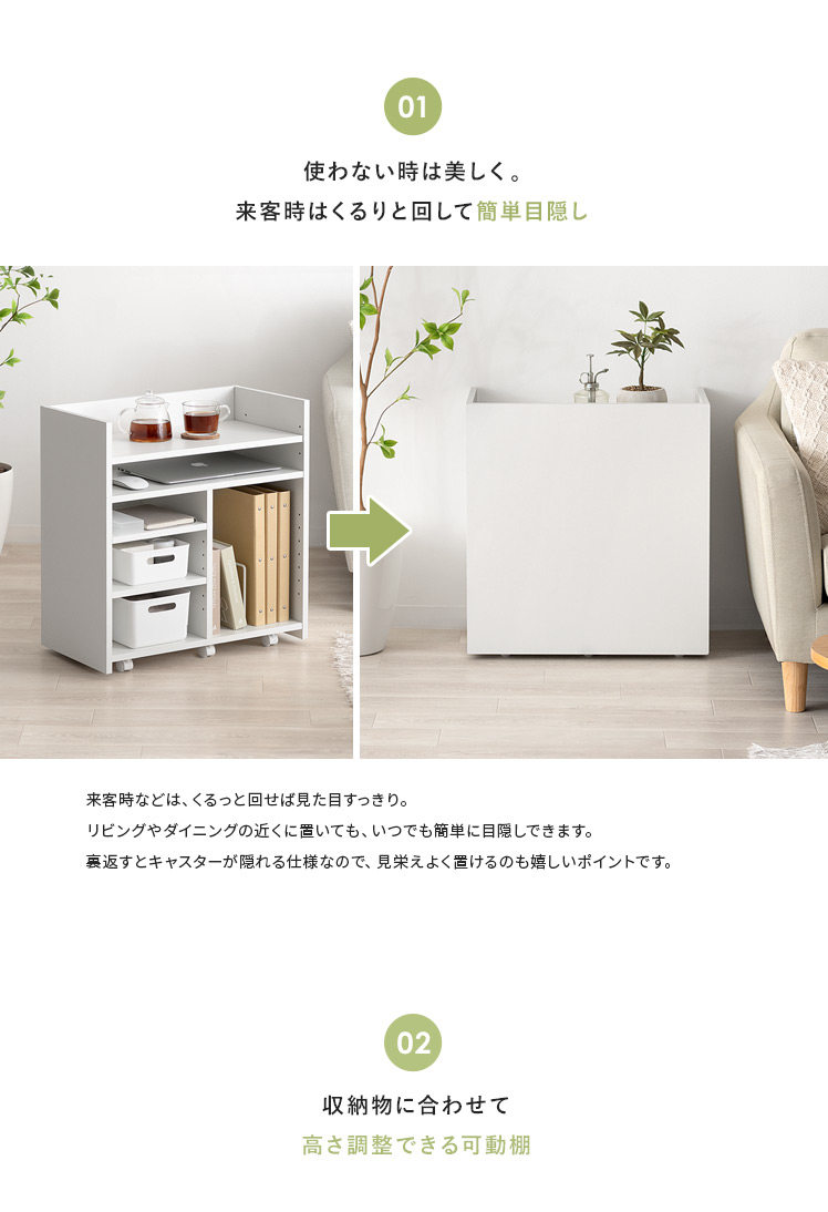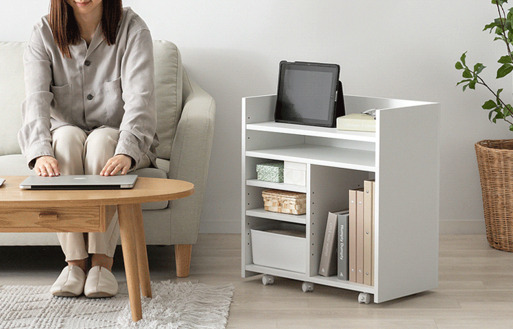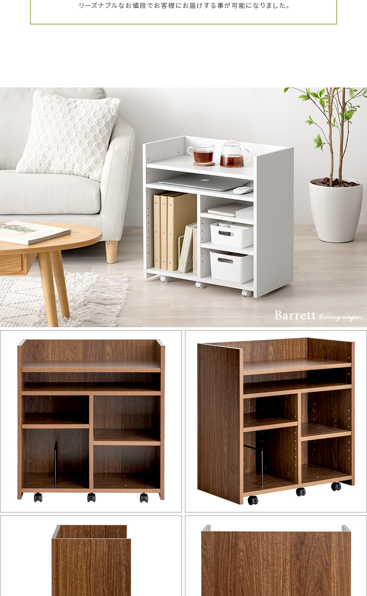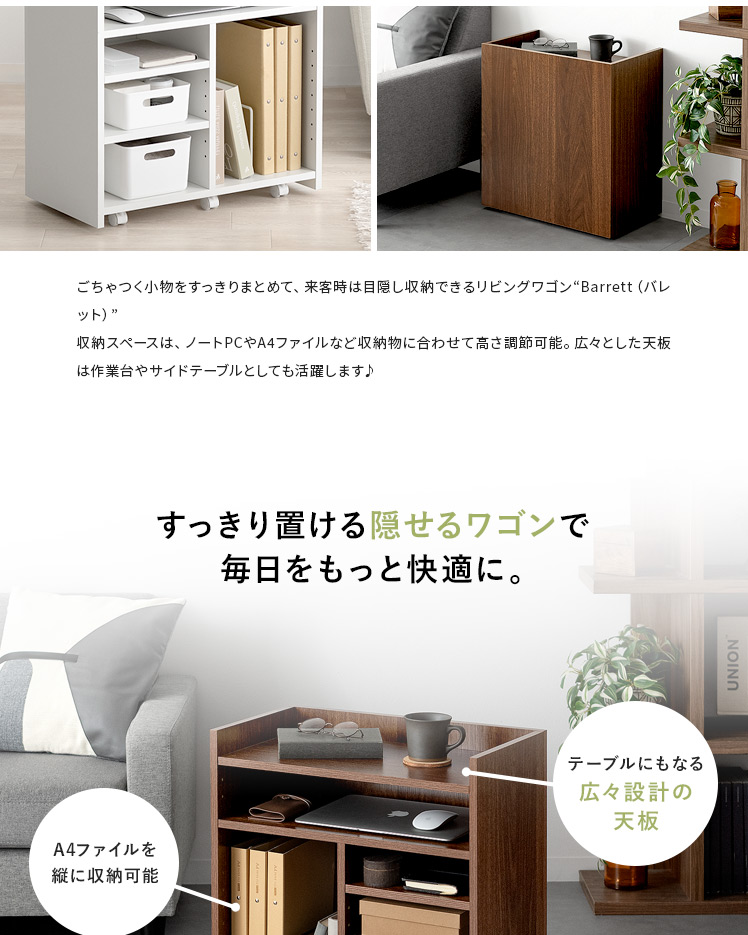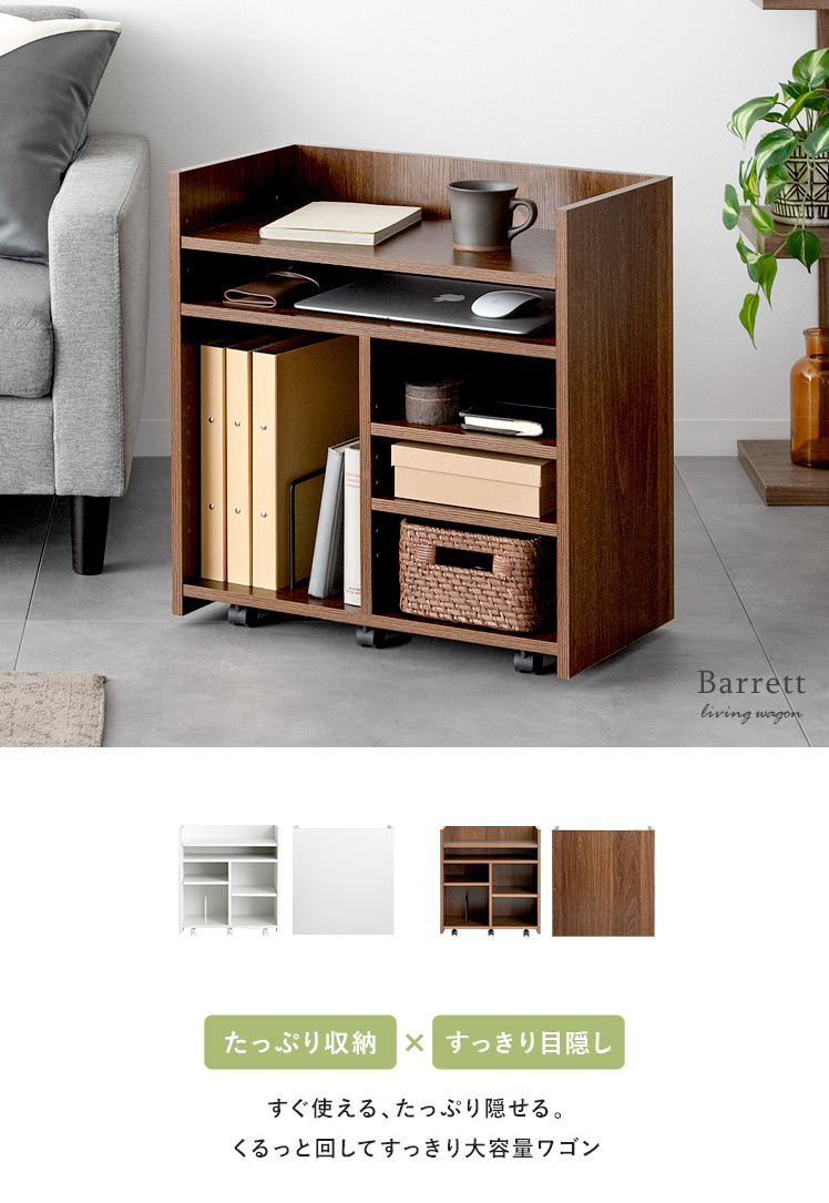 リビングワゴン Barrett〔バレット〕/ごちゃつく小物をすっきりまとめて、来客時は目隠し収納できるリビングワゴン“Barrett(バレット)”収納スペースは、ノートPCやA4ファイルなど収納物に合わせて高さ調節可能。広々とした天板は作業台やサイドテーブルとしても活躍します♪
