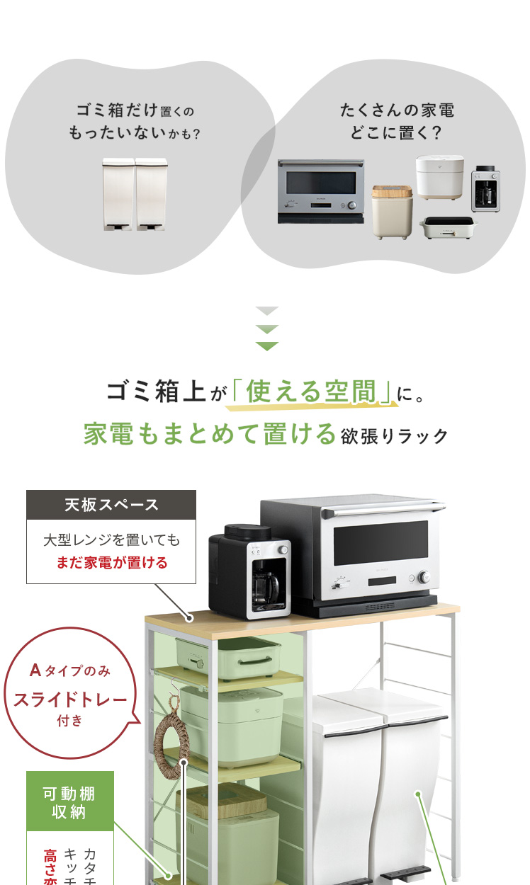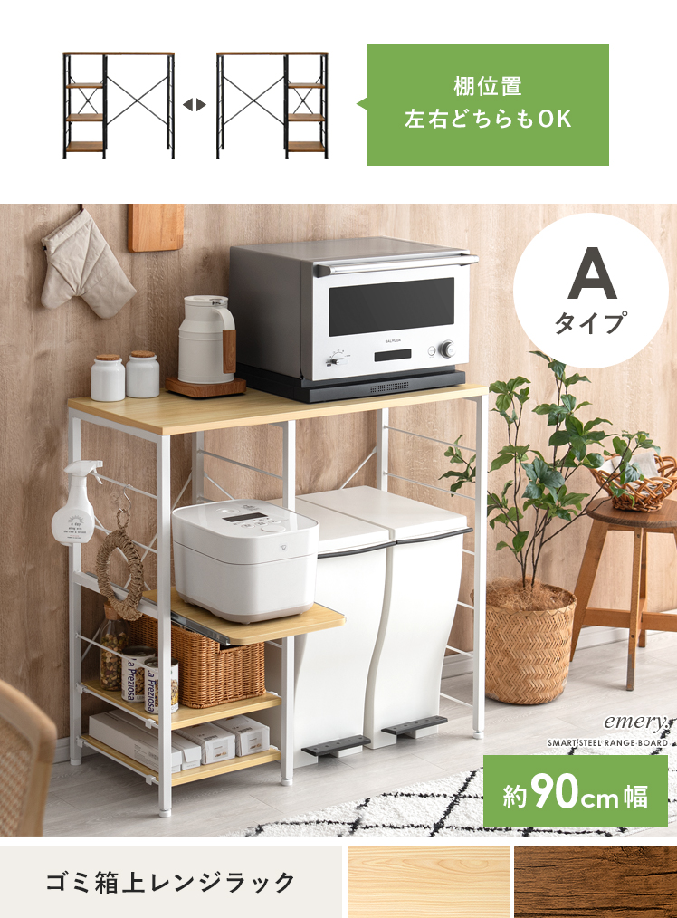ゴミ箱収納キッチンカウンター emery〔エメリー〕 90cm幅 Aタイプ/ゴミ箱上のデッドスペースを有効活用しつつ、たくさんのキッチン家電収納もひとまとめ♪
