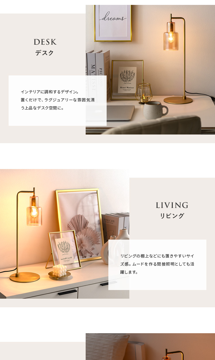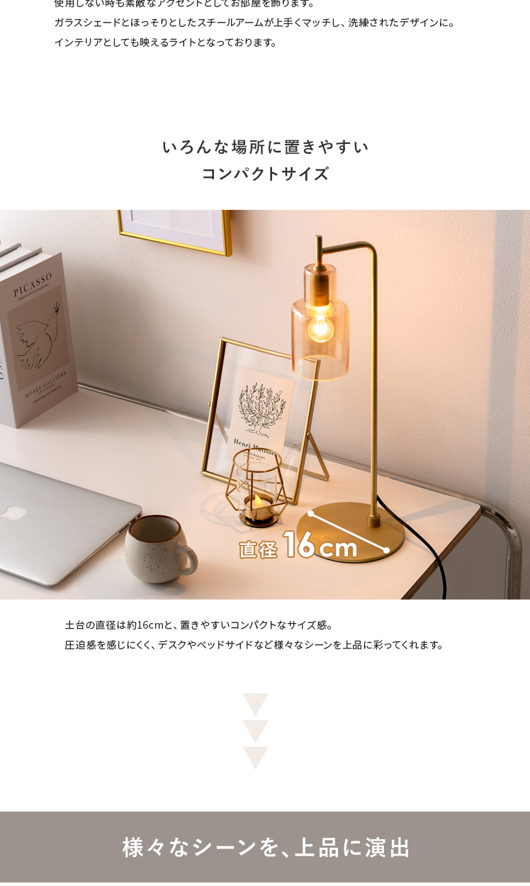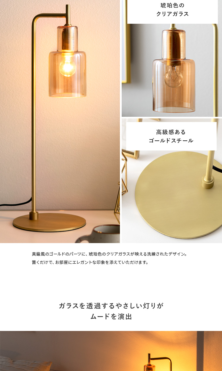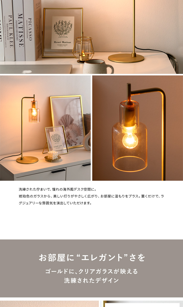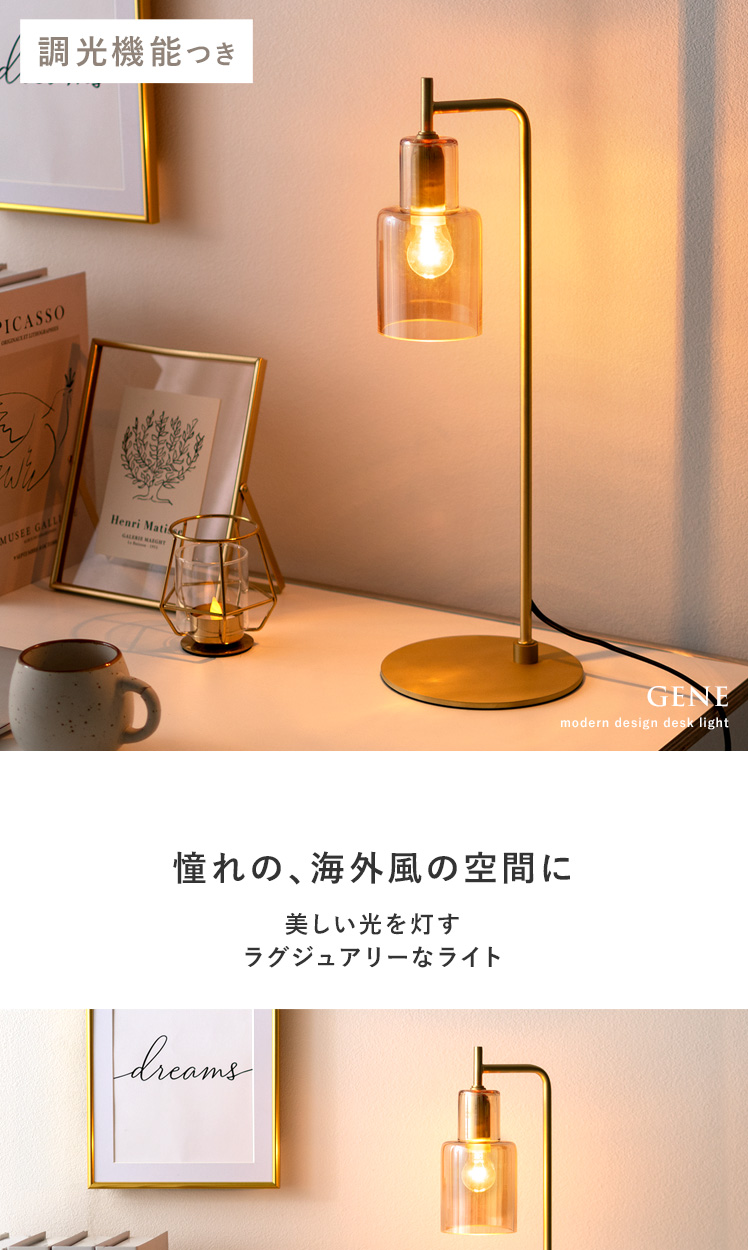 ガラスシェードデスクライト GENE〔ジーン〕/洗練された佇まいで、憧れの海外風デスク空間に。琥珀色のガラスから、美しい灯りがやさしく広がり、お部屋に温もりをプラス。置くだけで、ラグジュアリーな雰囲気を演出していただけます。