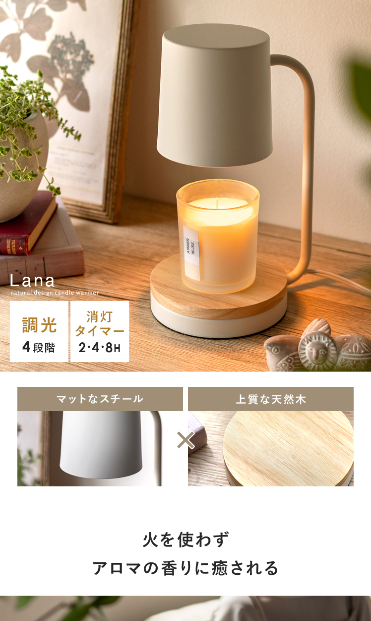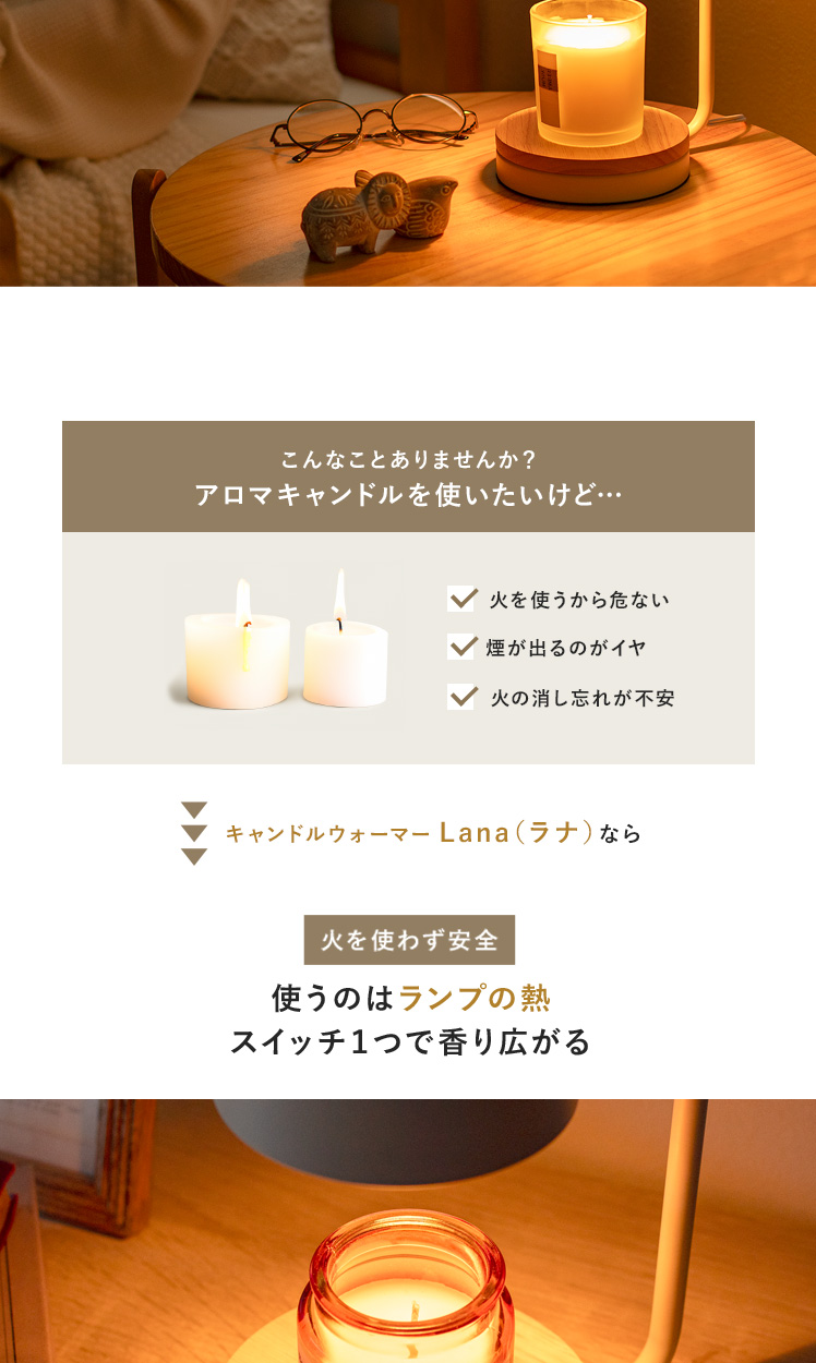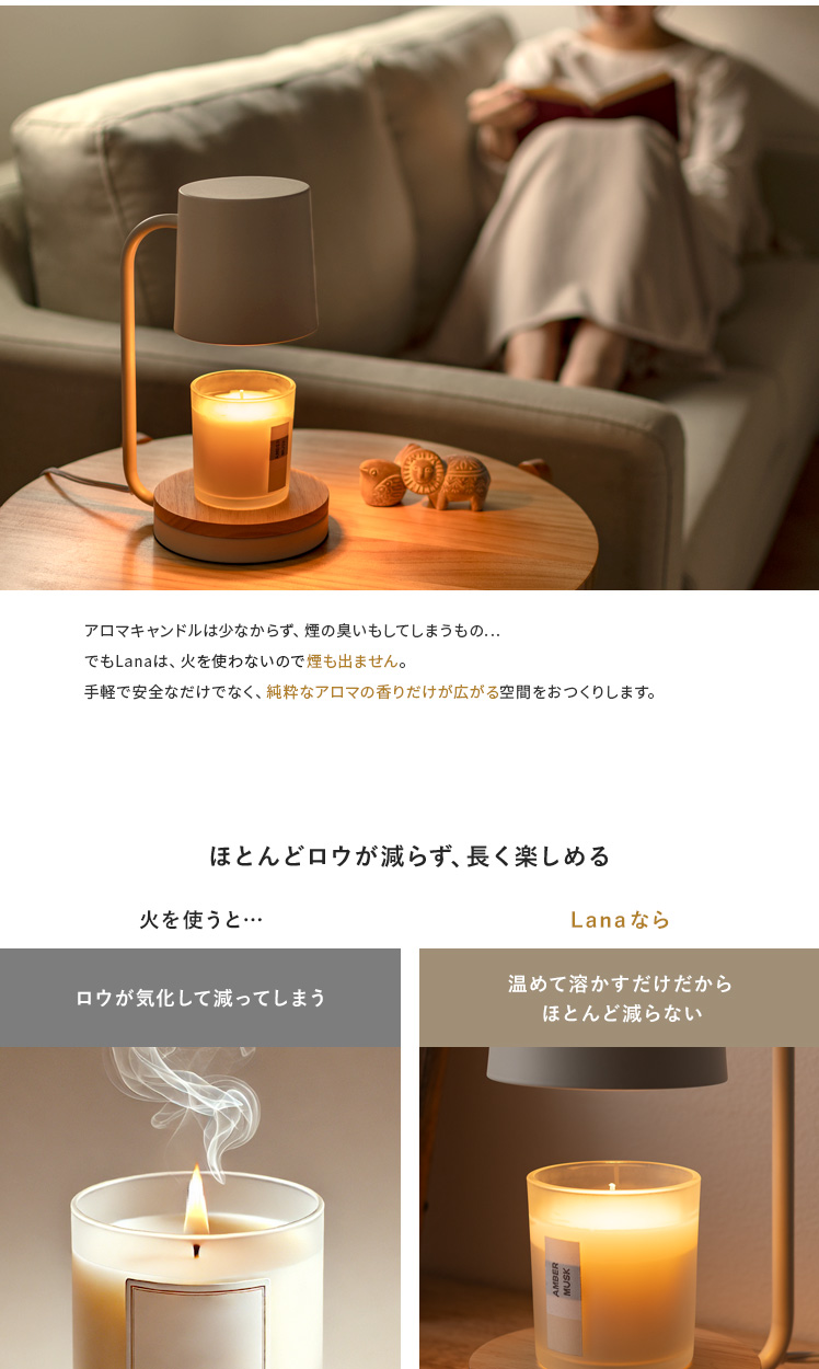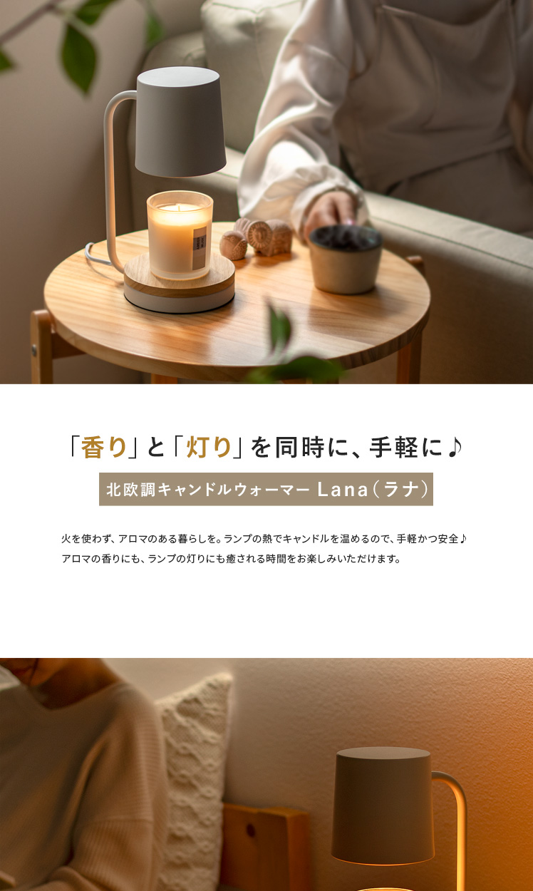 キャンドルウォーマー Lana〔ラナ〕/「香り」と「灯り」を同時に、手軽に♪火を使わず、アロマのある暮らしを。ランプの熱でキャンドルを温めるので、手軽かつ安全♪アロマの香りにも、ランプの灯りにも癒される時間をお楽しみいただけます。