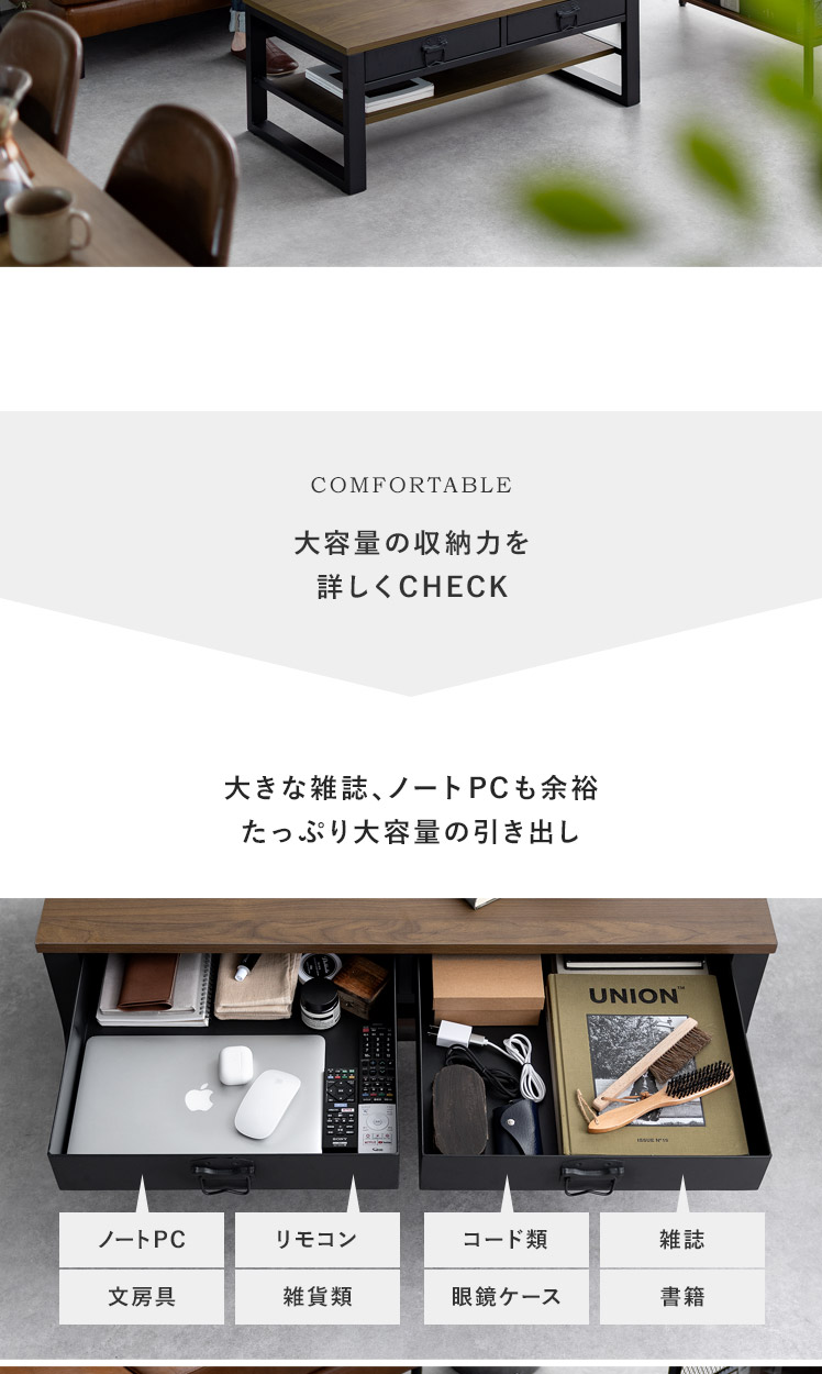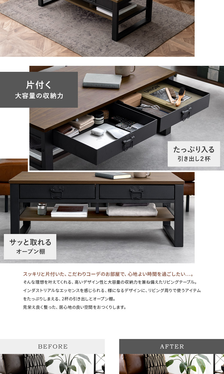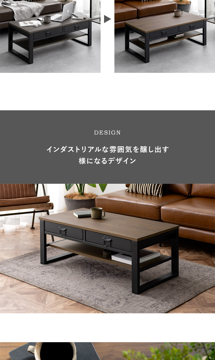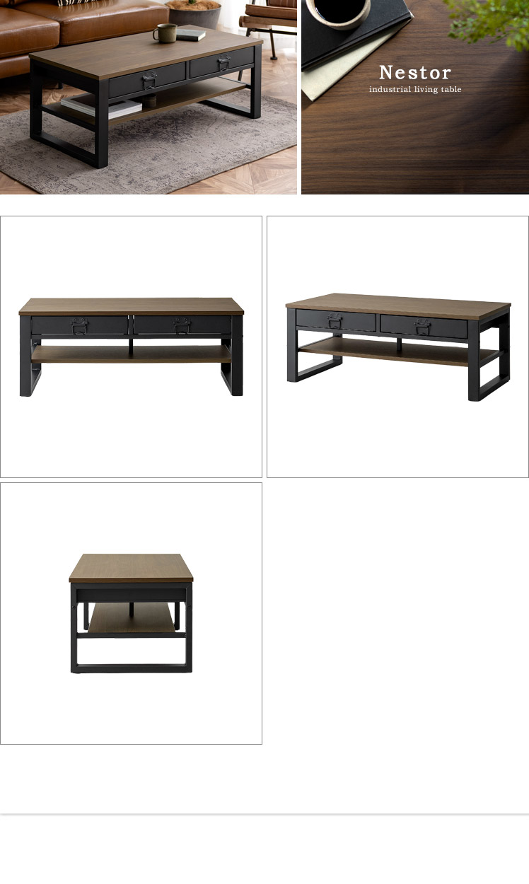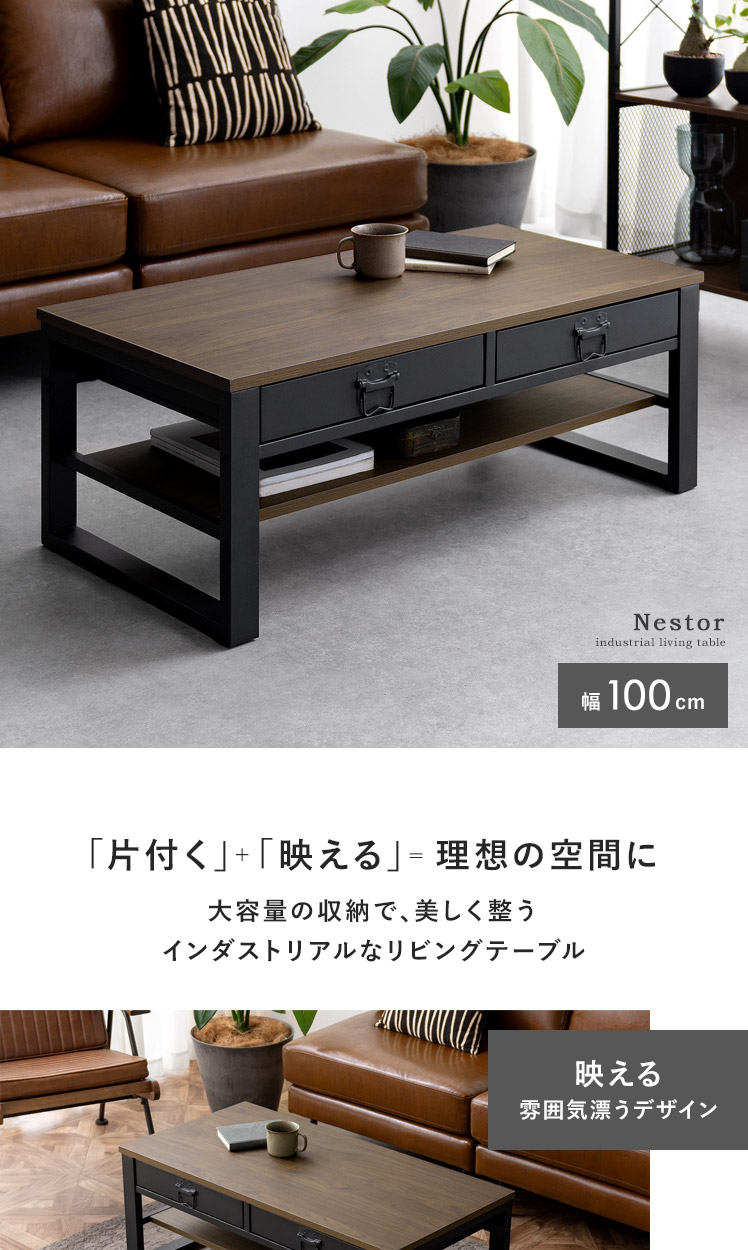 収納付きリビングテーブル Nestor〔ネストル〕/スッキリと片付いた、こだわりコーデのお部屋で、心地よい時間を過ごしたい…。そんな理想を叶えてくれる、高いデザイン性と大容量の収納力を兼ね備えたリビングテーブル。インダストリアルなエッセンスを感じられる、様になるデザインに、リビング周りで使うアイテムをたっぷりしまえる、2杯の引き出しとオープン棚。見栄え良く整った、居心地の良い空間をおつくりします。