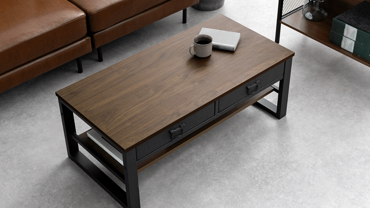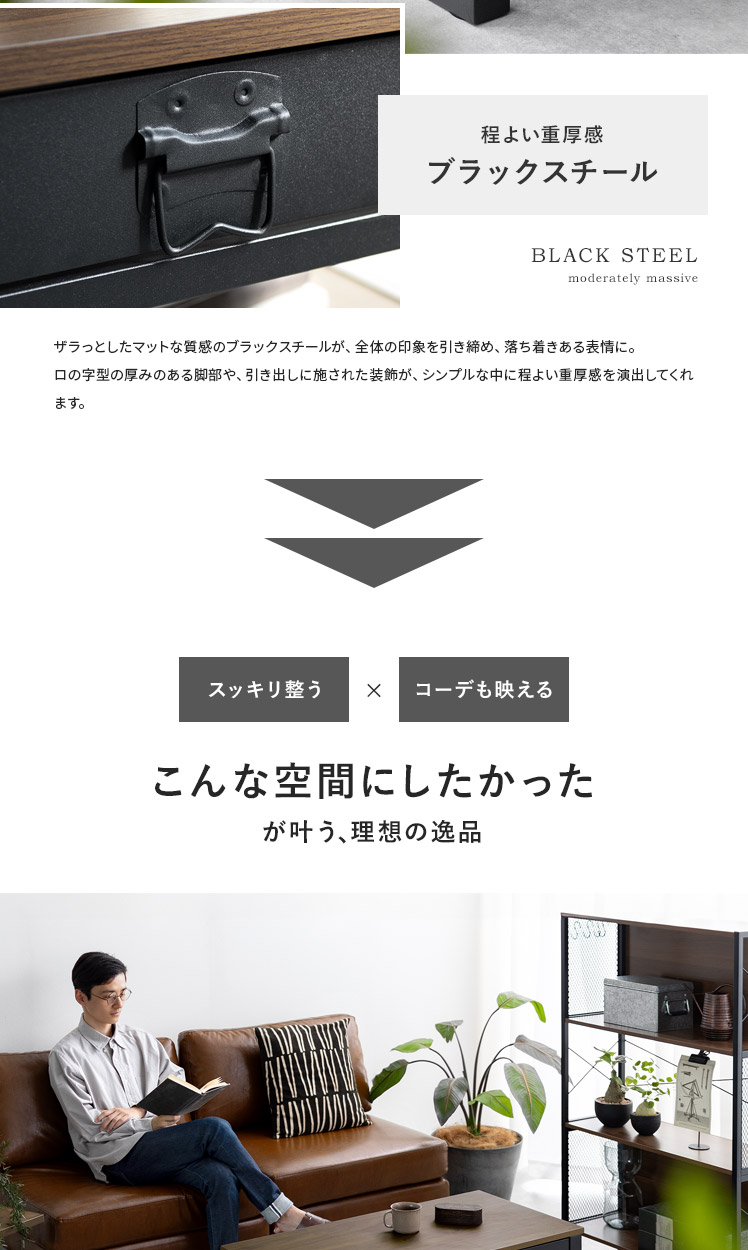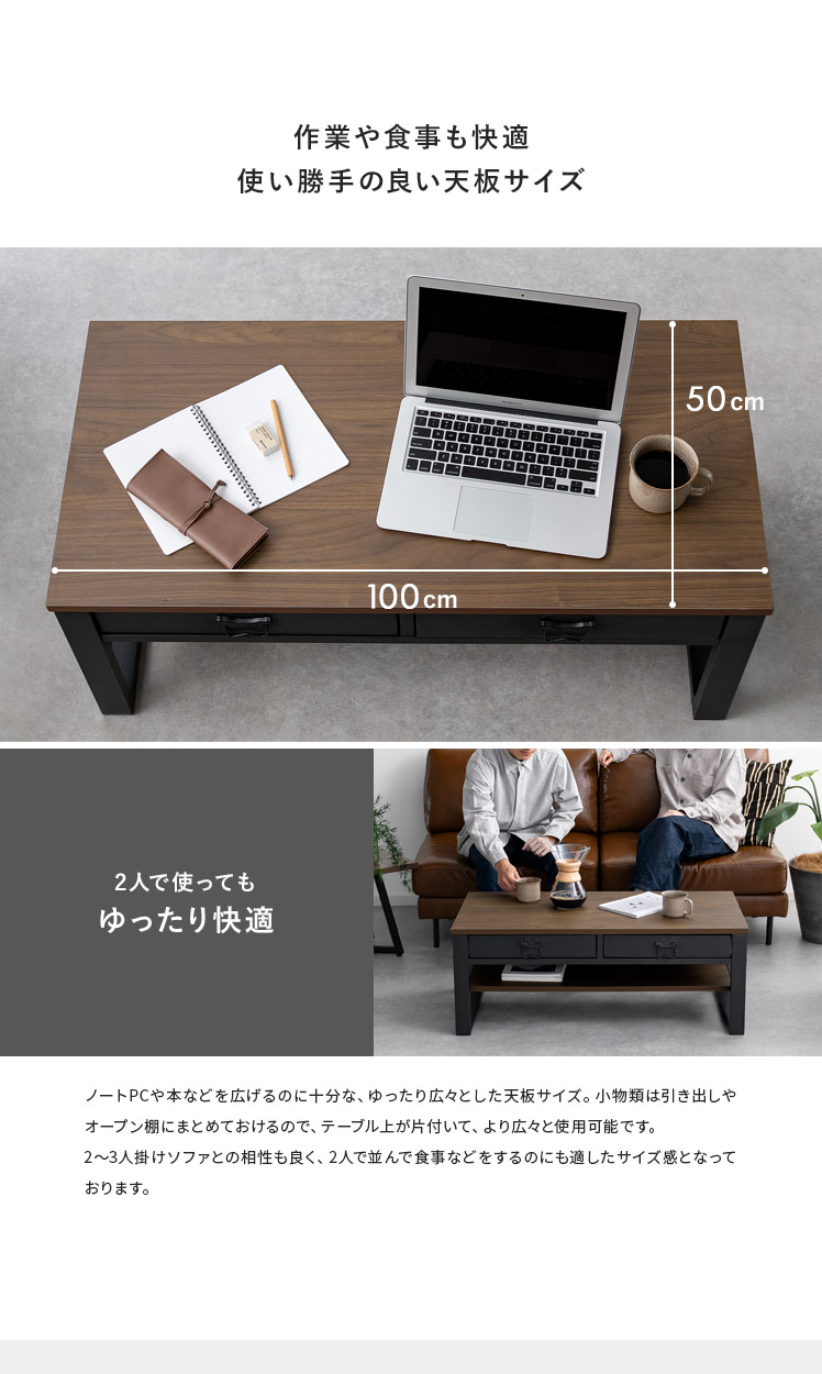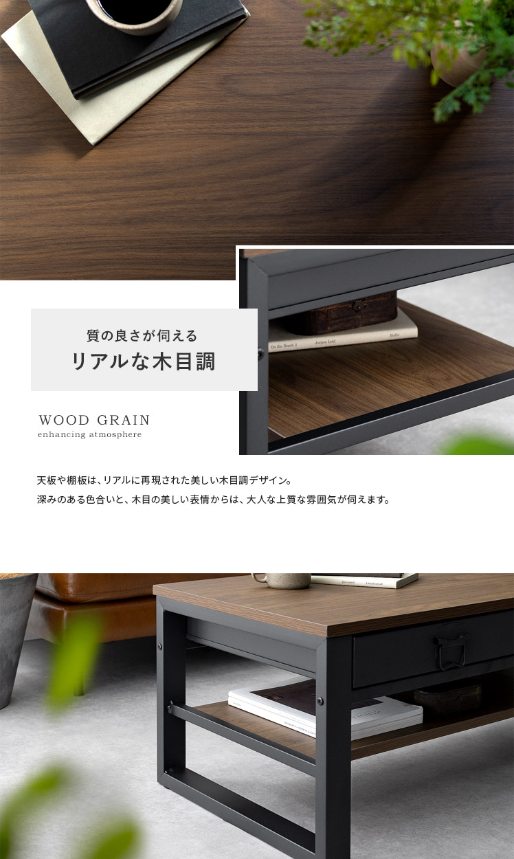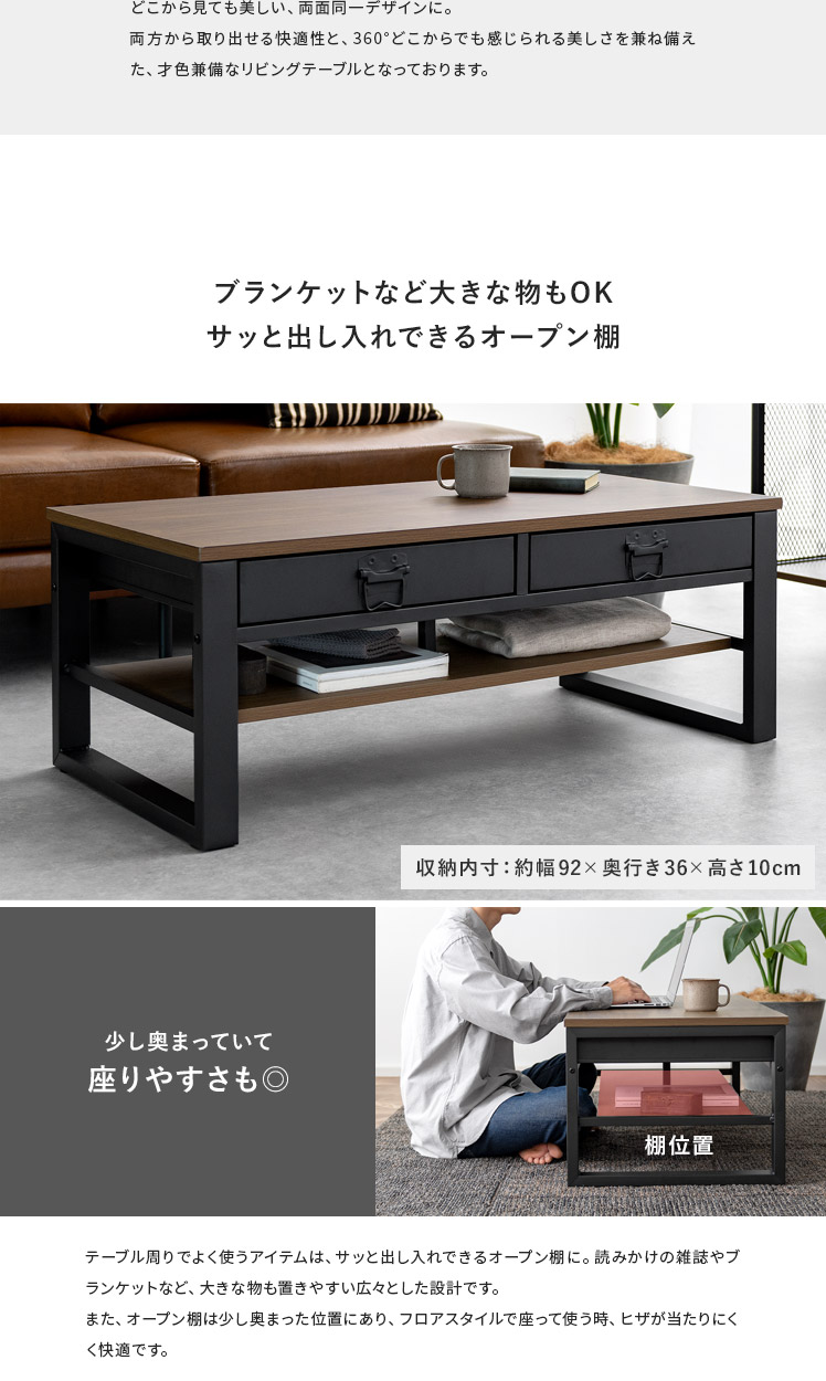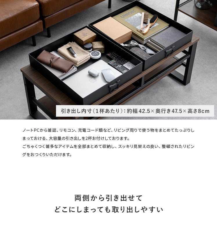 収納付きリビングテーブル Nestor〔ネストル〕/スッキリと片付いた、こだわりコーデのお部屋で、心地よい時間を過ごしたい…。そんな理想を叶えてくれる、高いデザイン性と大容量の収納力を兼ね備えたリビングテーブル。インダストリアルなエッセンスを感じられる、様になるデザインに、リビング周りで使うアイテムをたっぷりしまえる、2杯の引き出しとオープン棚。見栄え良く整った、居心地の良い空間をおつくりします。
