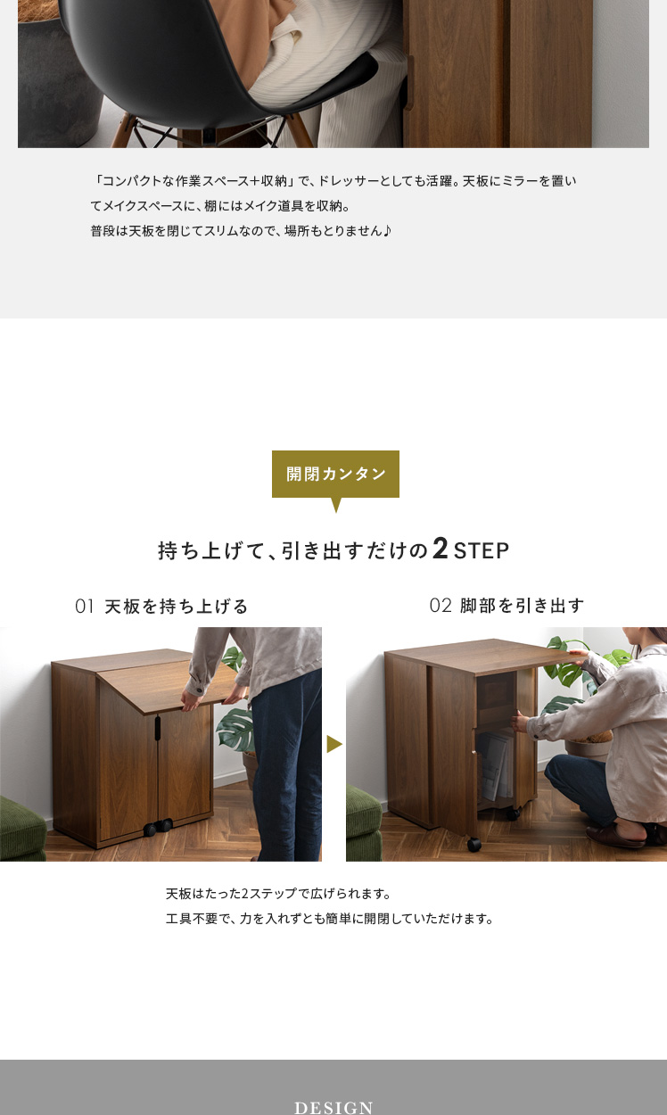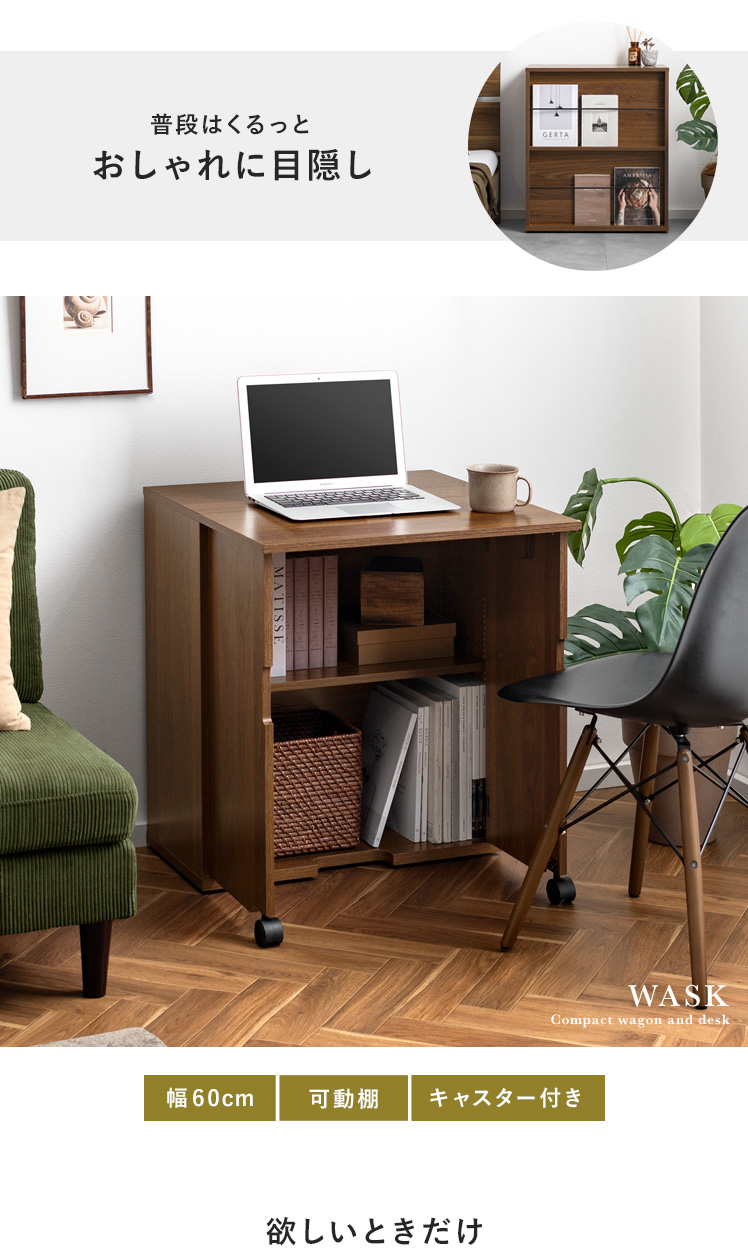 デスクになる折り畳みワゴン WASK〔ワスク〕/欲しいときだけ、天板を広げてデスクになるワゴン。コンパクトな幅約60cmに、作業スペースも収納もギュッと詰め込みました。どこでも置きやすく、キャスター付きで、移動も簡単です。