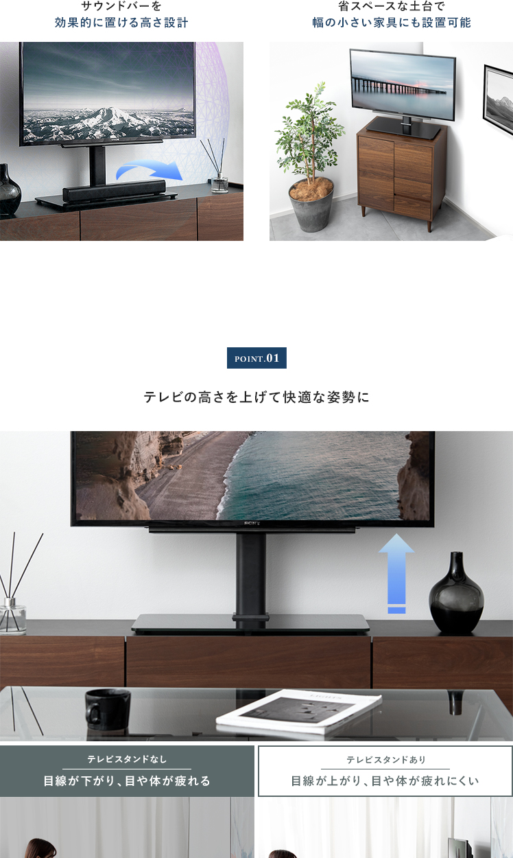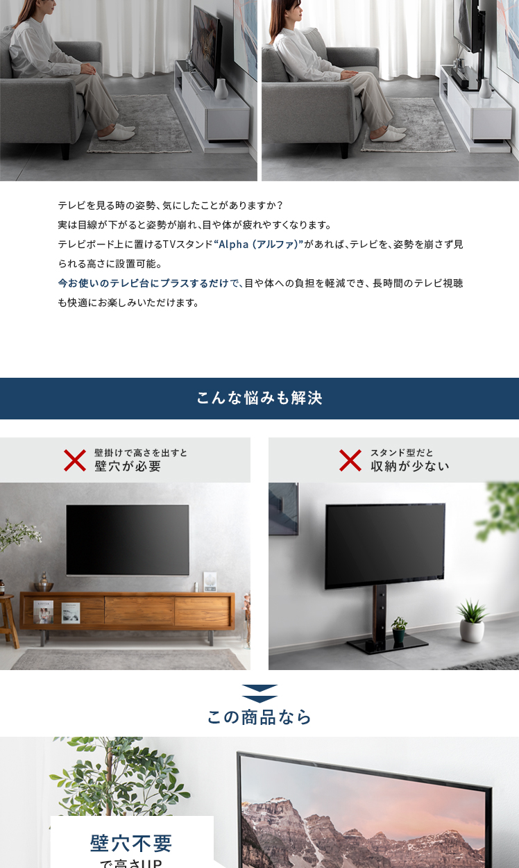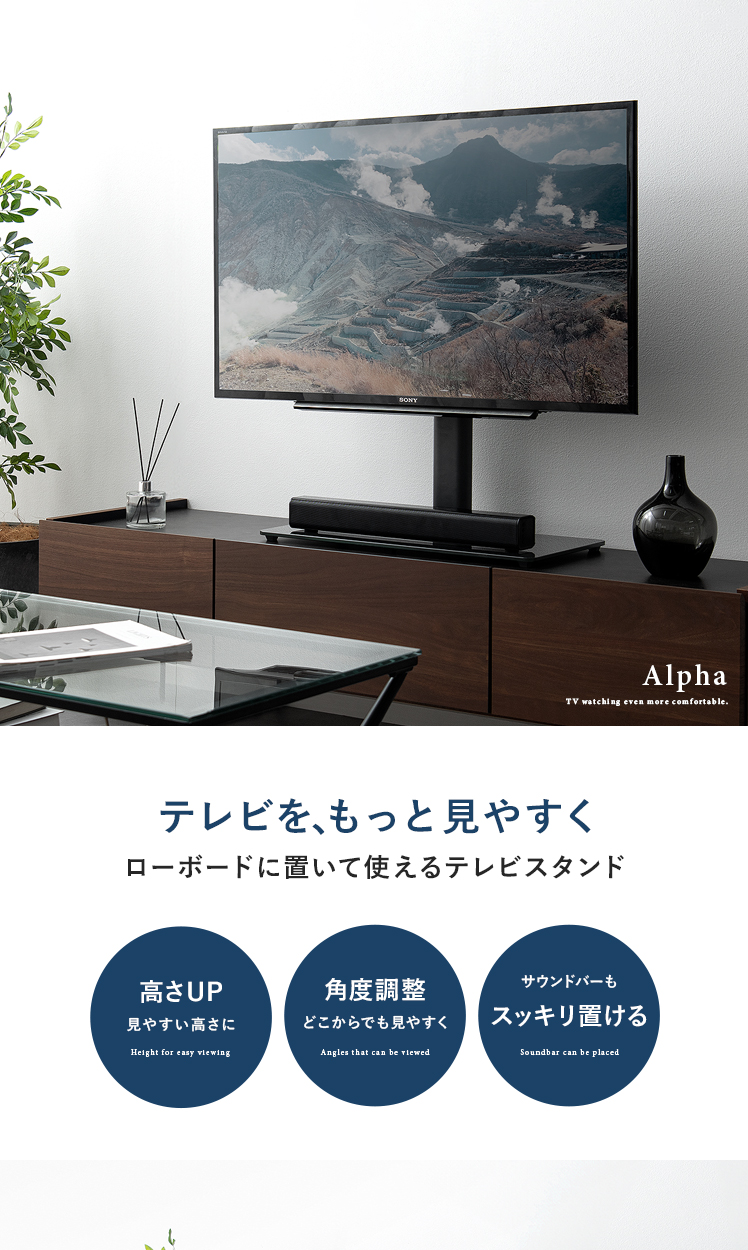 卓上テレビスタンド Alpha〔アルファ〕/お使いのテレビ台にプラスするだけでもっと快適に。ローボードに置いて使える、卓上TVスタンド“Alpha(アルファ)”高さ調整、角度調整が可能で目や体への負担を軽減します。日々のテレビ視聴をより快適に。