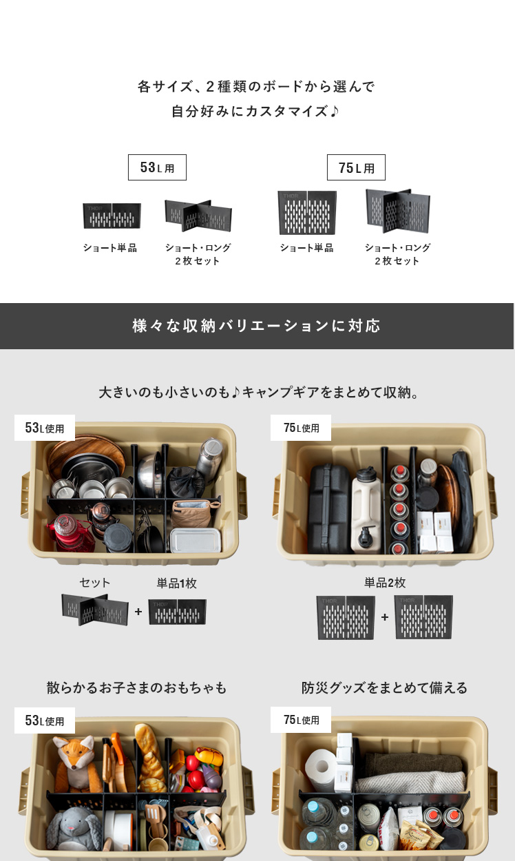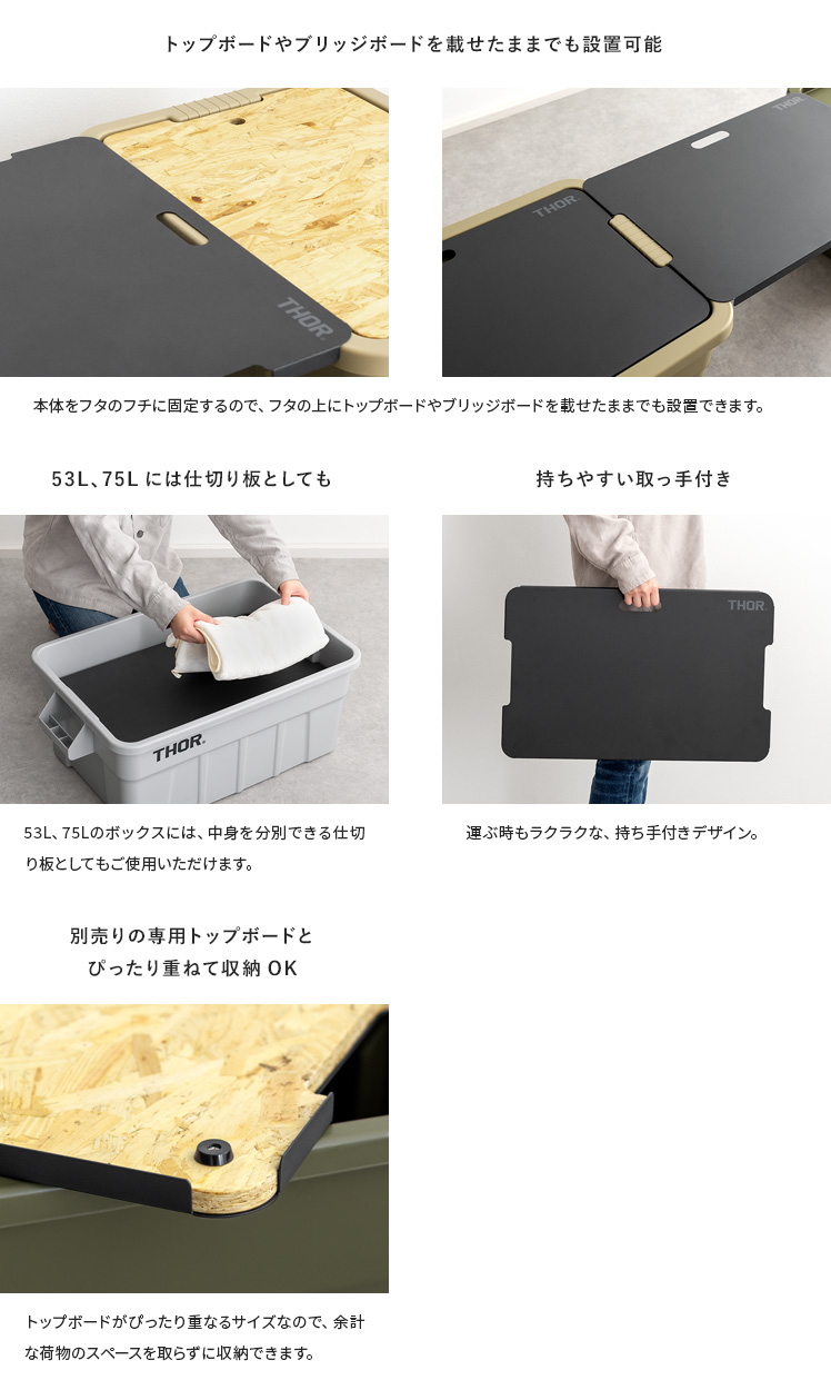 パーテーションボードの長短2枚セットで区切った上部に、「トップボード」「ブリッジボート」を載せれば、コンテナ上部に新たにスペースを作ることも♪ すぐに取り出すものや、薄いギアを収納するのにぴったりです。