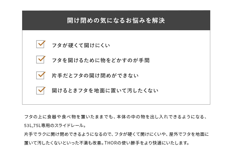 片手でラクに開け閉めできるようになるので、フタが硬くて開けにくいや、屋外でフタを地面に置いて汚したくないといった不満も改善。