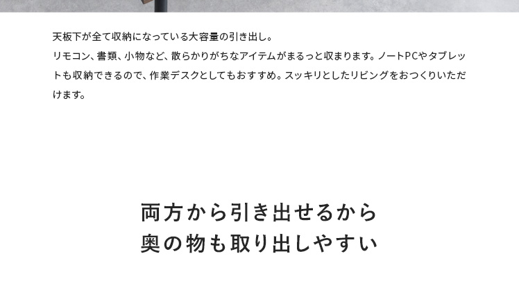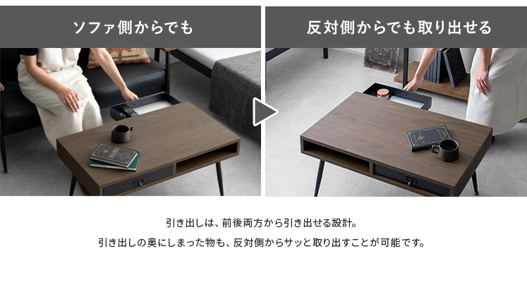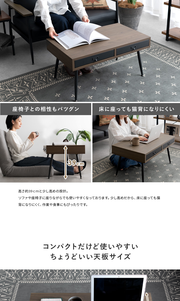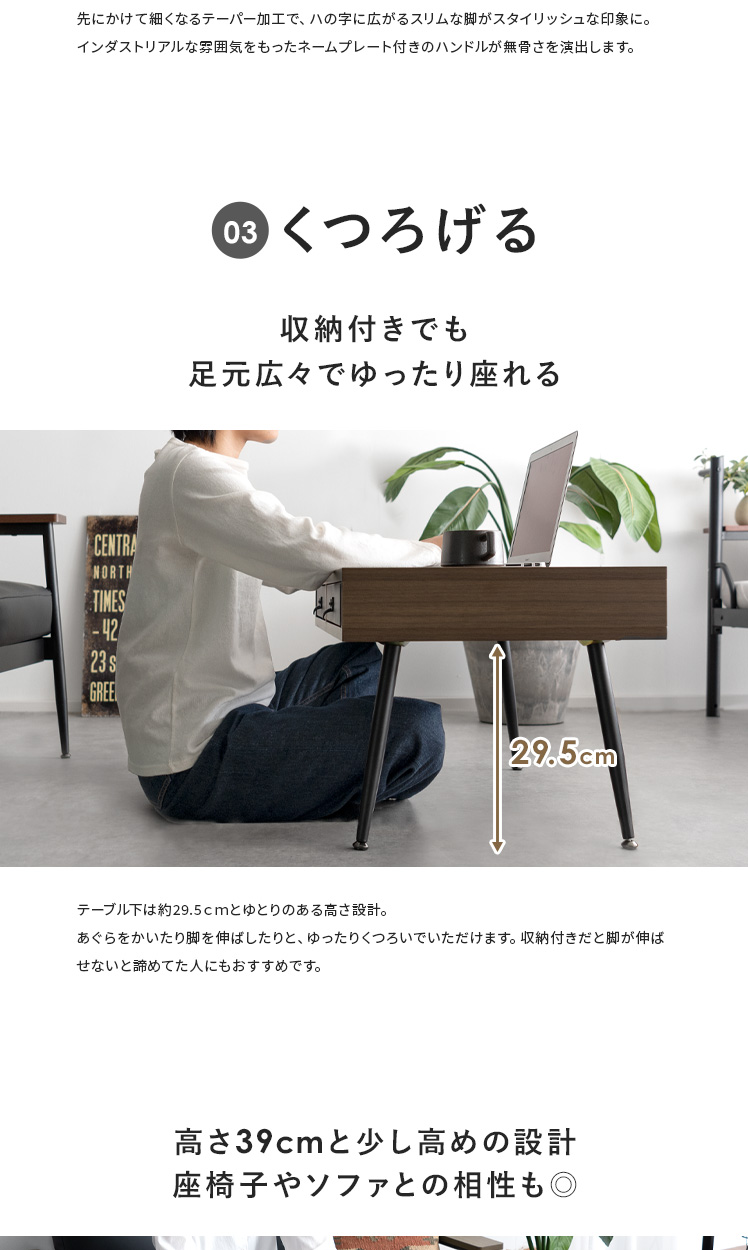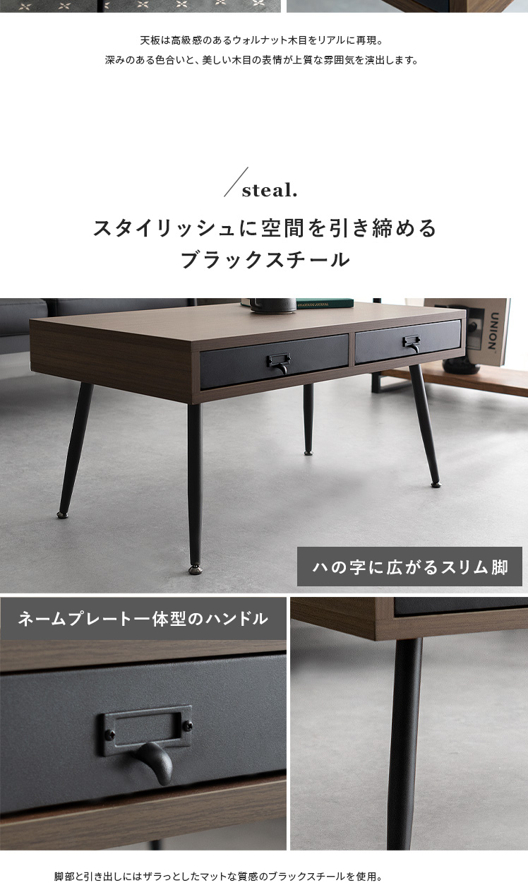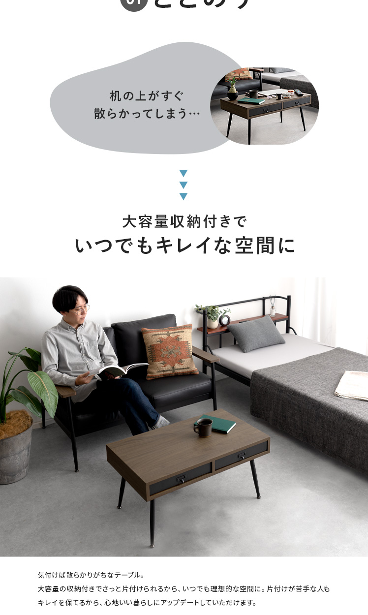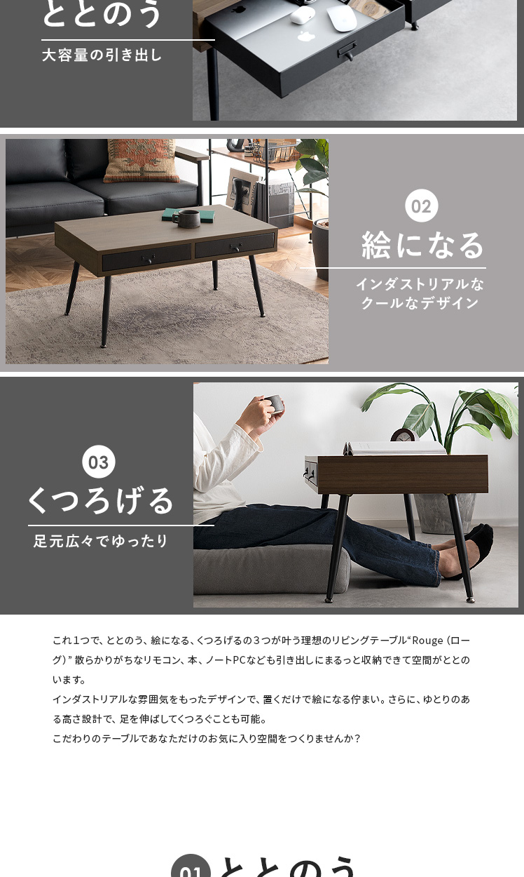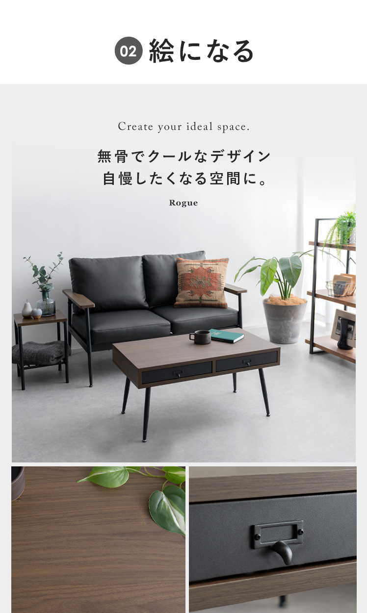 引き出し付きローテーブル Rogue〔ローグ〕/これ1つで、ととのう、絵になる、くつろげるの3つが叶う理想のリビングテーブル“Rouge(ローグ)”散らかりがちなリモコン、本、ノートPCなども引き出しにまるっと収納できて空間がととのいます。インダストリアルな雰囲気をもったデザインで、置くだけで絵になる佇まい。さらに、ゆとりのある高さ設計で、足を伸ばしてくつろぐことも可能。こだわりのテーブルであなただけのお気に入り空間をつくりませんか?