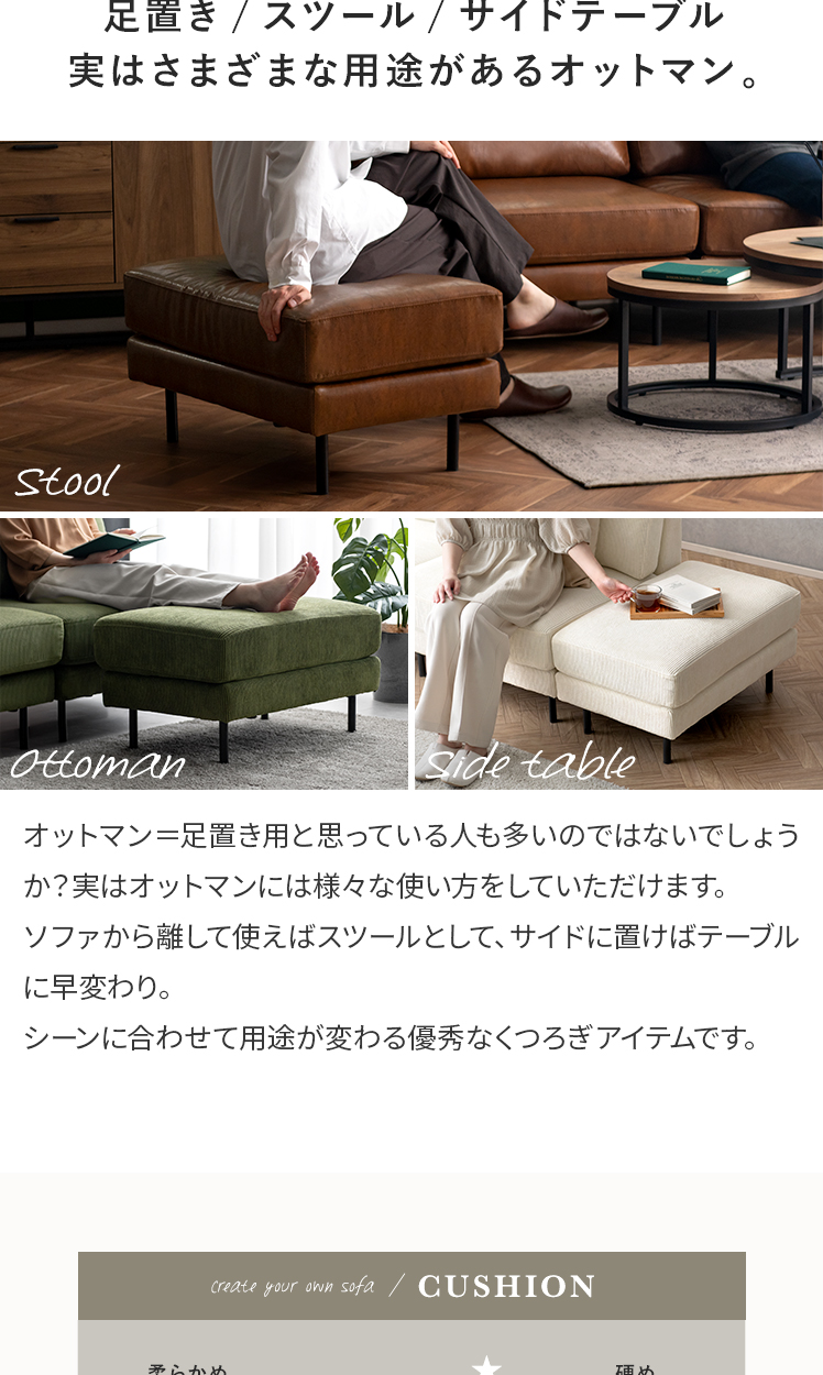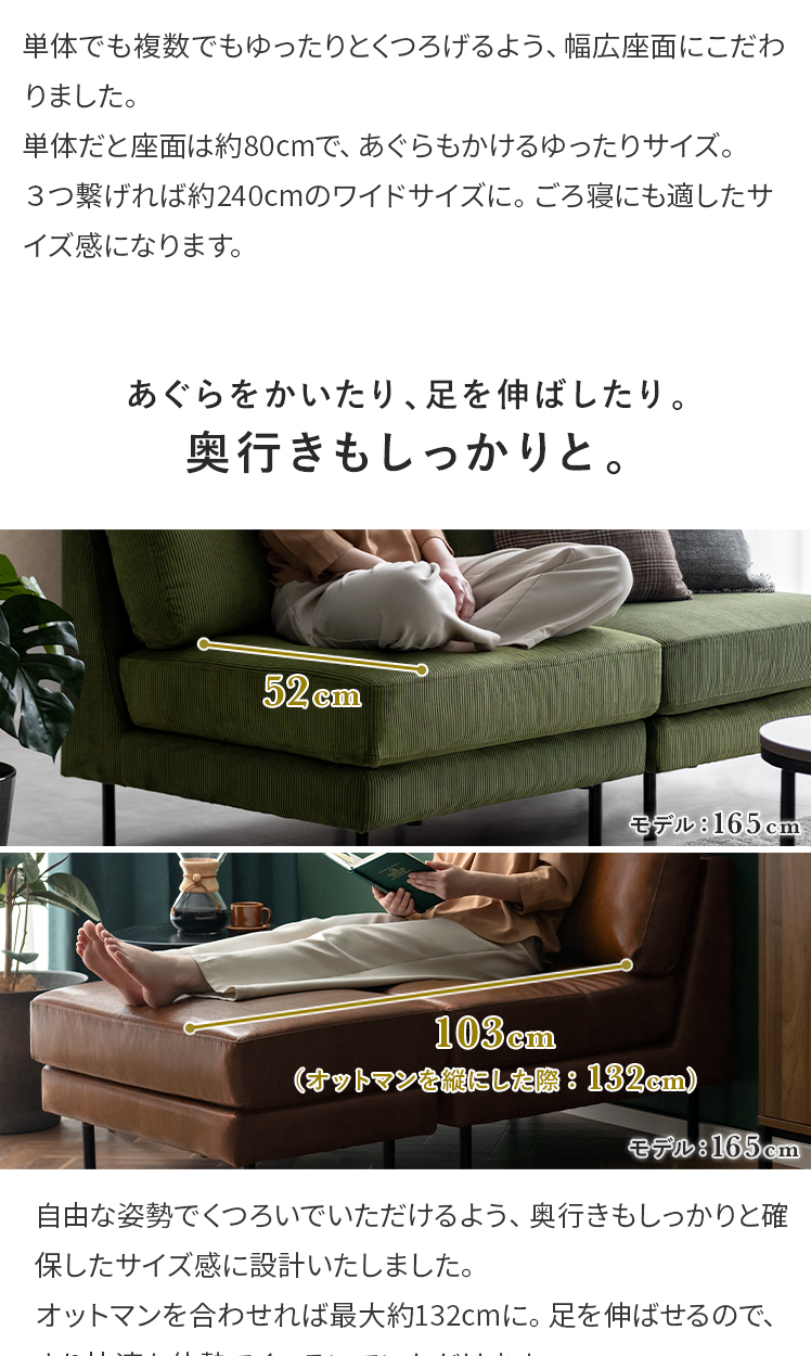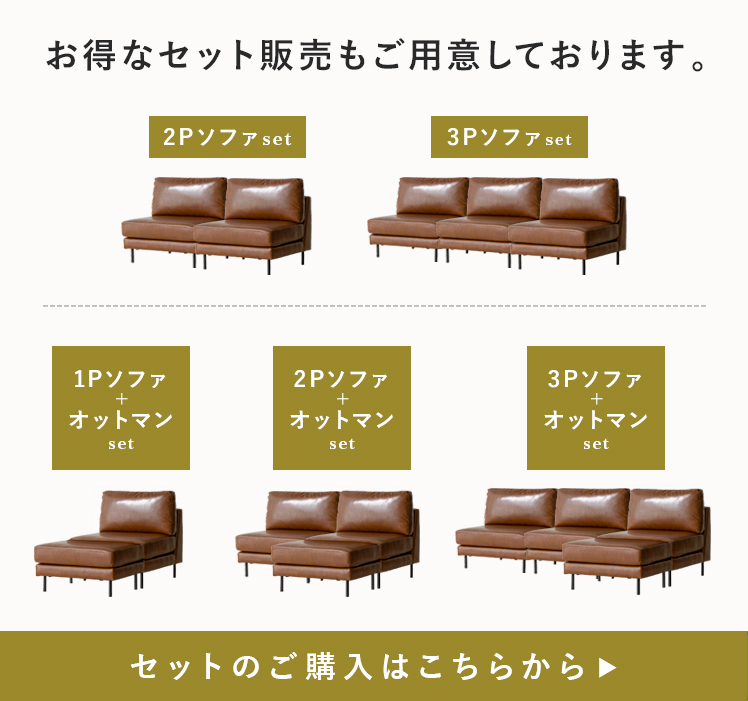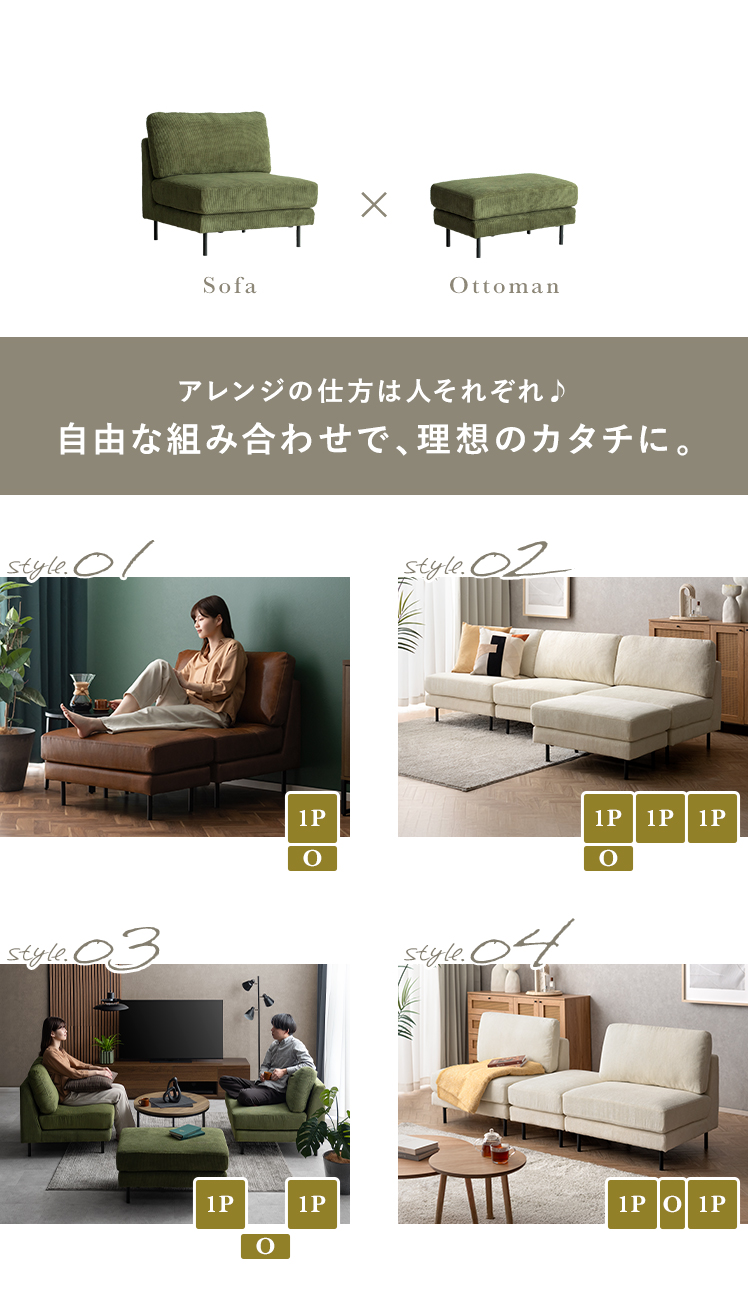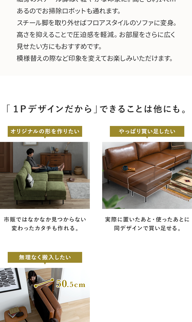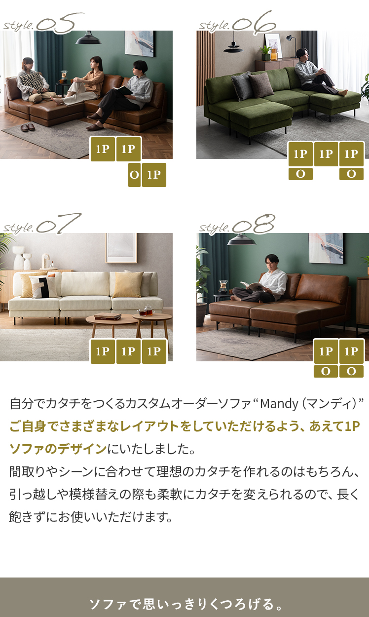 好みの配置でアレンジできるユニットソファMandy〔マンディ〕 3Pソファセット/ご自身でさまざまなレイアウトをしていただけるよう、あえて1Pソファのデザインにいたしました。間取りやシーンに合わせて理想のカタチを作れるのはもちろん、引っ越しや模様替えの際も柔軟にカタチを変えられるので、長く飽きずにお使いいただけます。