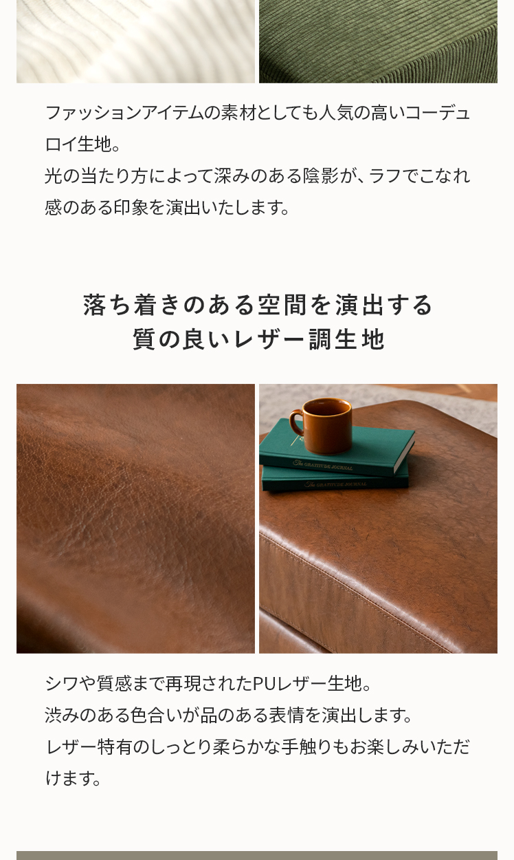 ファブリック レザー コーデュロイ ブラウン グリーン ベージュ アイボリー【公式限定|いつでも3%OFFクーポン対象】