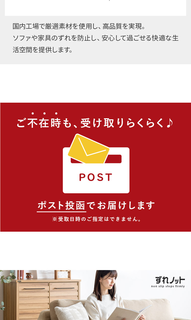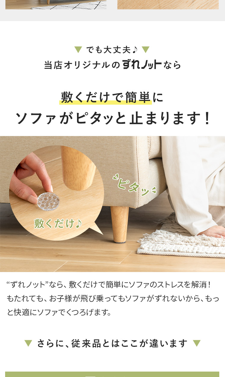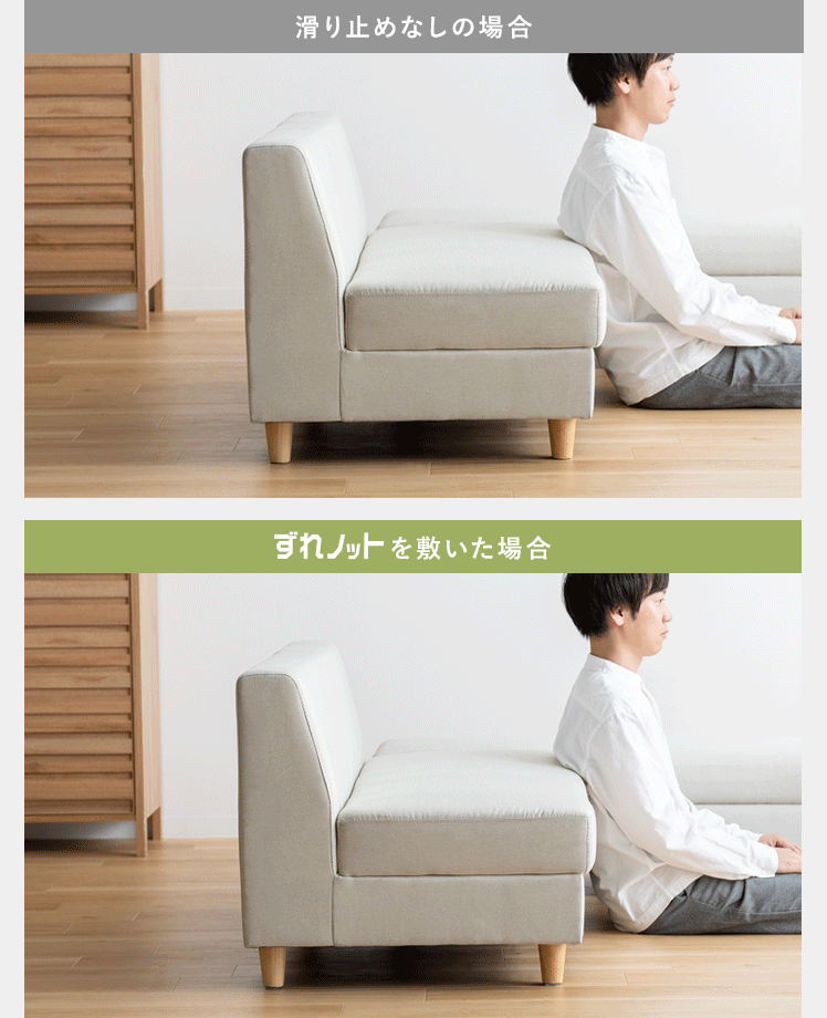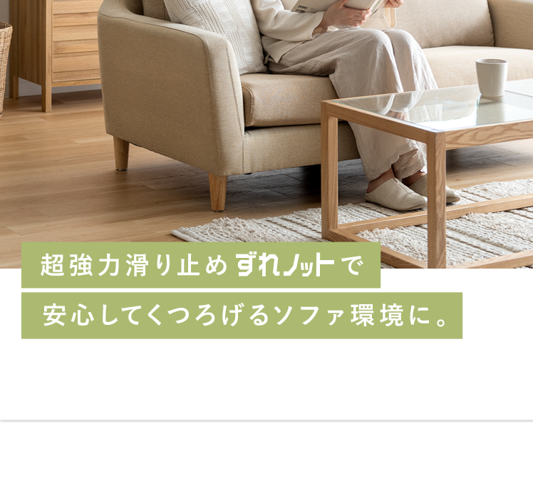超強力滑り止め ずれノット/ソファが滑るのってストレスですよね・・・でも大丈夫♪当店オリジナルのずれノットなら敷くだけで簡単にソファがピタッと止まります!“ずれノット”なら、敷くだけで簡単にソファのストレスを解消!もたれても、お子様が飛び乗ってもソファがずれないから、もっと快適にソファでくつろげます。