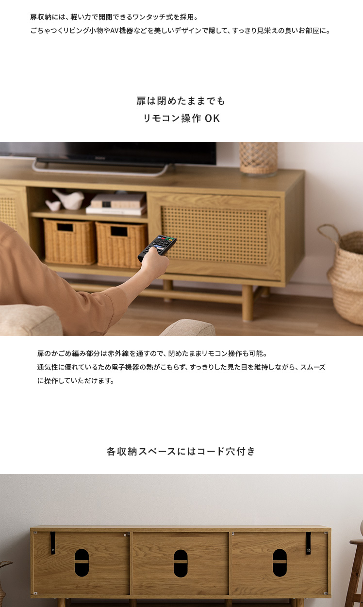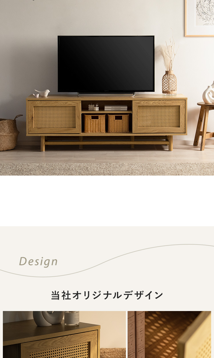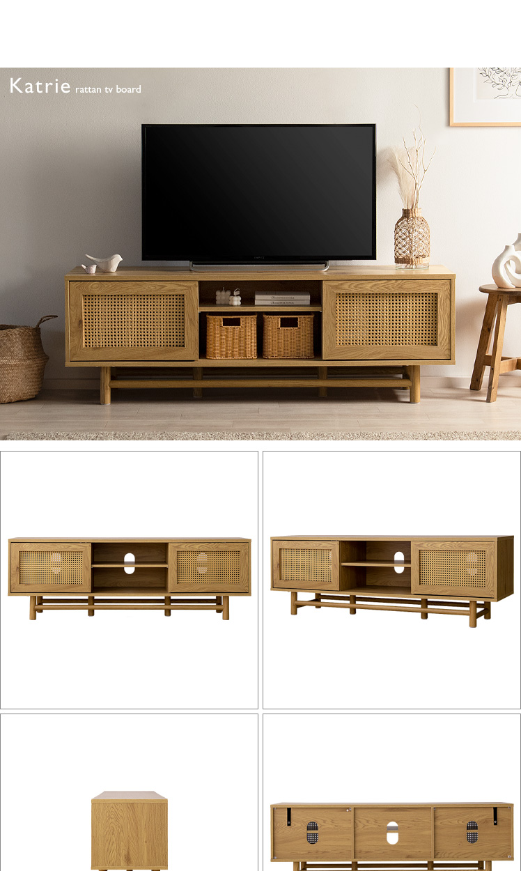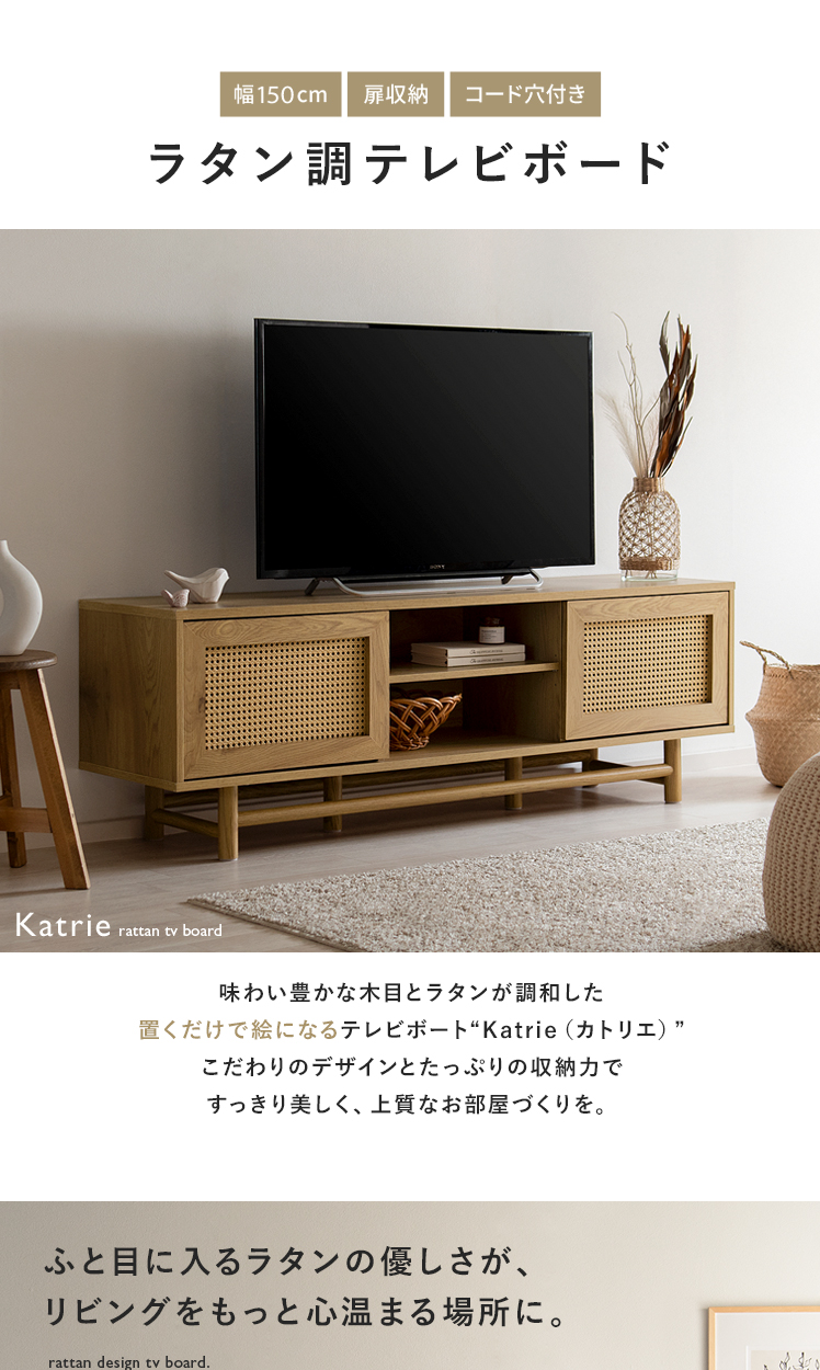 ラタンテレビ台 Katrie〔カトリエ〕/味わい豊かな木目とラタンが調和した、置くだけで絵になるテレビボート“Katrie(カトリエ)”こだわりのデザインとたっぷりの収納力すっきり美しく、上質なお部屋づくりを。