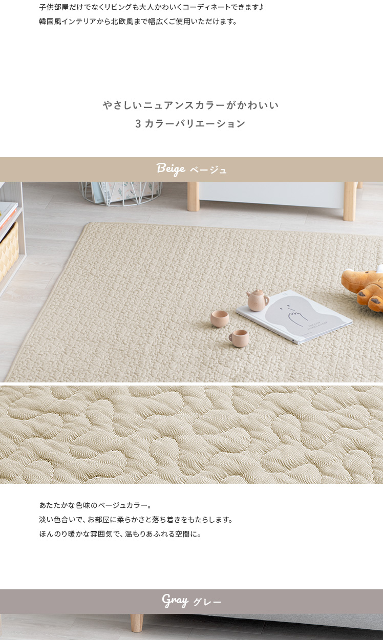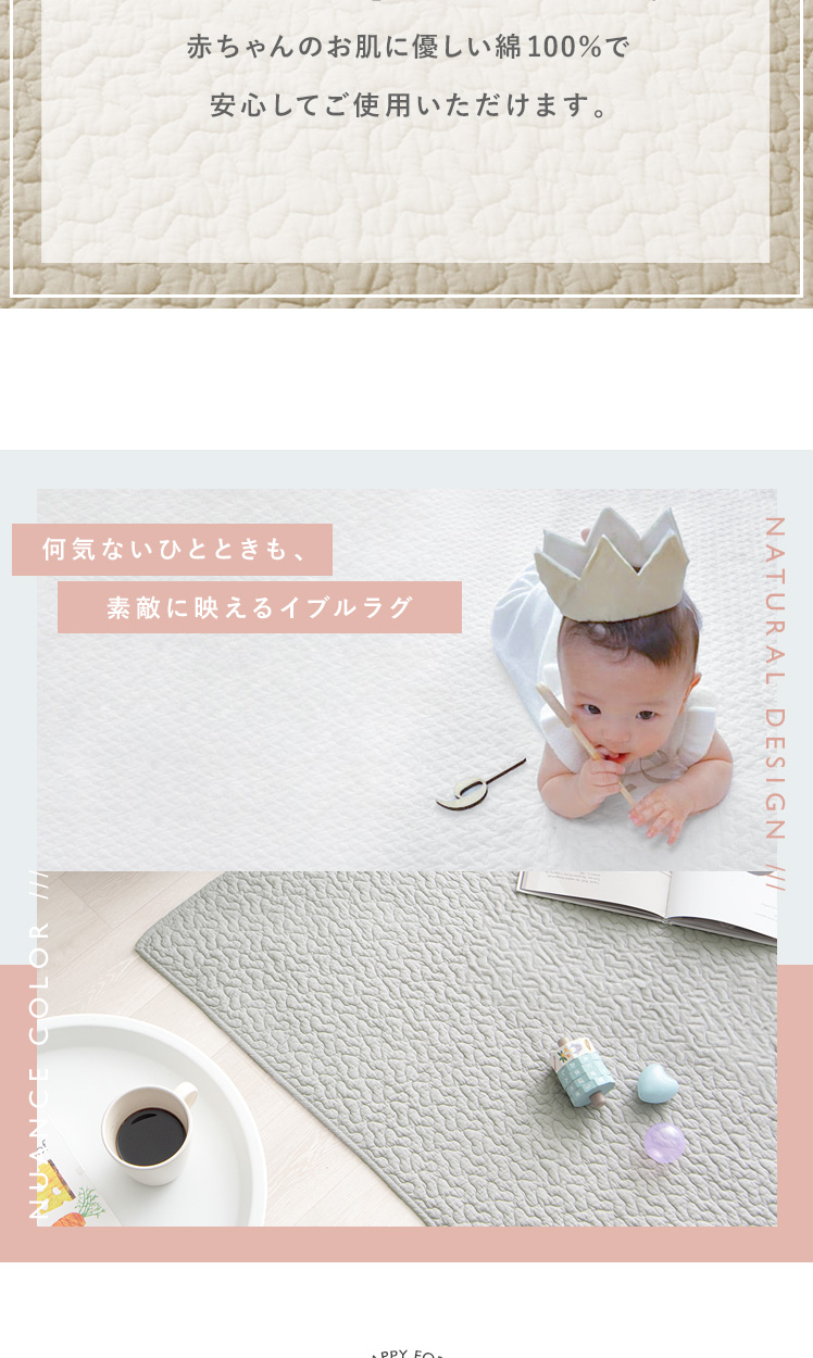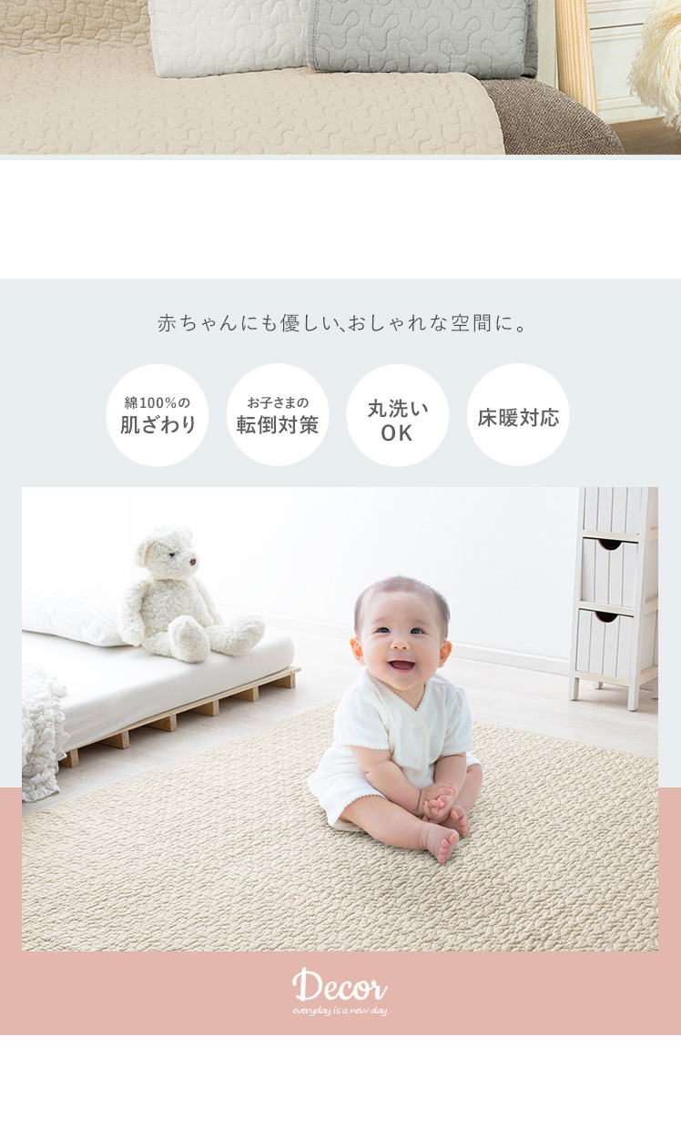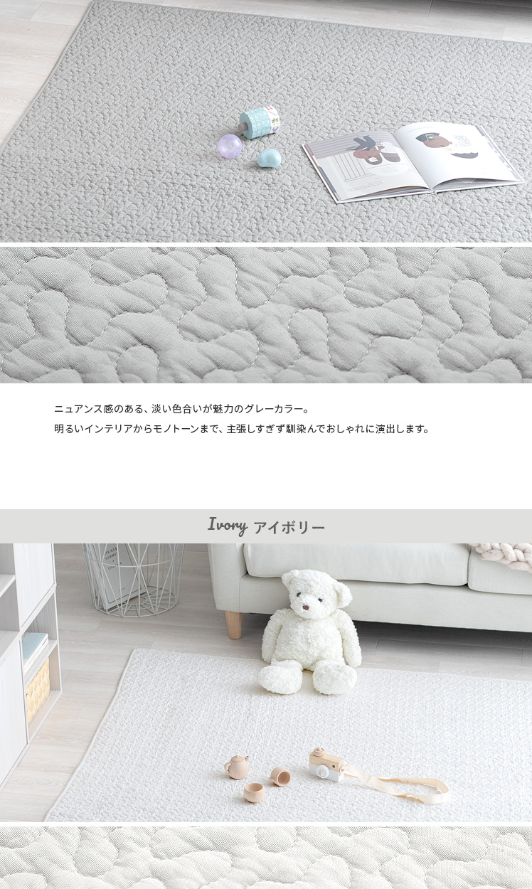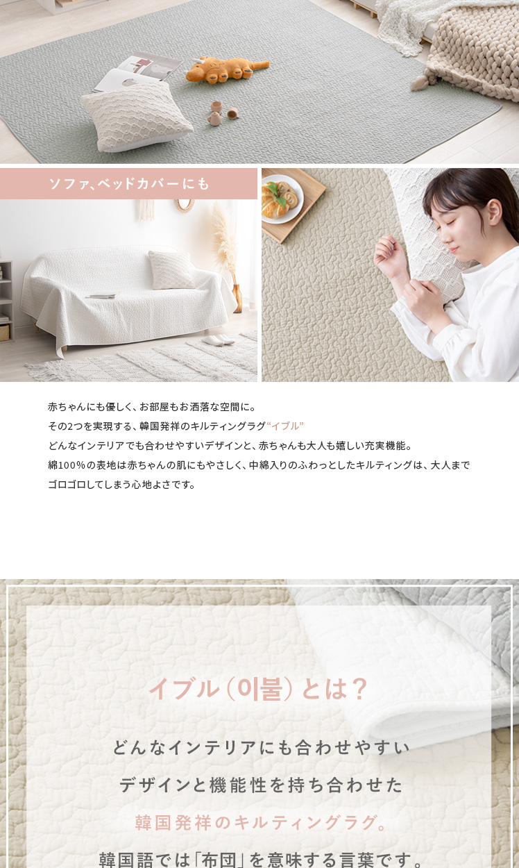 イブルラグ Decor〔デコ〕130×190cm/赤ちゃんにも優しく、お部屋もお洒落な空間に。その2つを実現する、韓国発祥のキルティングラグ“イブル”どんなインテリアでも合わせやすいデザインと、赤ちゃんも大人も嬉しい充実機能。綿100%の表地は赤ちゃんの肌にもやさしく、中綿入りのふわっとしたキルティングは、大人までゴロゴロしてしまう心地よさです。