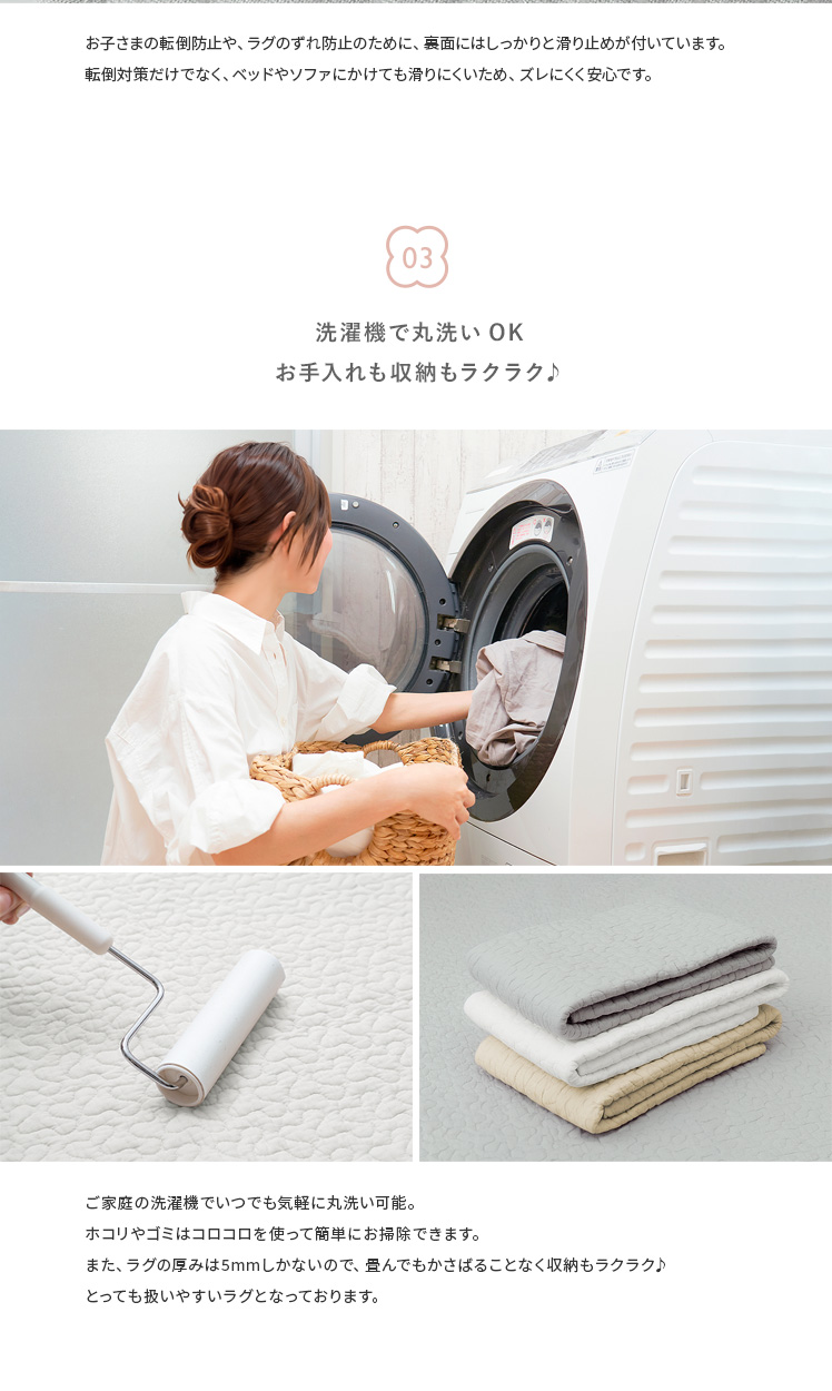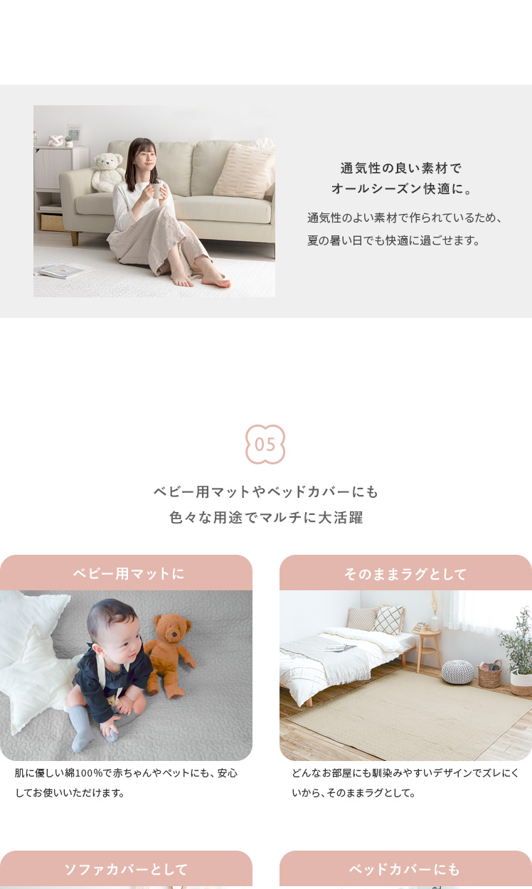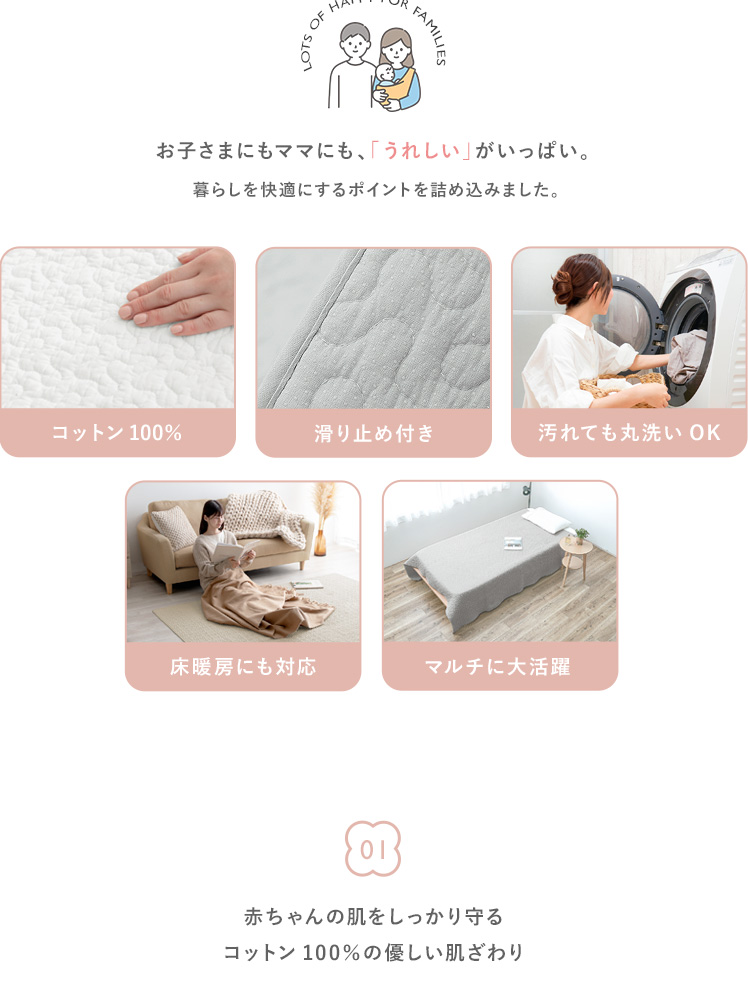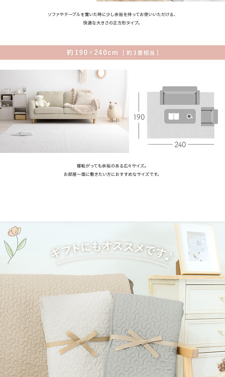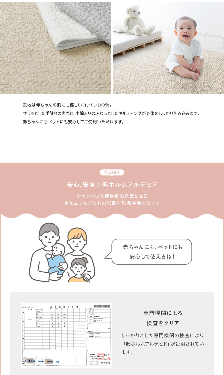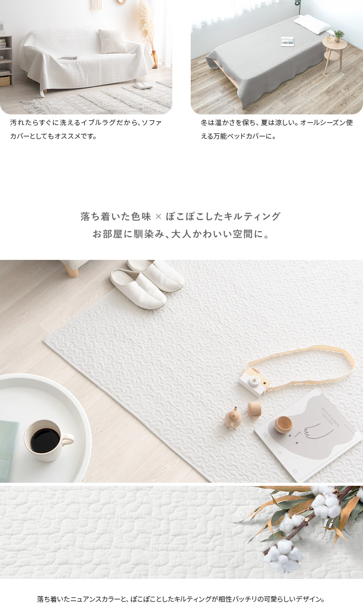 イブルラグ Decor〔デコ〕130×190cm/赤ちゃんにも優しく、お部屋もお洒落な空間に。その2つを実現する、韓国発祥のキルティングラグ“イブル”どんなインテリアでも合わせやすいデザインと、赤ちゃんも大人も嬉しい充実機能。綿100%の表地は赤ちゃんの肌にもやさしく、中綿入りのふわっとしたキルティングは、大人までゴロゴロしてしまう心地よさです。