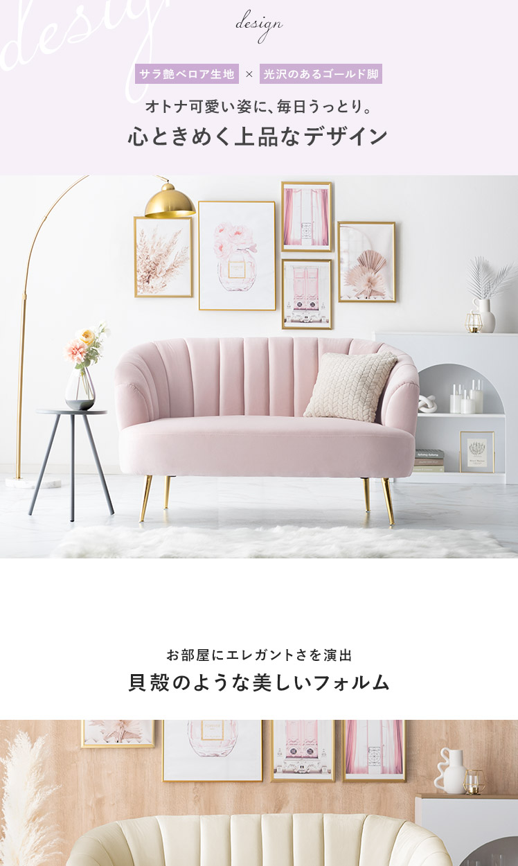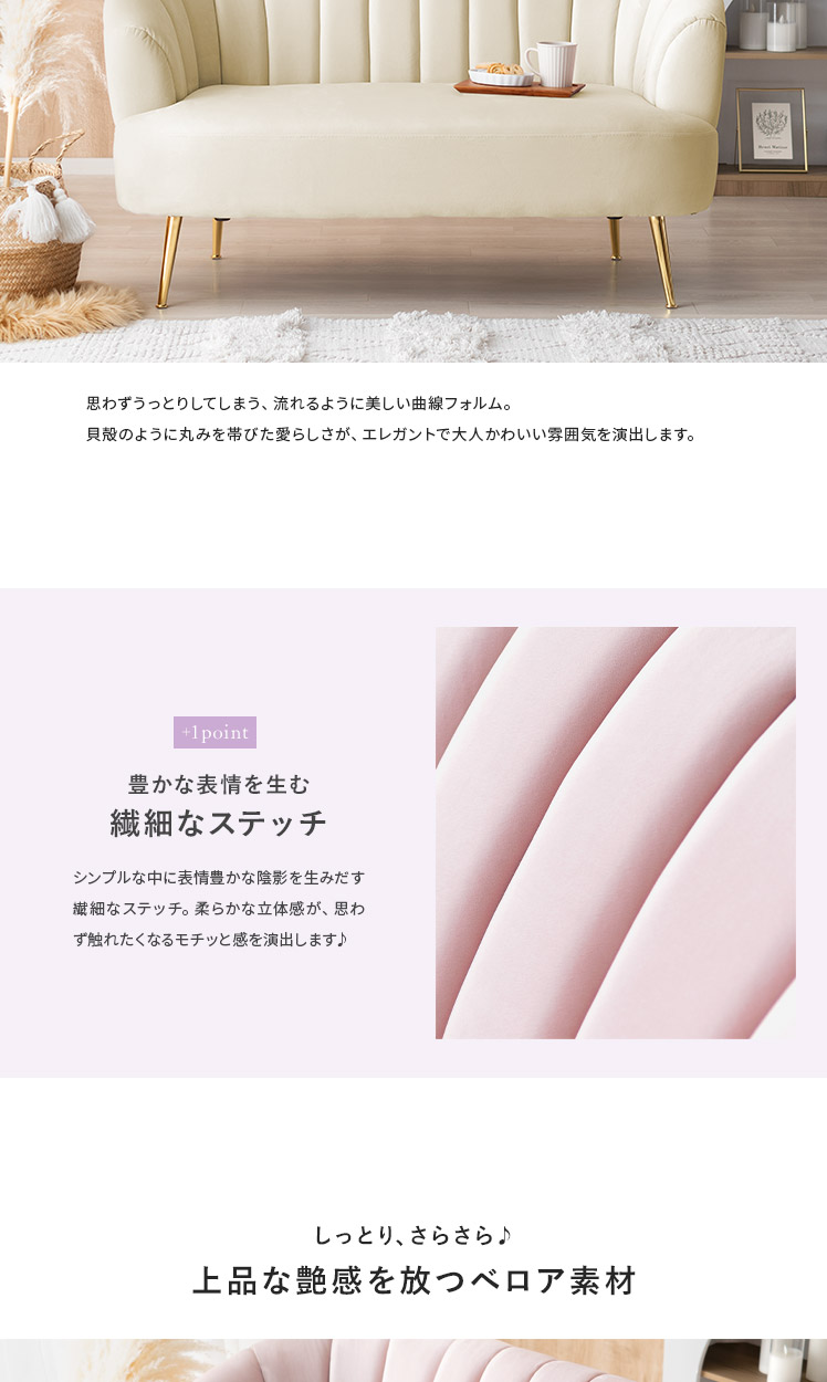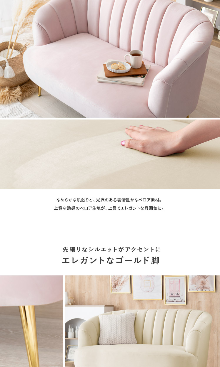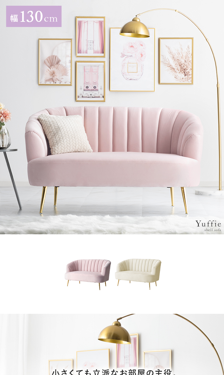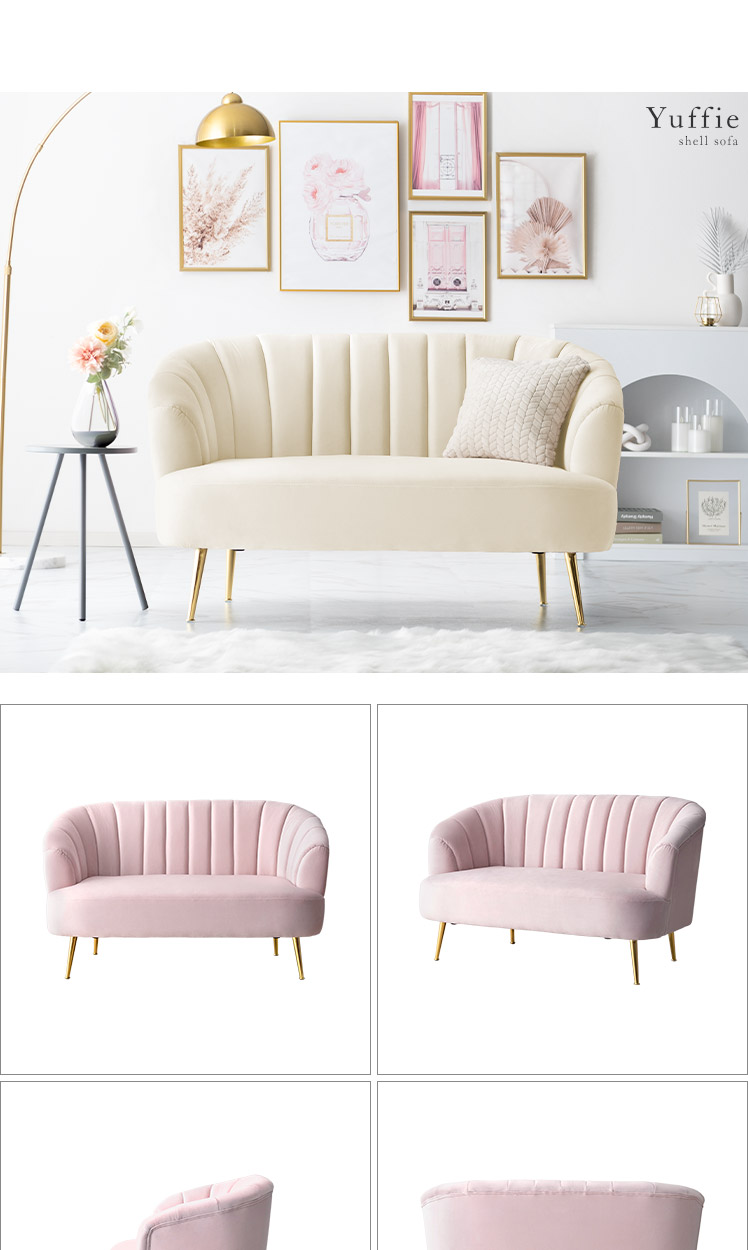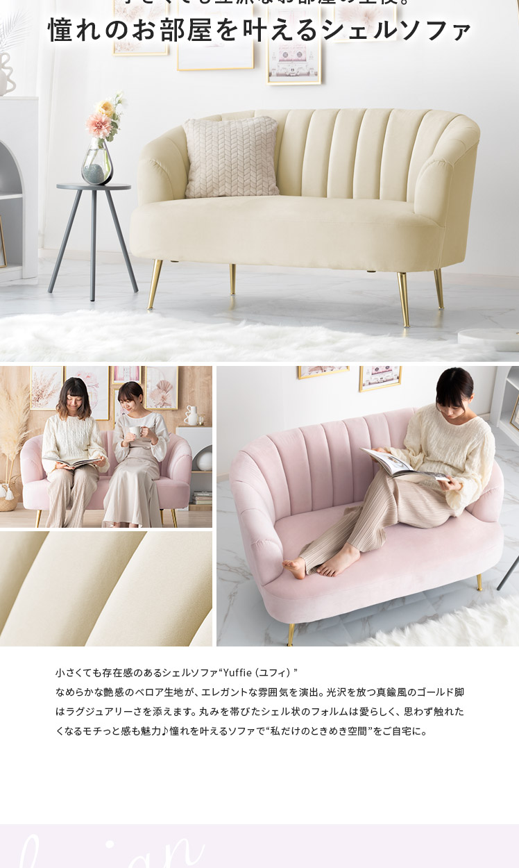 2人掛けシェルソファ Yuffie〔ユフィ〕/小さくても存在感のあるシェルソファ“Yuffie(ユフィ)”なめらかな艶感のベロア生地が、エレガントな雰囲気を演出。光沢を放つ真鍮風のゴールド脚はラグジュアリーさを添えます。丸みを帯びたシェル状のフォルムは愛らしく、思わず触れたくなるモチっと感も魅力♪憧れを叶えるソファで“私だけのときめき空間”をご自宅に。
