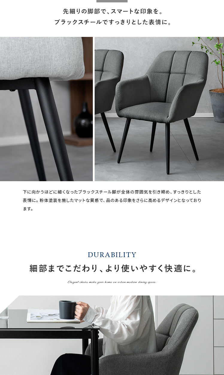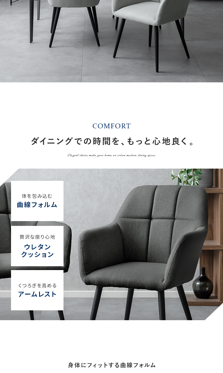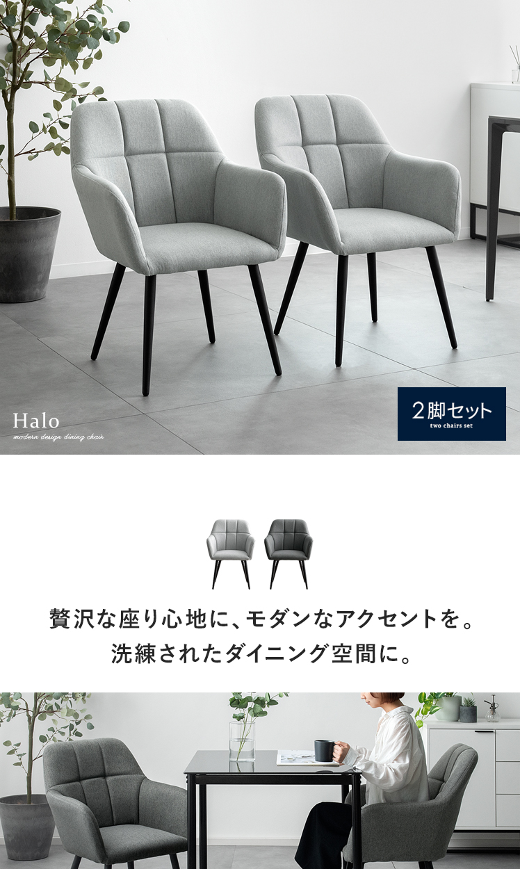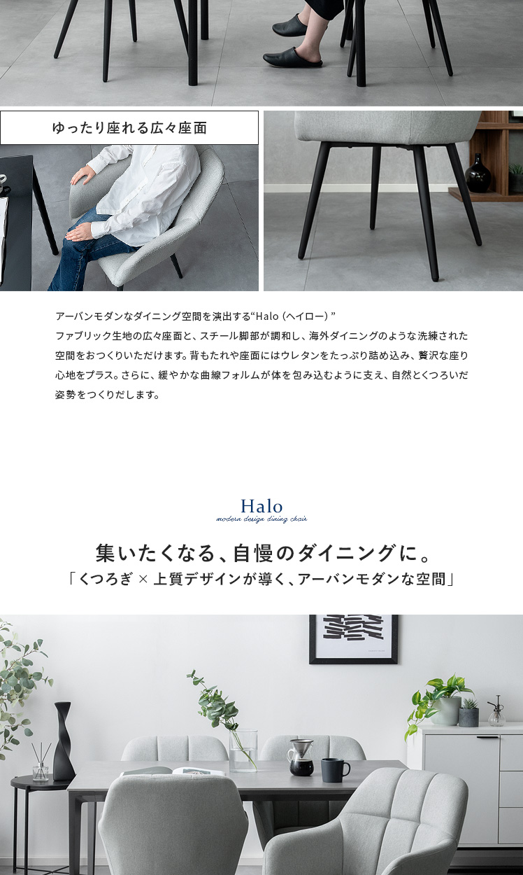 ダイニングチェア Halo〔ヘイロー〕 2脚セット/アーバンモダンなダイニング空間を演出する“Halo(ヘイロー)”ファブリック生地の広々座面と、スチール脚部が調和し、海外ダイニングのような洗練された空間をおつくりいただけます。背もたれや座面にはウレタンをたっぷり詰め込み、贅沢な座り心地をプラス。さらに、緩やかな曲線フォルムが体を包み込むように支え、自然とくつろいだ姿勢をつくりだします。