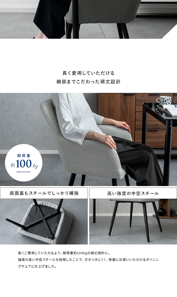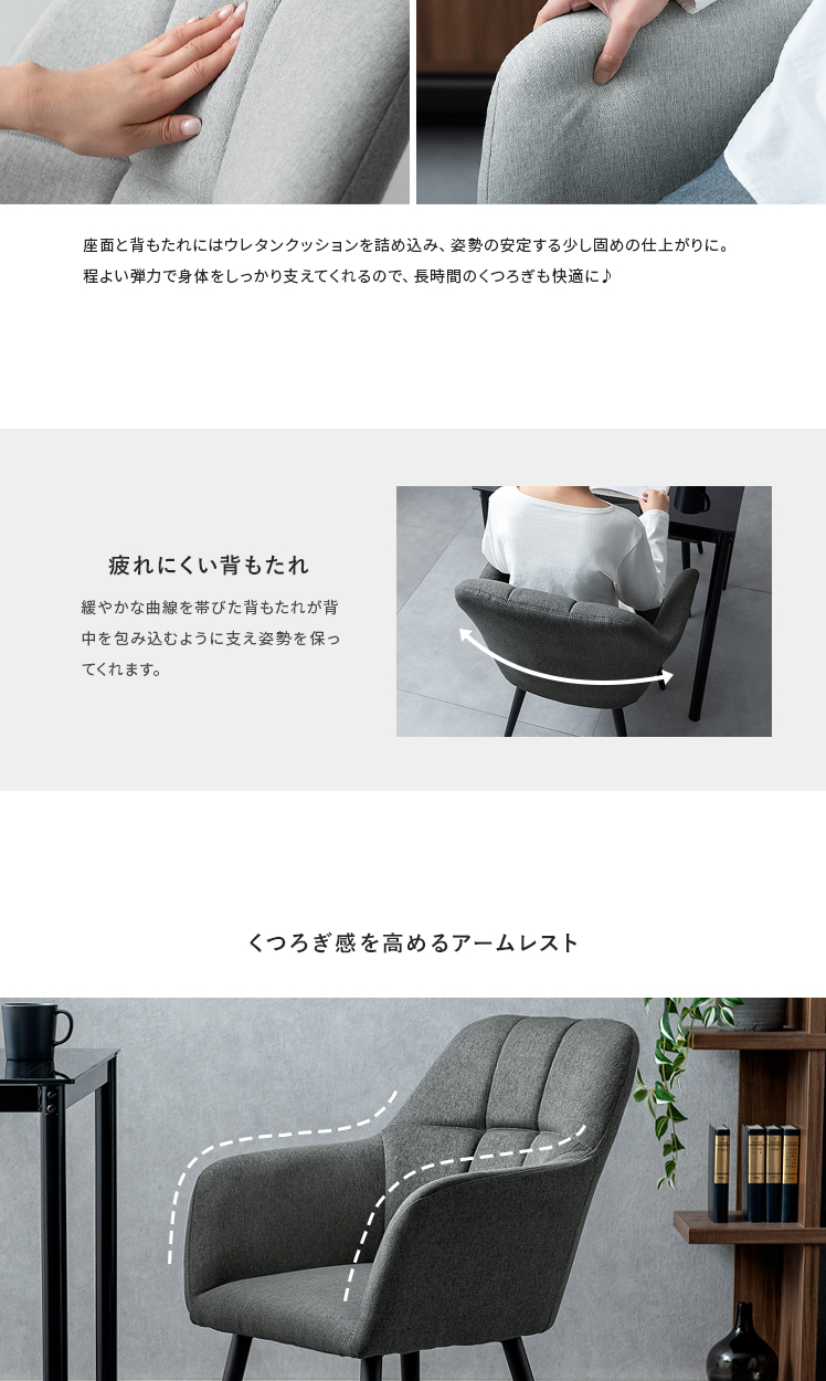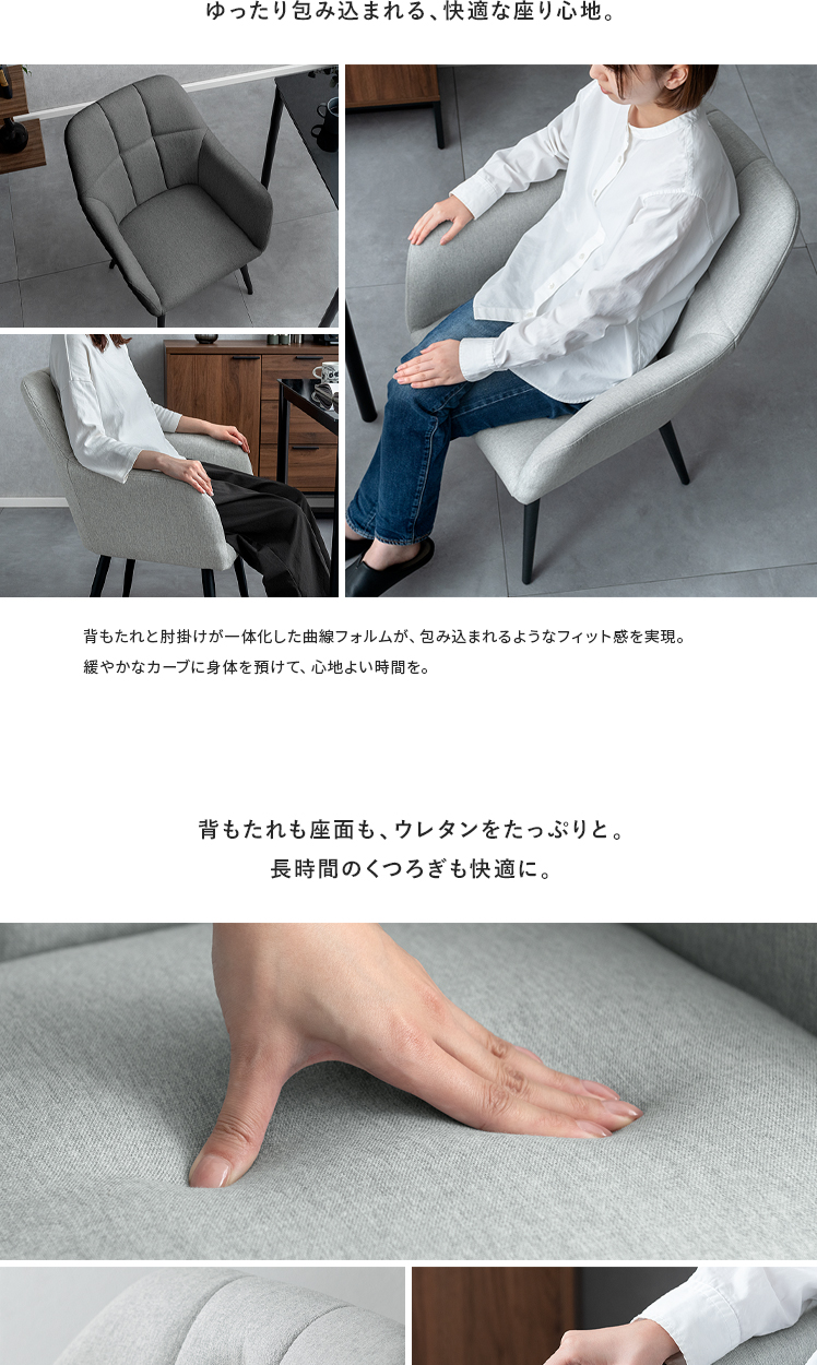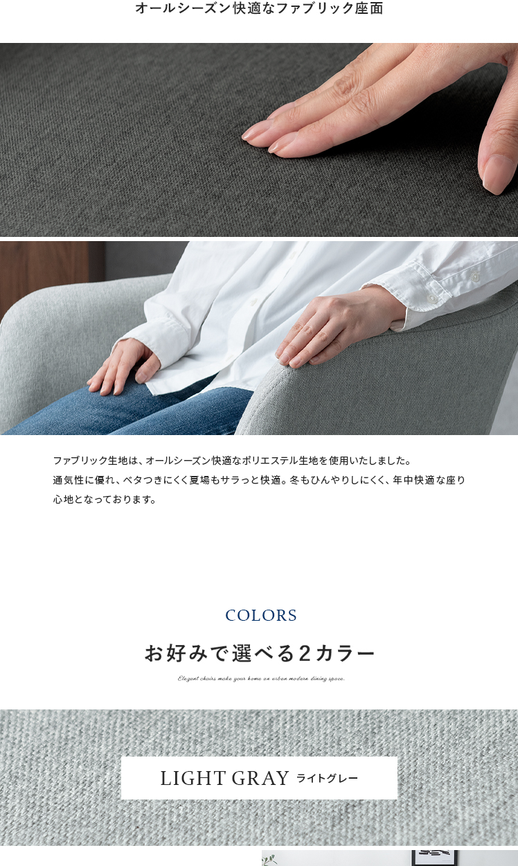 ダイニングチェア Halo〔ヘイロー〕 2脚セット/アーバンモダンなダイニング空間を演出する“Halo(ヘイロー)”ファブリック生地の広々座面と、スチール脚部が調和し、海外ダイニングのような洗練された空間をおつくりいただけます。背もたれや座面にはウレタンをたっぷり詰め込み、贅沢な座り心地をプラス。さらに、緩やかな曲線フォルムが体を包み込むように支え、自然とくつろいだ姿勢をつくりだします。
