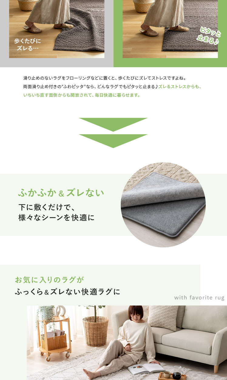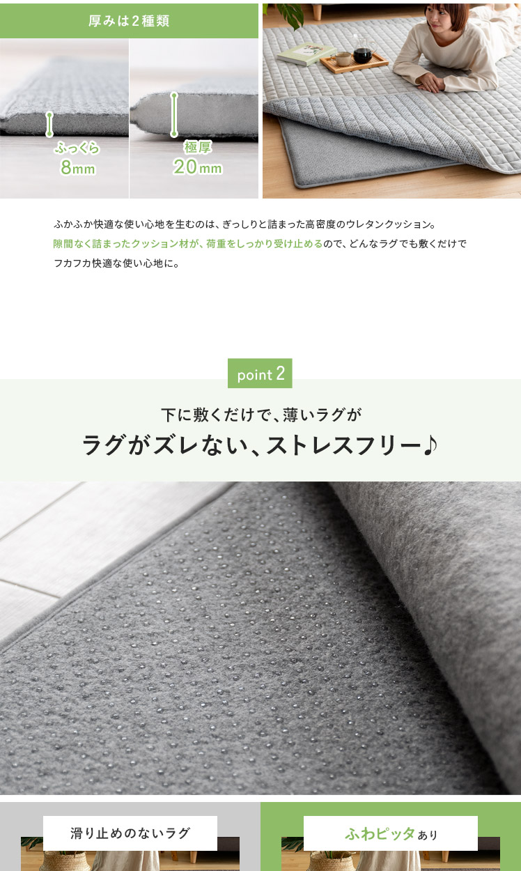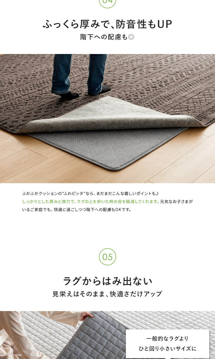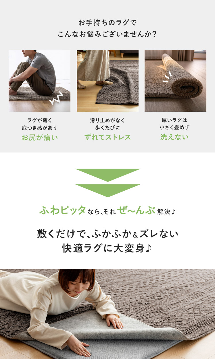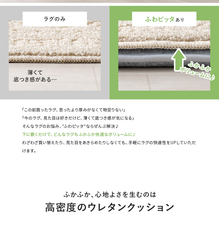 アンダーラグ ふわピッタ 170×170cm 8mm厚タイプ/「この前買ったラグ、思ったより厚みがなくて物足りない」「今のラグ、見た目は好きだけど、薄くて底つき感が気になる」そんなラグのお悩み、“ふわピッタ”ならぜんぶ解決♪下に敷くだけで、どんなラグもふかふか快適なボリュームに♪わざわざ買い替えたり、見た目をあきらめたりしなくても、手軽にラグの快適性をUPしていただけます。