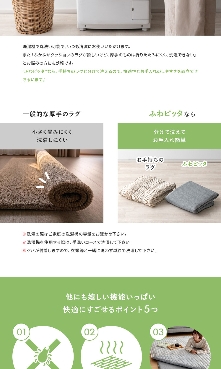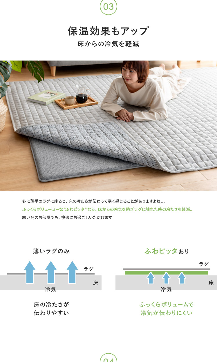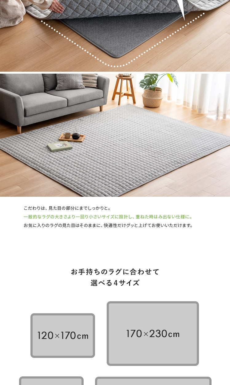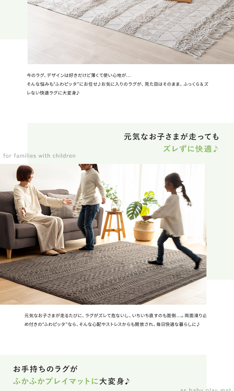 アンダーラグ ふわピッタ 170×170cm 8mm厚タイプ/「この前買ったラグ、思ったより厚みがなくて物足りない」「今のラグ、見た目は好きだけど、薄くて底つき感が気になる」そんなラグのお悩み、“ふわピッタ”ならぜんぶ解決♪下に敷くだけで、どんなラグもふかふか快適なボリュームに♪わざわざ買い替えたり、見た目をあきらめたりしなくても、手軽にラグの快適性をUPしていただけます。