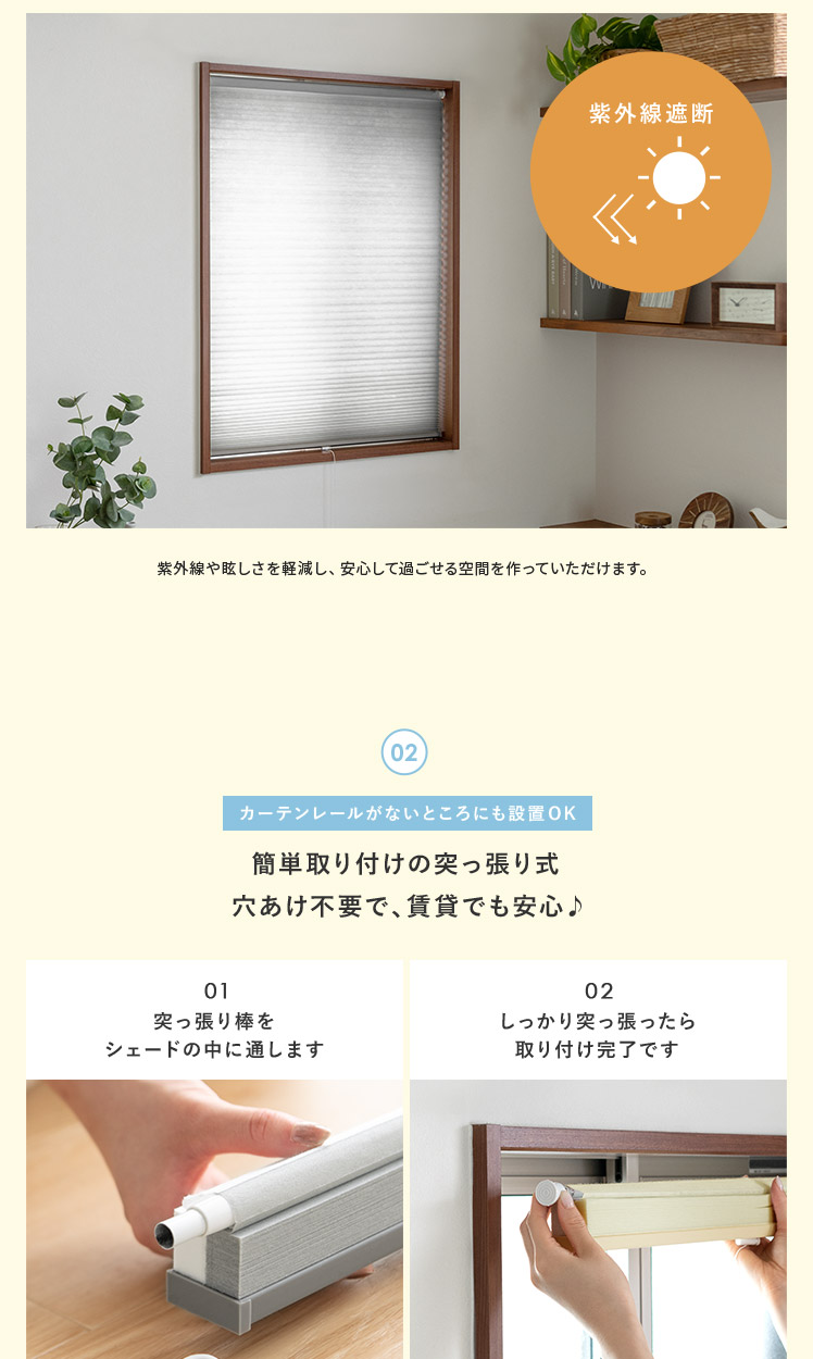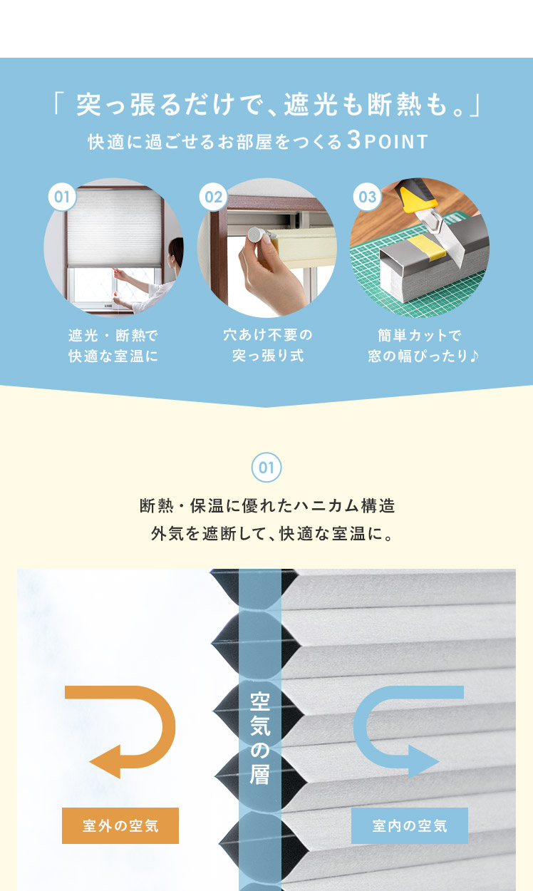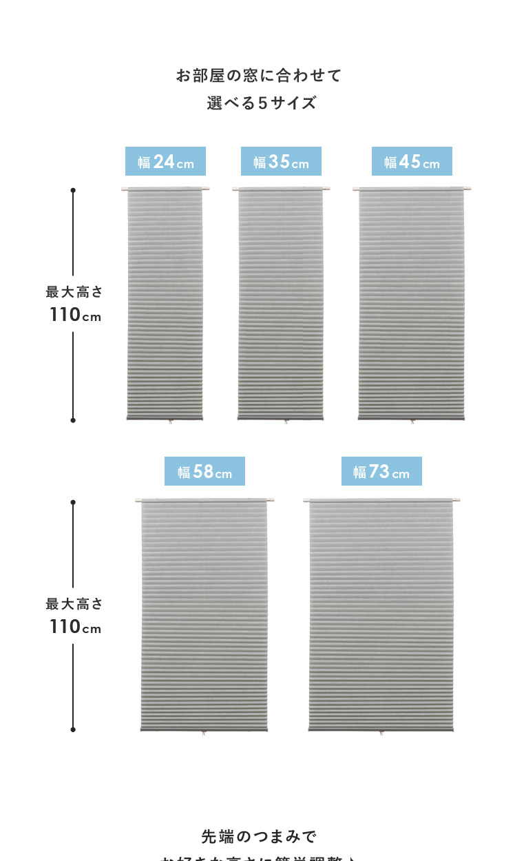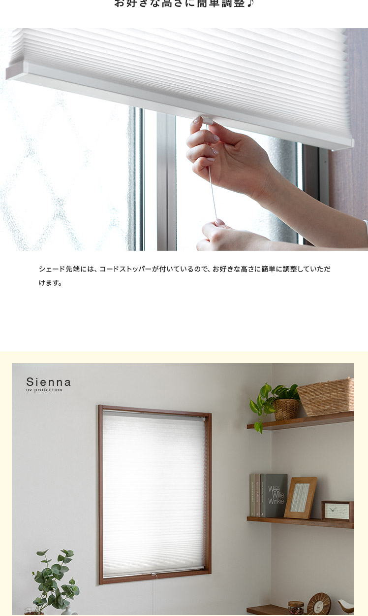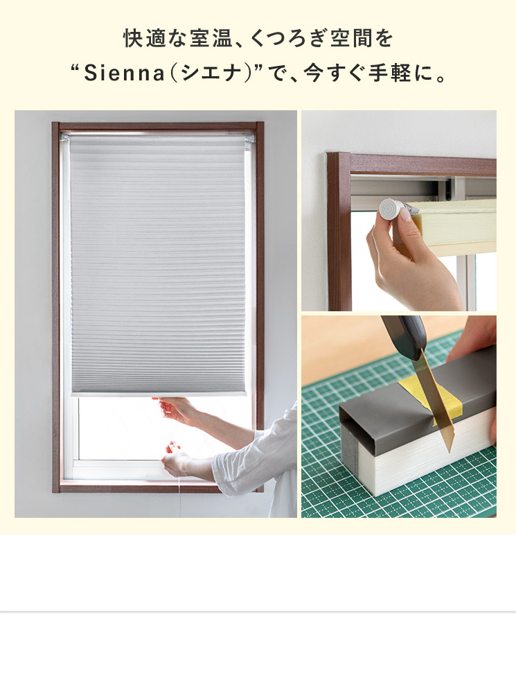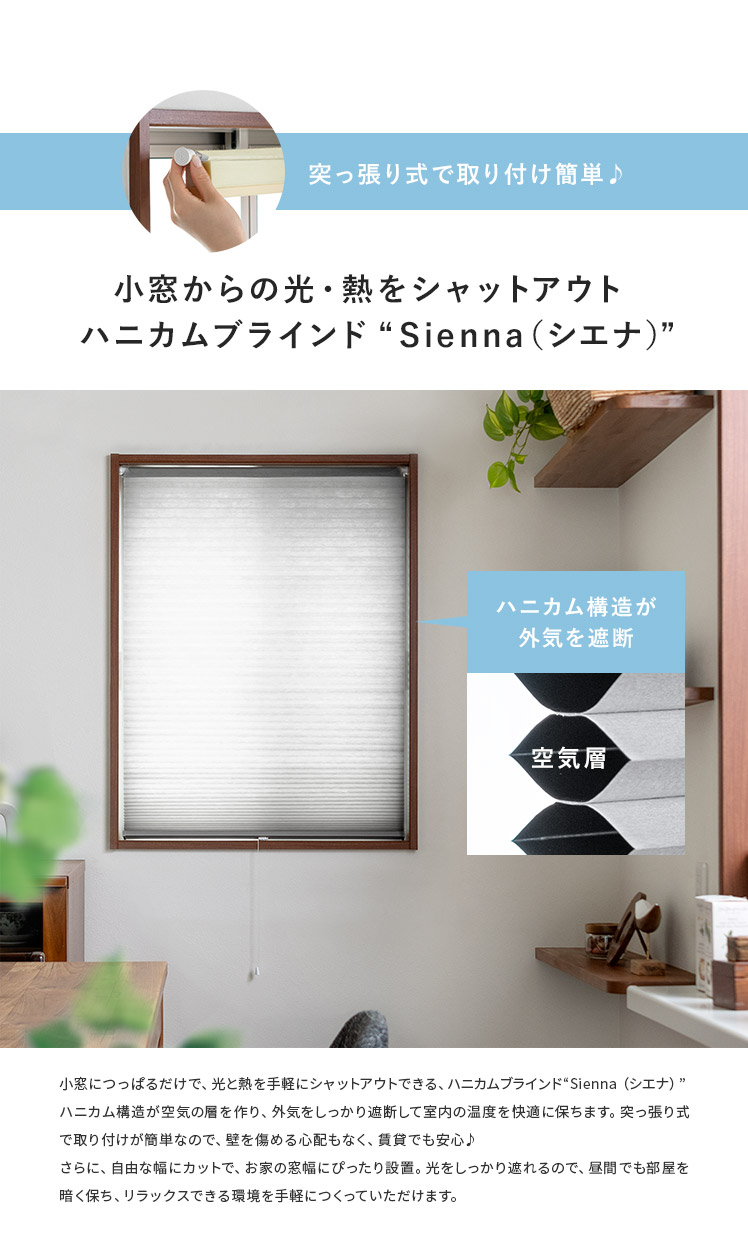フリーカットハニカムブラインド Sienna〔シエナ〕 採光タイプ 24×110cm/小窓につっぱるだけで、光と熱を手軽にシャットアウトできる、ハニカムブラインド“Sienna(シエナ)” ハニカム構造が空気の層を作り、外気をしっかり遮断して室内の温度を快適に保ちます。突っ張り式で取り付けが簡単なので、壁を傷める心配もなく、賃貸でも安心♪さらに、自由な幅にカットで、お家の窓幅にぴったり設置。光をしっかり遮れるので、昼間でも部屋を暗く保ち、リラックスできる環境を手軽につくっていただけます。