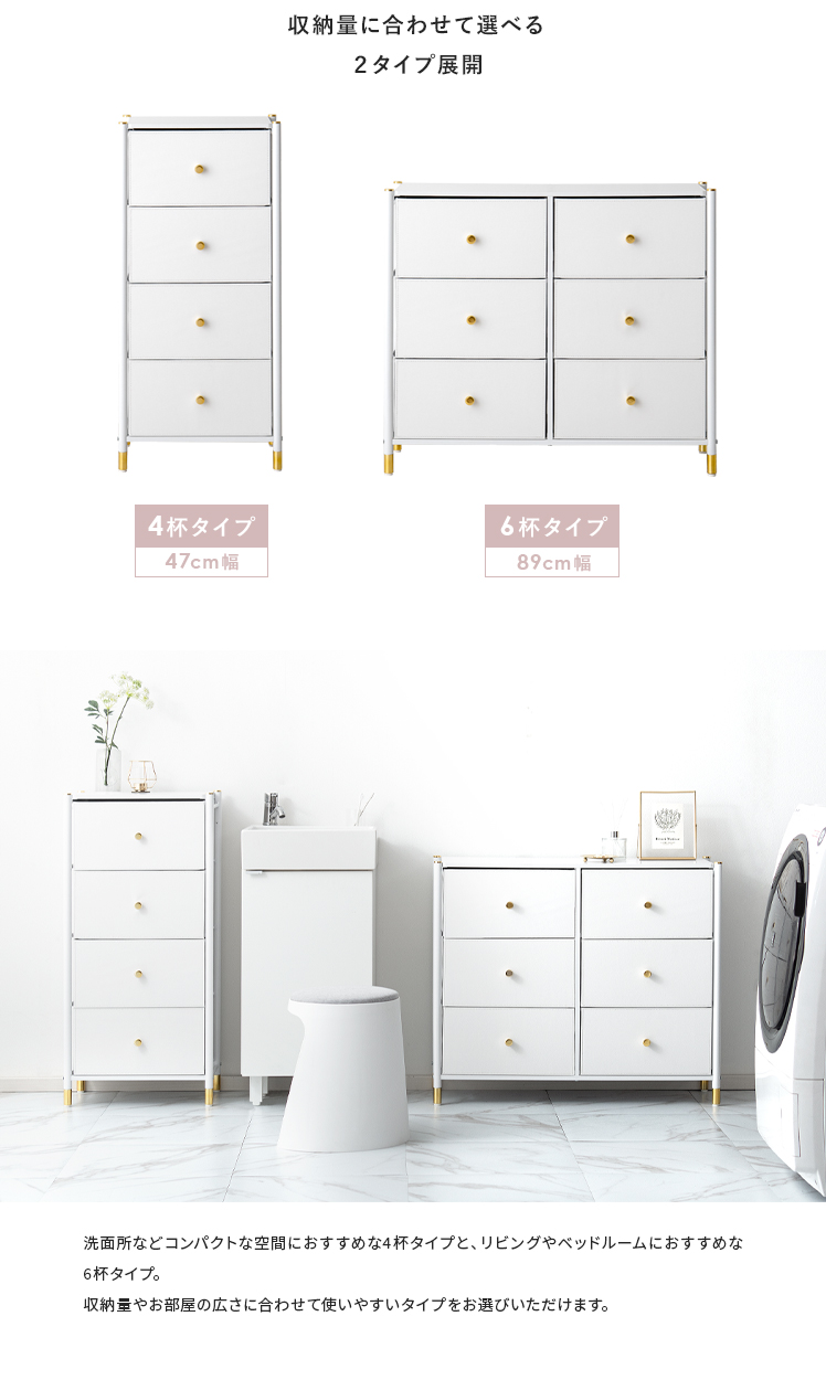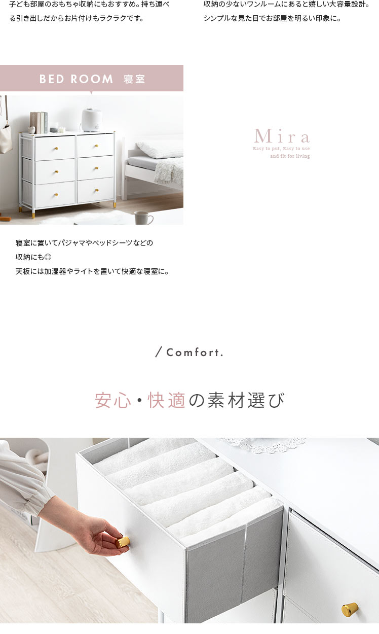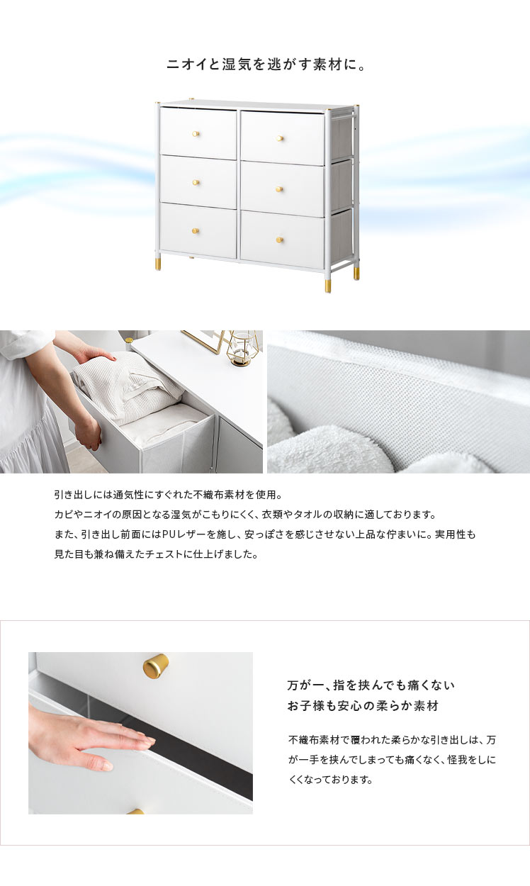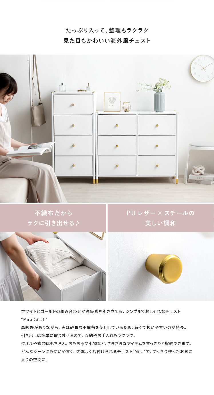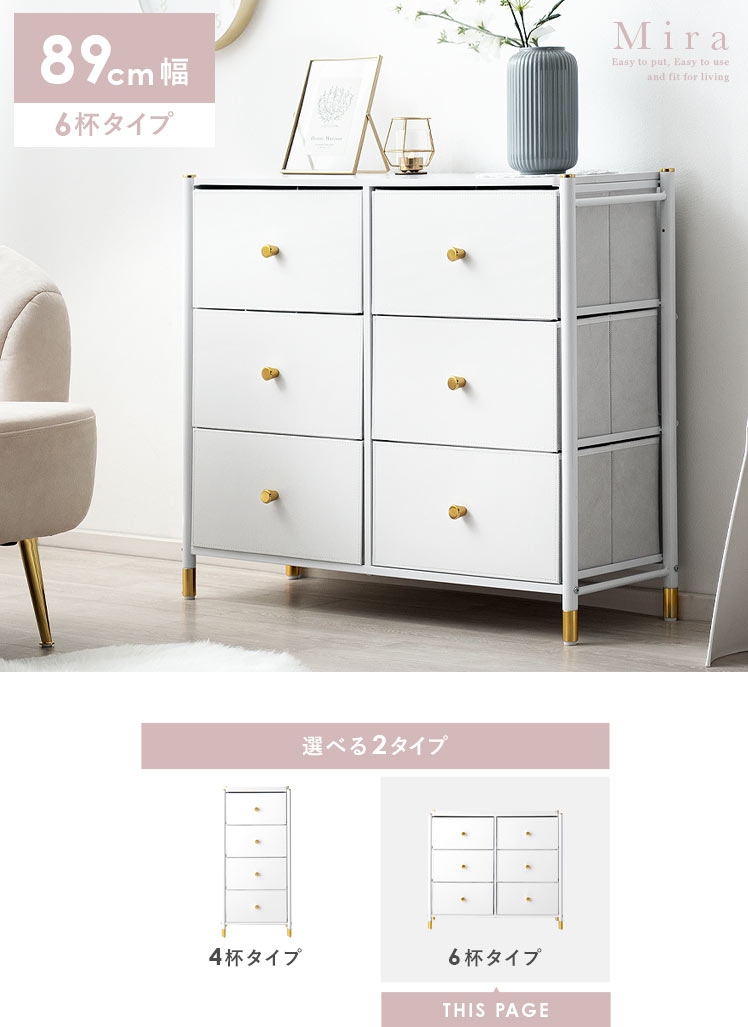 マルチチェスト Mira〔ミラ〕 6杯タイプ/ホワイトとゴールドの組み合わせが高級感を引き立てる、シンプルでおしゃれなチェスト“Mira(ミラ)”高級感がありながら、実は軽量な不織布を使用しているため、軽くて扱いやすいのが特長。引き出しは簡単に取り外せるので、収納やお手入れもラクラク。タオルや衣類はもちろん、おもちゃや小物など、さまざまなアイテムをすっきりと収納できます。どんなシーンにも使いやすく、効率よく片付けられるチェスト“Mira”で、すっきり整ったお気に入りの空間に。
