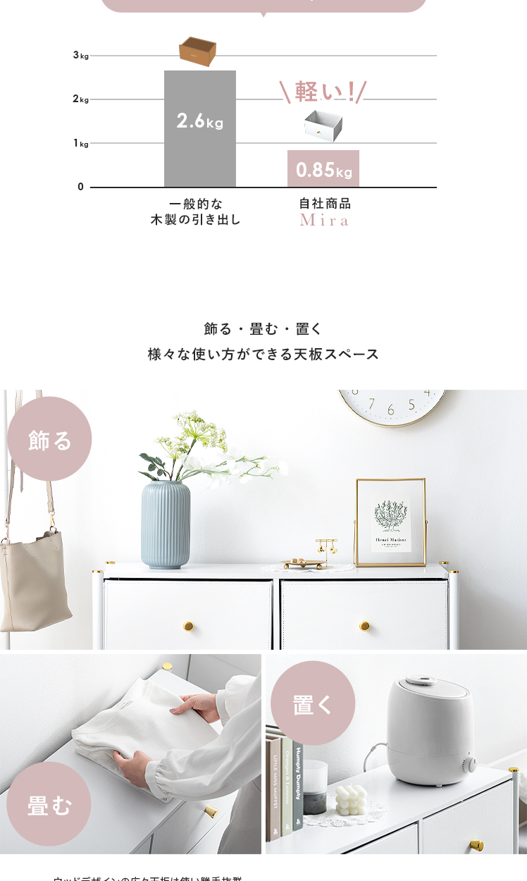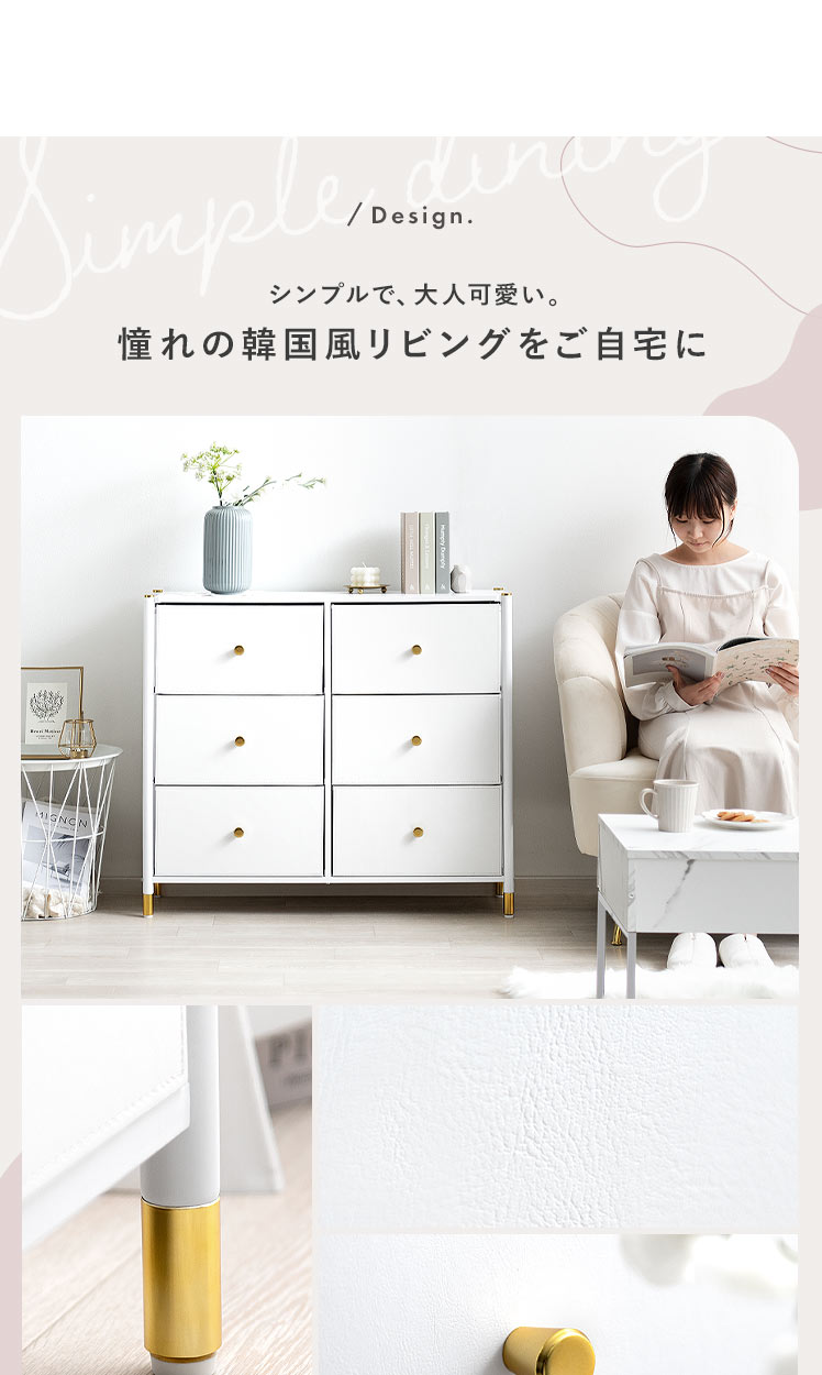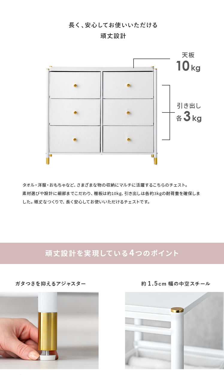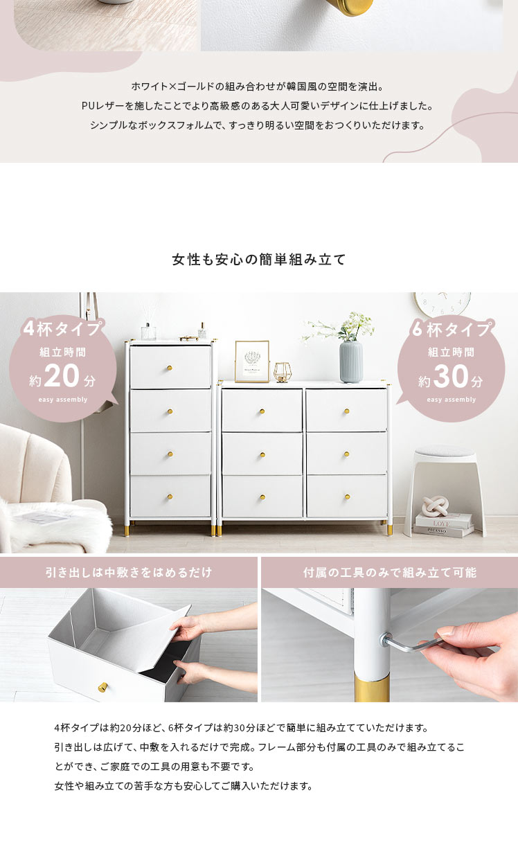 マルチチェスト Mira〔ミラ〕 6杯タイプ/ホワイトとゴールドの組み合わせが高級感を引き立てる、シンプルでおしゃれなチェスト“Mira(ミラ)”高級感がありながら、実は軽量な不織布を使用しているため、軽くて扱いやすいのが特長。引き出しは簡単に取り外せるので、収納やお手入れもラクラク。タオルや衣類はもちろん、おもちゃや小物など、さまざまなアイテムをすっきりと収納できます。どんなシーンにも使いやすく、効率よく片付けられるチェスト“Mira”で、すっきり整ったお気に入りの空間に。