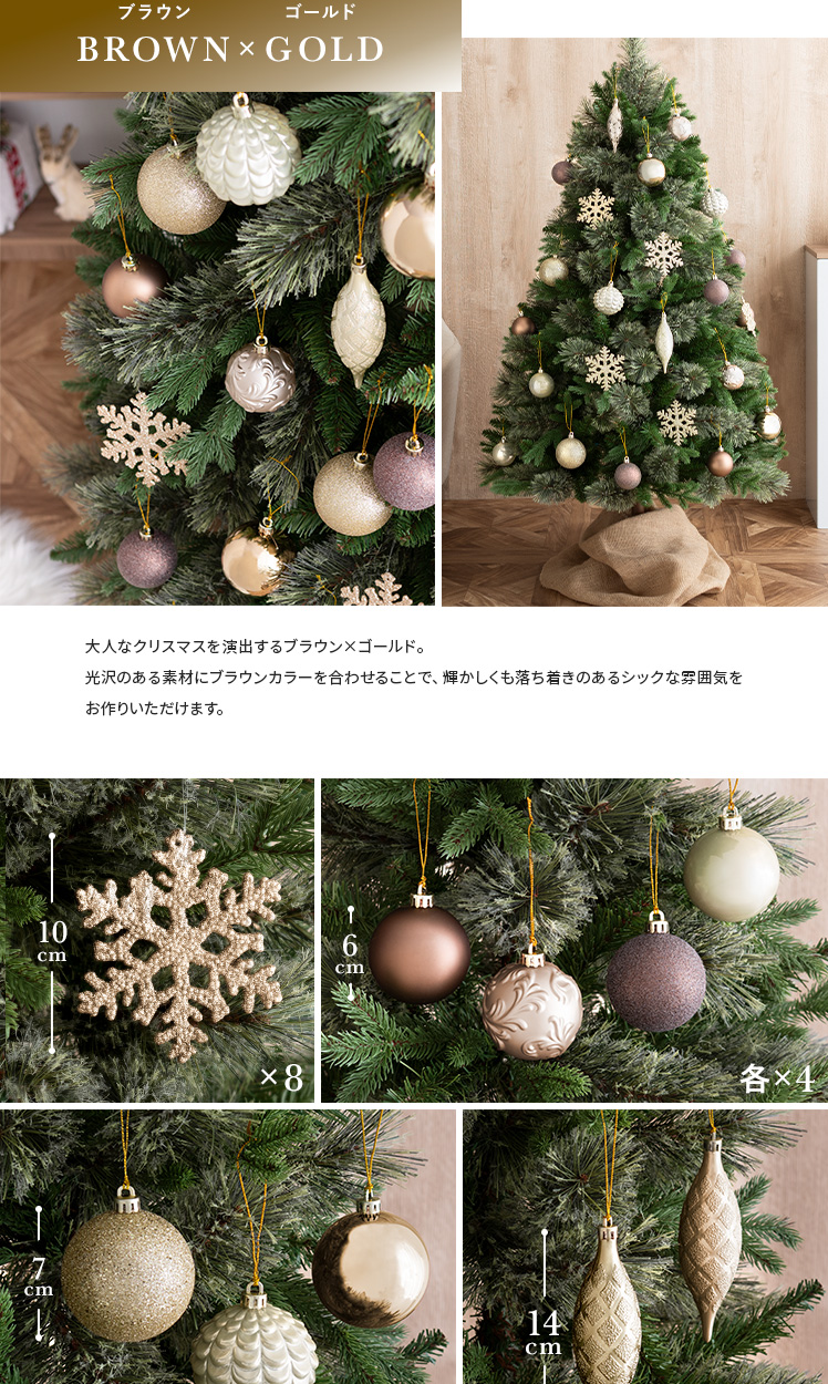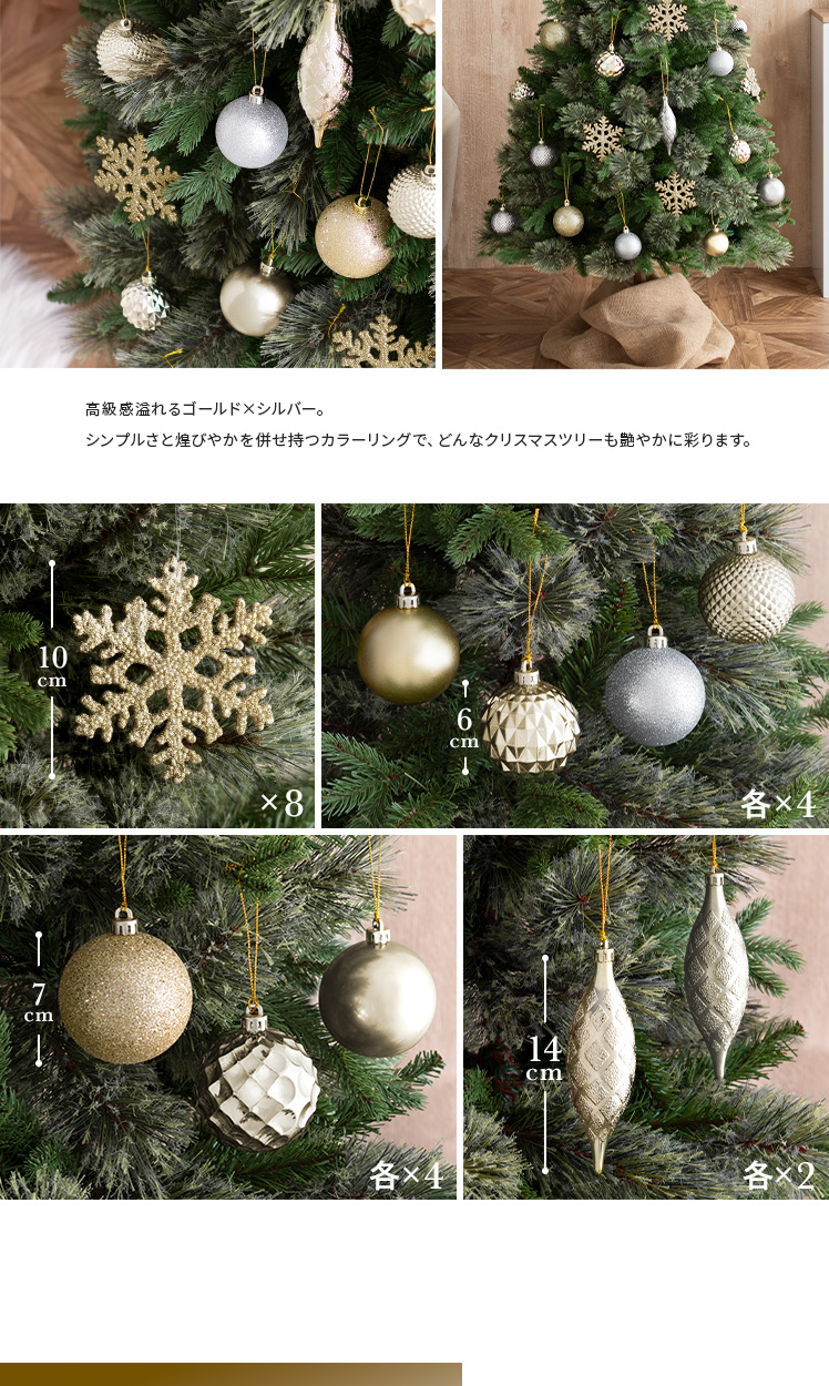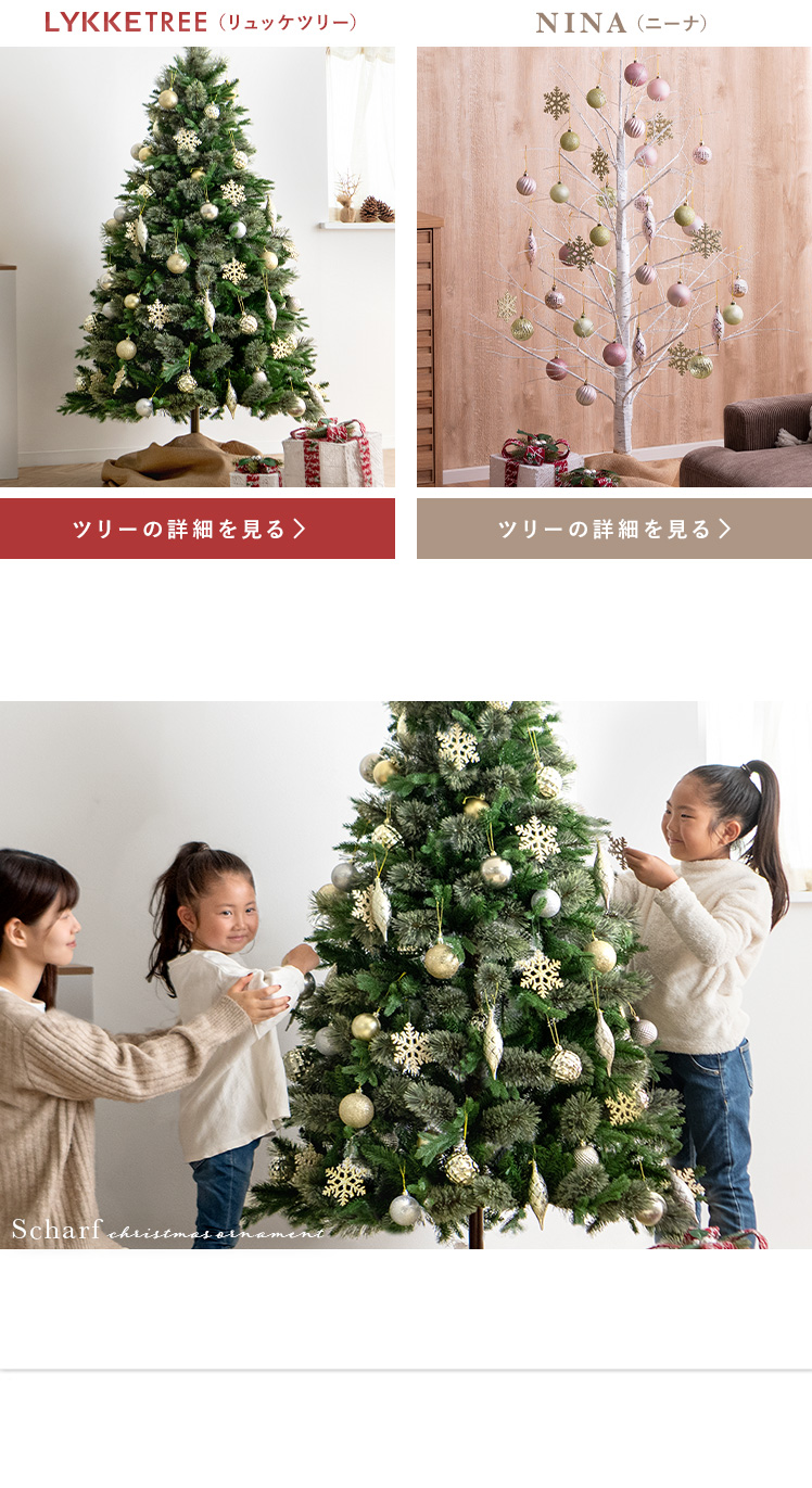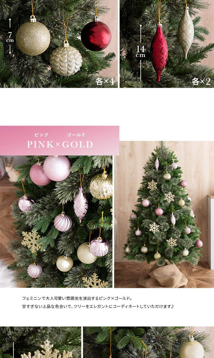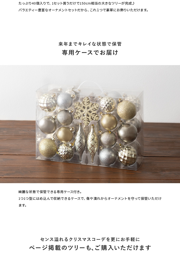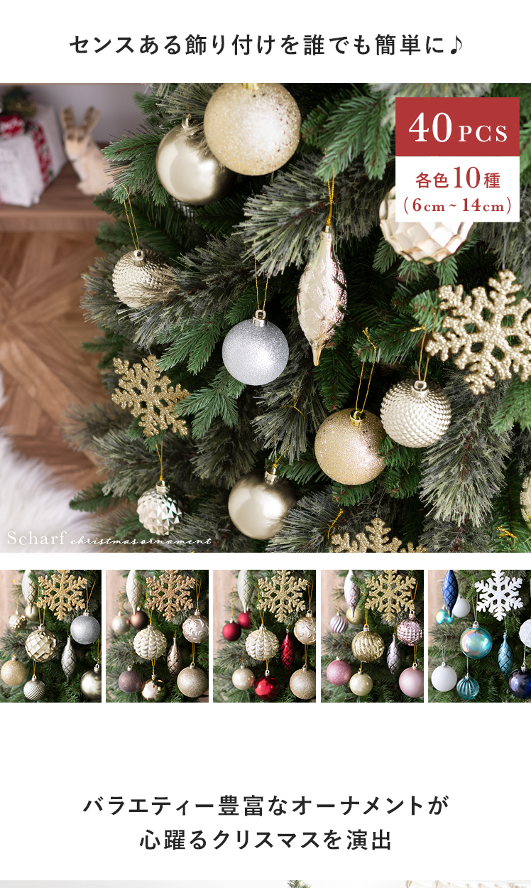 クリスマスオーナメント Scharf〔シャルフ〕40個入/誰でも簡単にセンスある飾り付けができるオーナメント“Scharf(シャルフ)”バラエティー豊富で高級感溢れるデザインが、本格的なクリスマスツリーを演出します。1セットで「10種類※合計40個」入りの大容量で、1つ買うだけで150cm相当のツリーが完成♪煌びやかなオーナメントを飾って、年に一度の特別な一時をステキな1日に。※「ピンク×ゴールド」のみ9種類となっております。