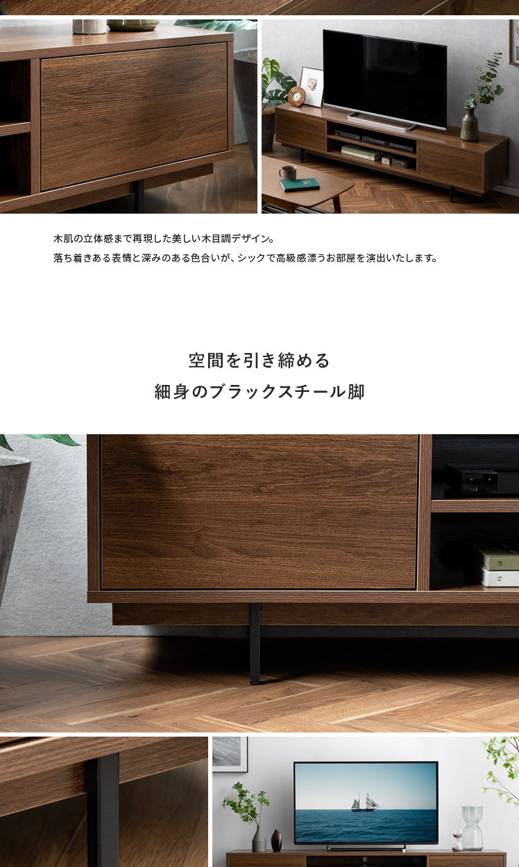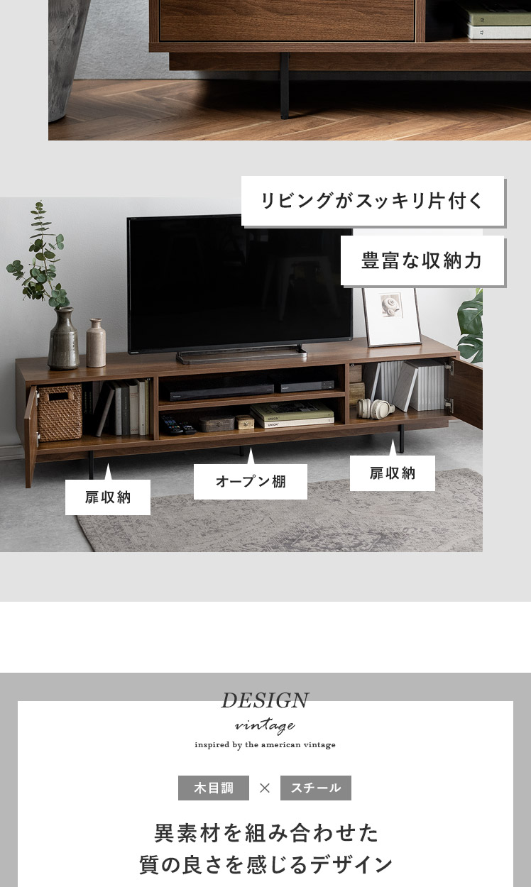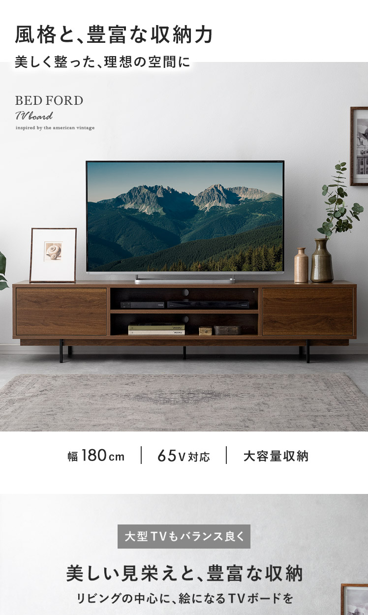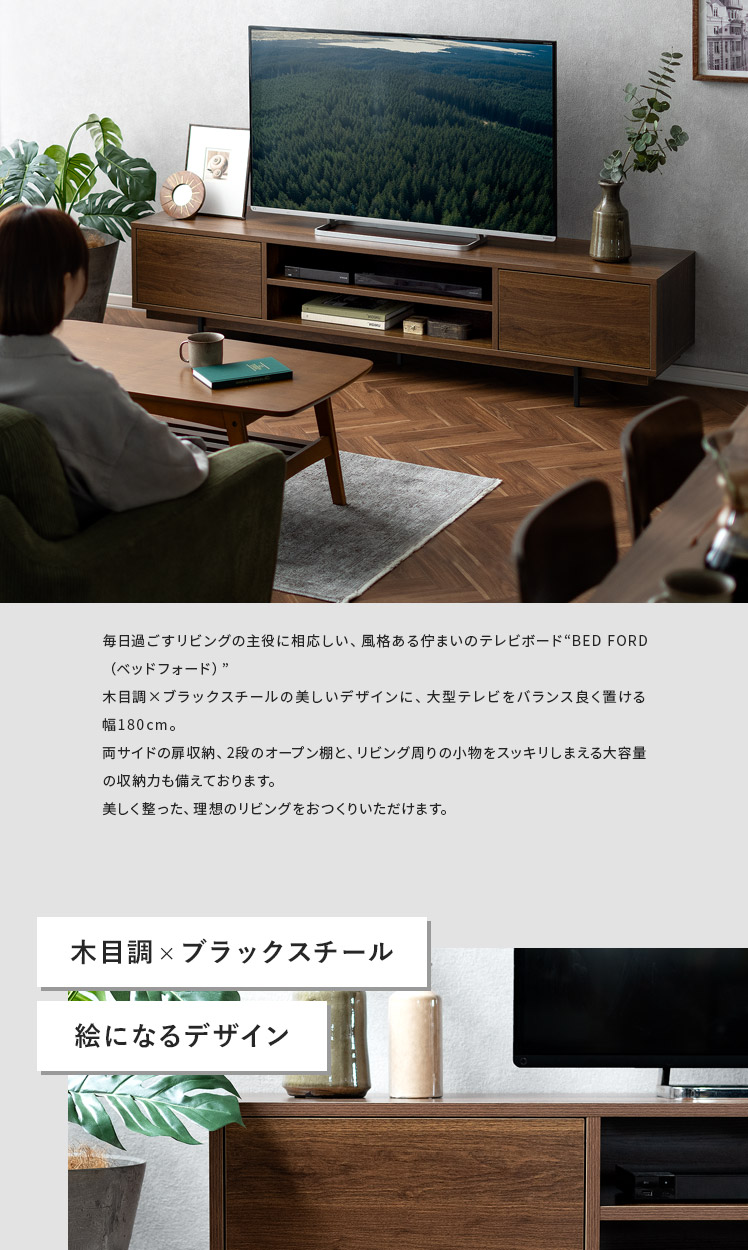 BED FORD TVboard〔ベッドフォード テレビボード〕180cm幅/毎日過ごすリビングの主役に相応しい、風格ある佇まいのテレビボード“BEDFORD(ベッドフォード)”木目調×ブラックスチールの美しいデザインに、大型テレビをバランス良く置ける幅180cm。両サイドの扉収納、2段のオープン棚と、リビング周りの小物をスッキリしまえる大容量の収納力も備えております。美しく整った、理想のリビングをおつくりいただけます。
