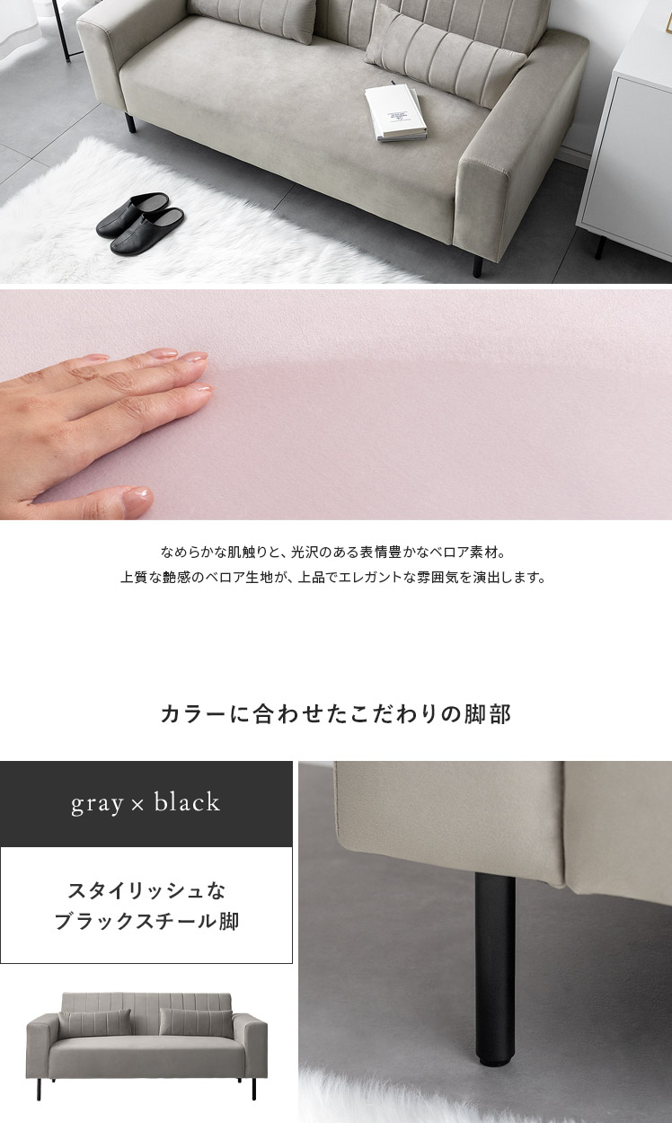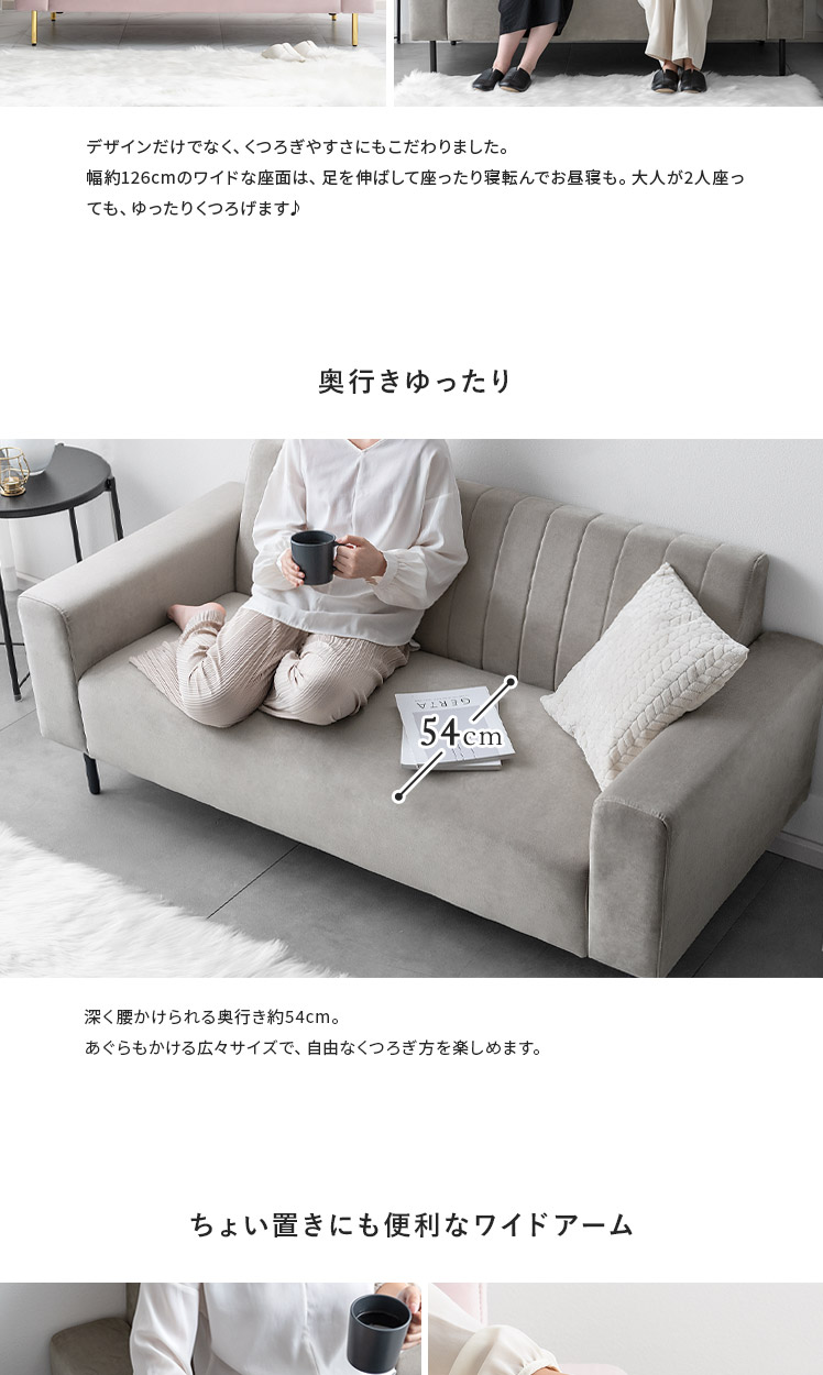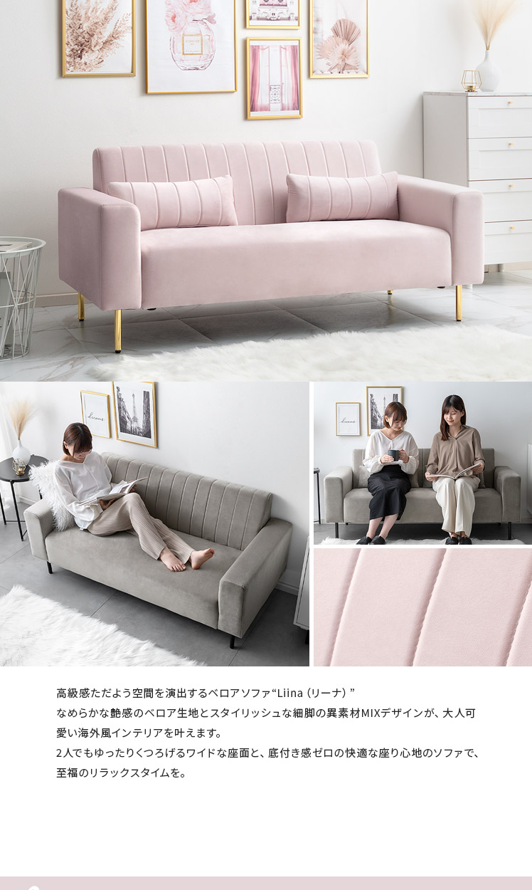 2Pベロアソファ Liina〔リーナ〕/高級感ただよう空間を演出するベロアソファ“Liina(リーナ)”なめらかな艶感のベロア生地とスタイリッシュな細脚の異素材MIXデザインが、大人可愛い海外風インテリアを叶えます。2人でもゆったりくつろげるワイドな座面と、底付き感ゼロの快適な座り心地のソファで、至福のリラックスタイムを。