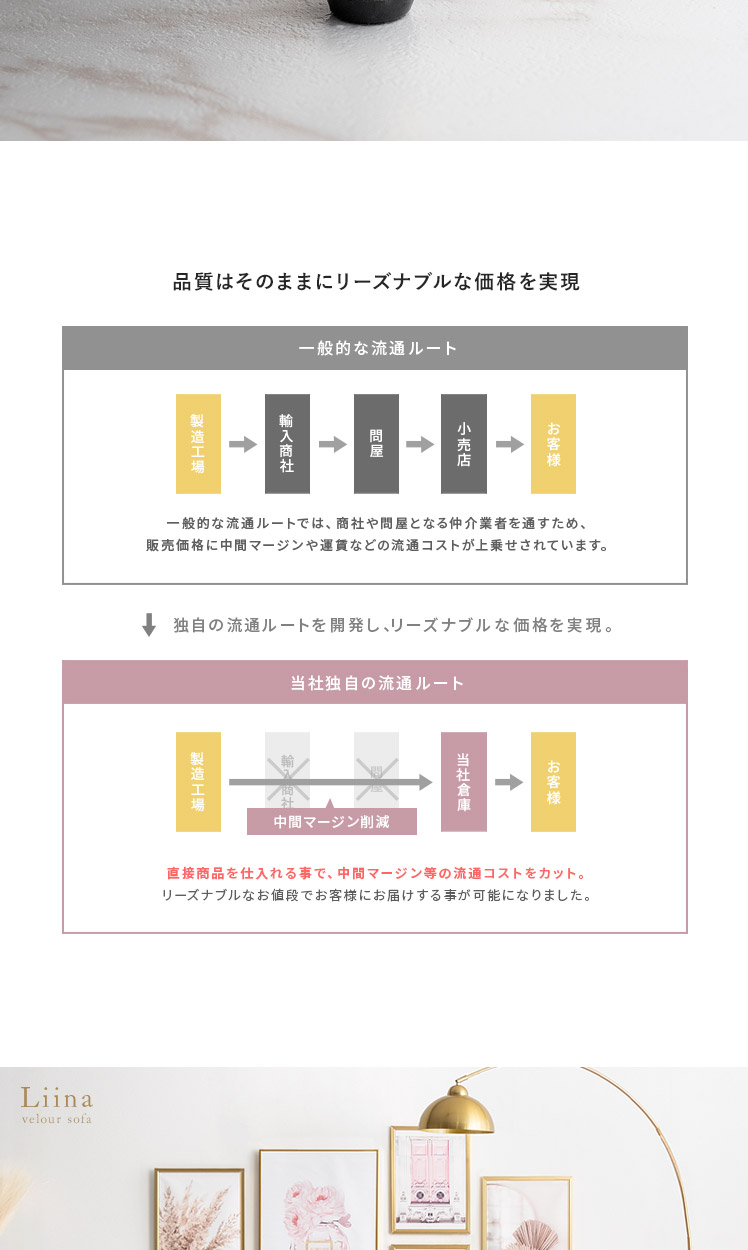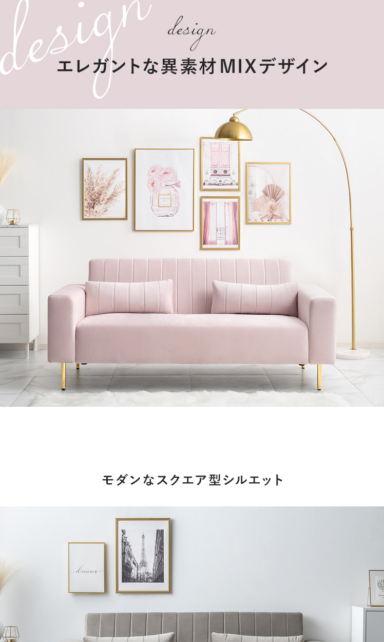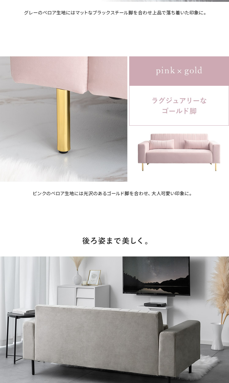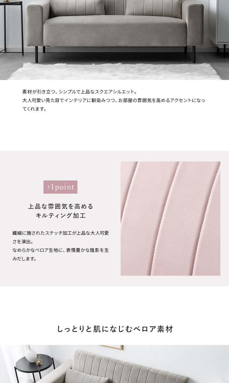 2Pベロアソファ Liina〔リーナ〕/高級感ただよう空間を演出するベロアソファ“Liina(リーナ)”なめらかな艶感のベロア生地とスタイリッシュな細脚の異素材MIXデザインが、大人可愛い海外風インテリアを叶えます。2人でもゆったりくつろげるワイドな座面と、底付き感ゼロの快適な座り心地のソファで、至福のリラックスタイムを。