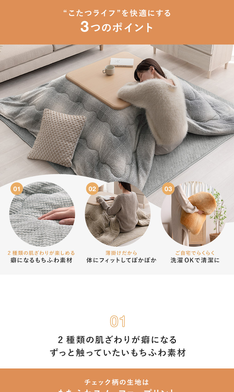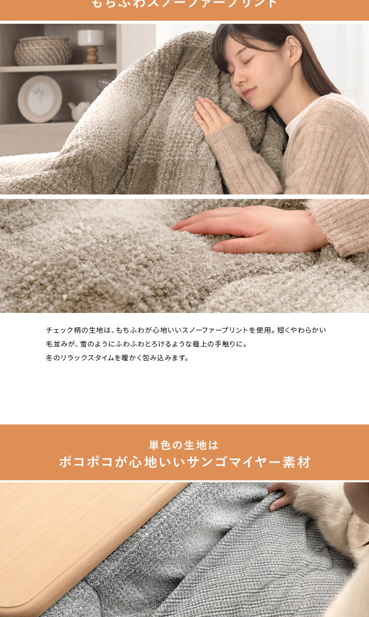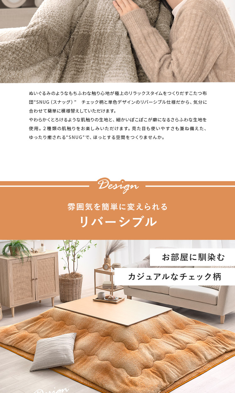 薄掛けこたつ布団 Snug〔スナッグ〕190×190cm 正方形/ぬいぐるみのようなもちふわな触り心地が極上のリラックスタイムをつくりだすこたつ布団“SNUG(スナッグ)” チェック柄と単色デザインのリバーシブル仕様だから、気分に合わせて簡単に模様替えしていただけます。やわらかくとろけるような肌触りの生地と、細かいぽこぽこが癖になるさらふわな生地を使用。2種類の肌触りをお楽しみいただけます。見た目も使いやすさも兼ね備えた、ゆったり癒される“SNUG”で、ほっとする空間をつくりませんか。